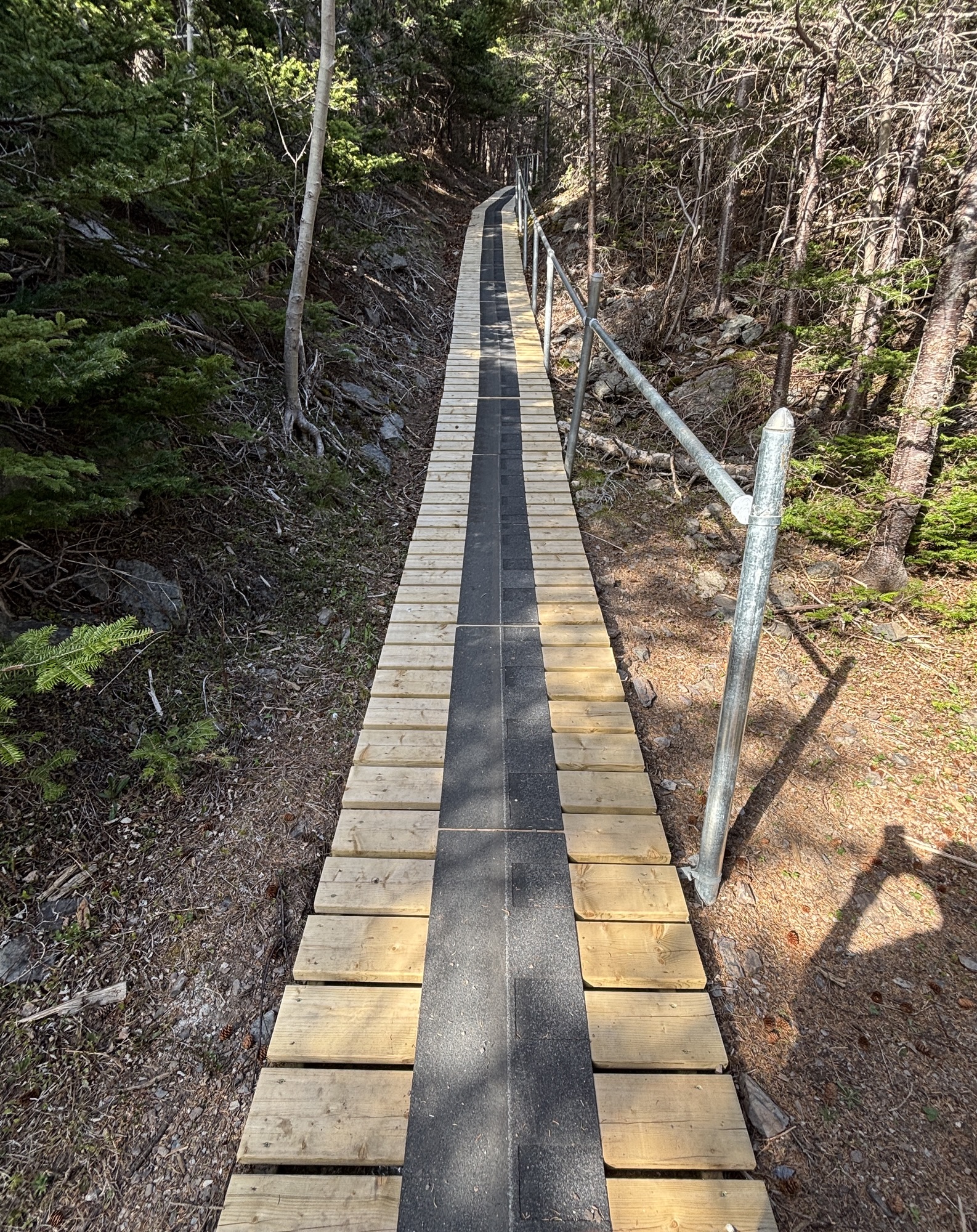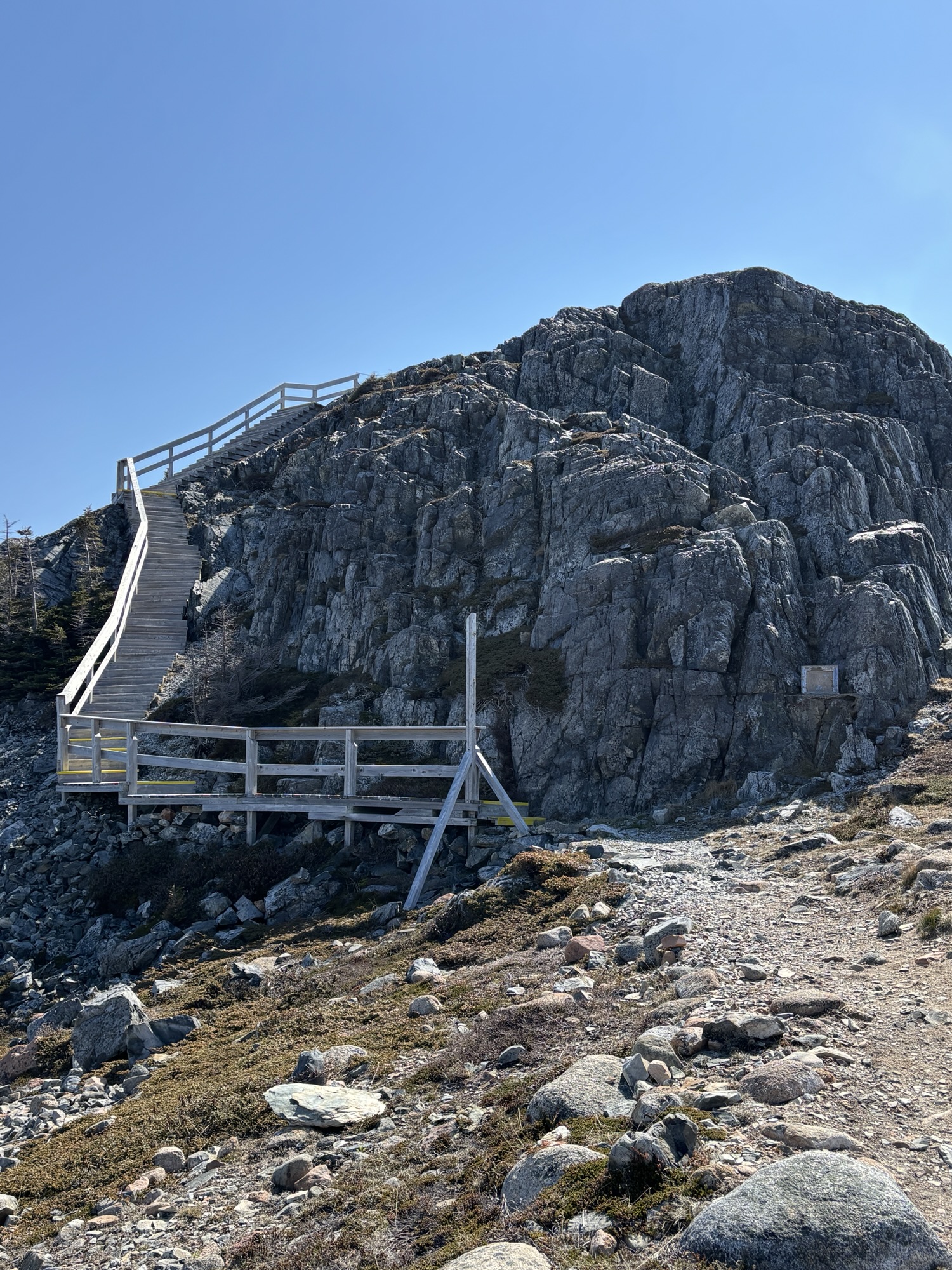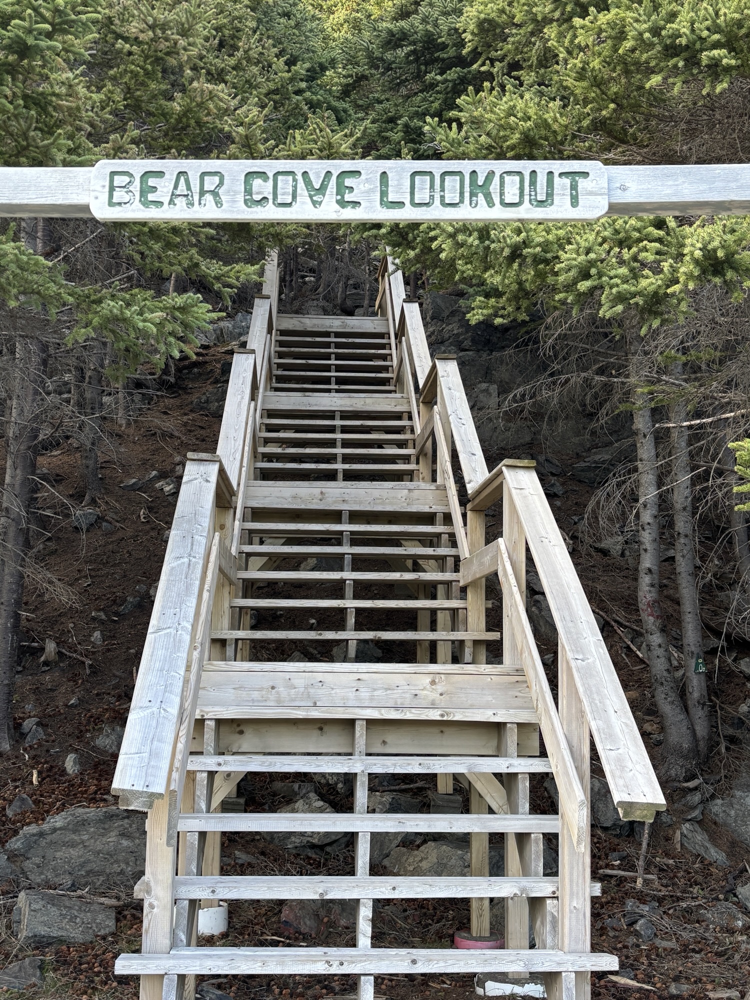 Next, we managed a short and almost vertical hike in the RV park up to the Bear Head Lookout for a beautiful view of Notre Dame Bay looking north. There was a wooden platform at the top to view the ocean. Great end to a nice day.