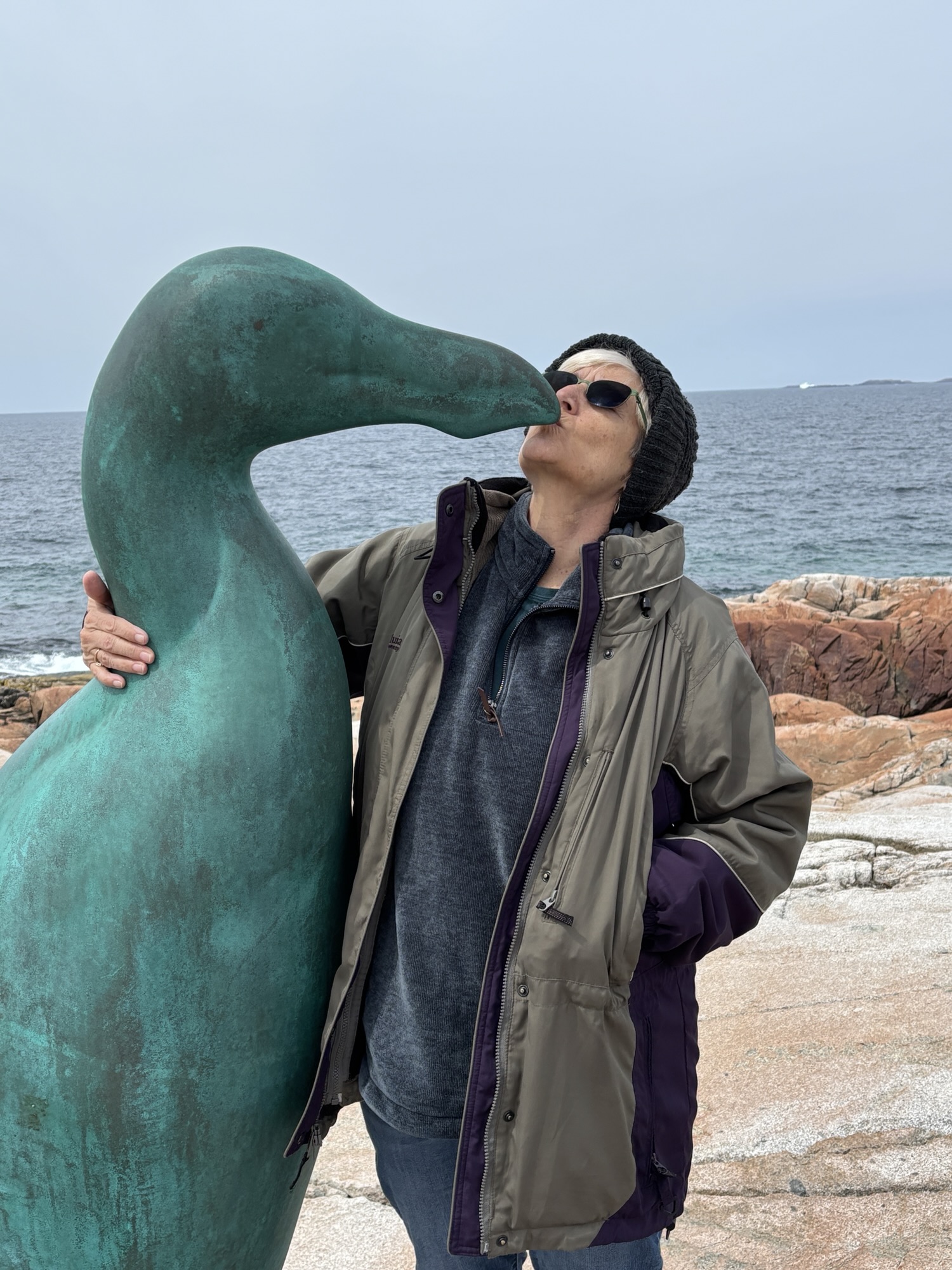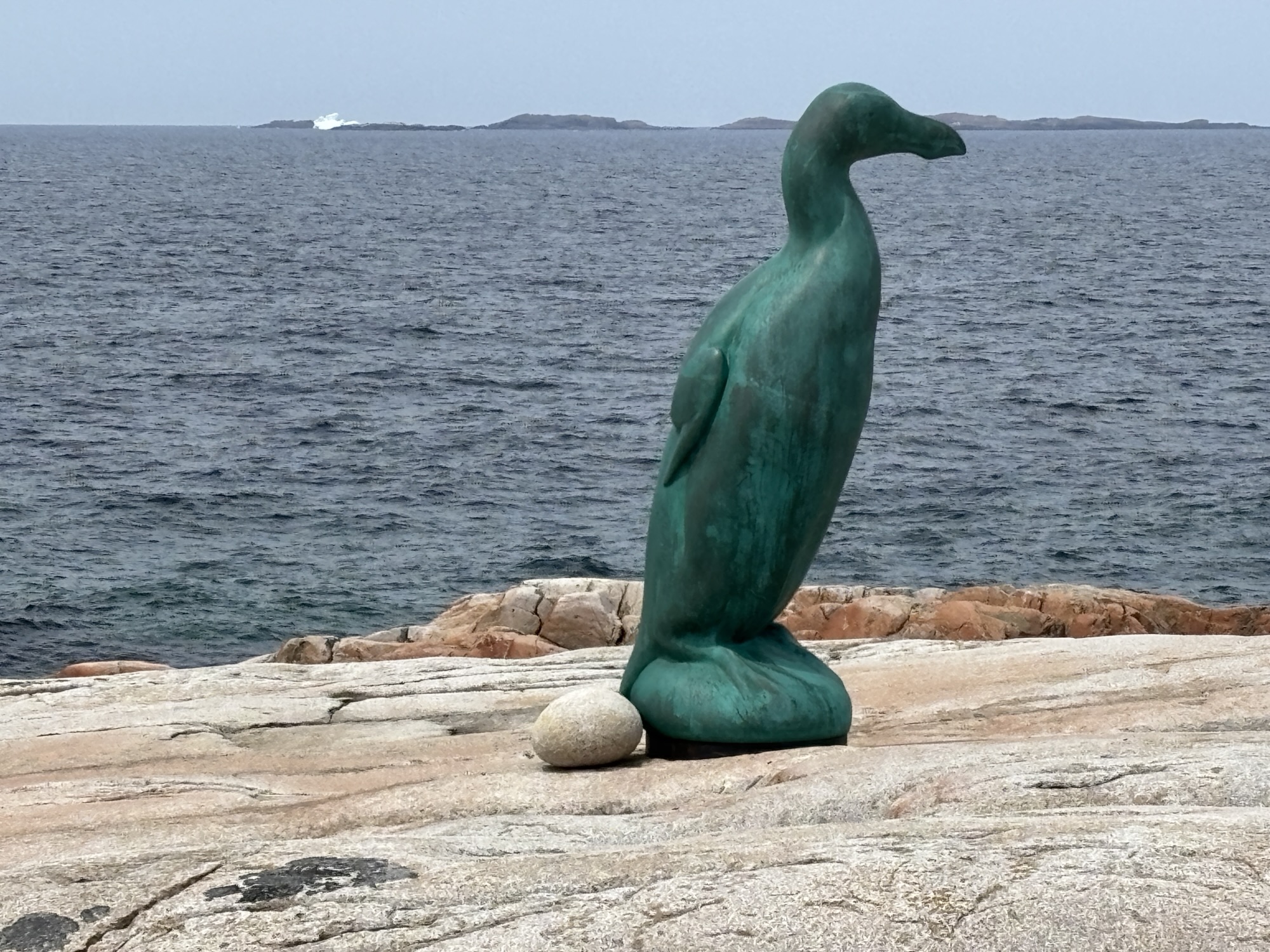 We explored around the town in Tilting and then decided to do the Great Auk Walk back in Joe Batt’s Arm. It is a 4-mile round trip hike out to the end of Joe Batt’s Point where an artist had placed a bronze statue of a Great Auk and had it facing east to a counterpart in Ireland. The trail started at the town park and passed close to one of the new art co-op houses on the island. Again, the hike was challenging but the view at the end was amazing, and the statue was great!