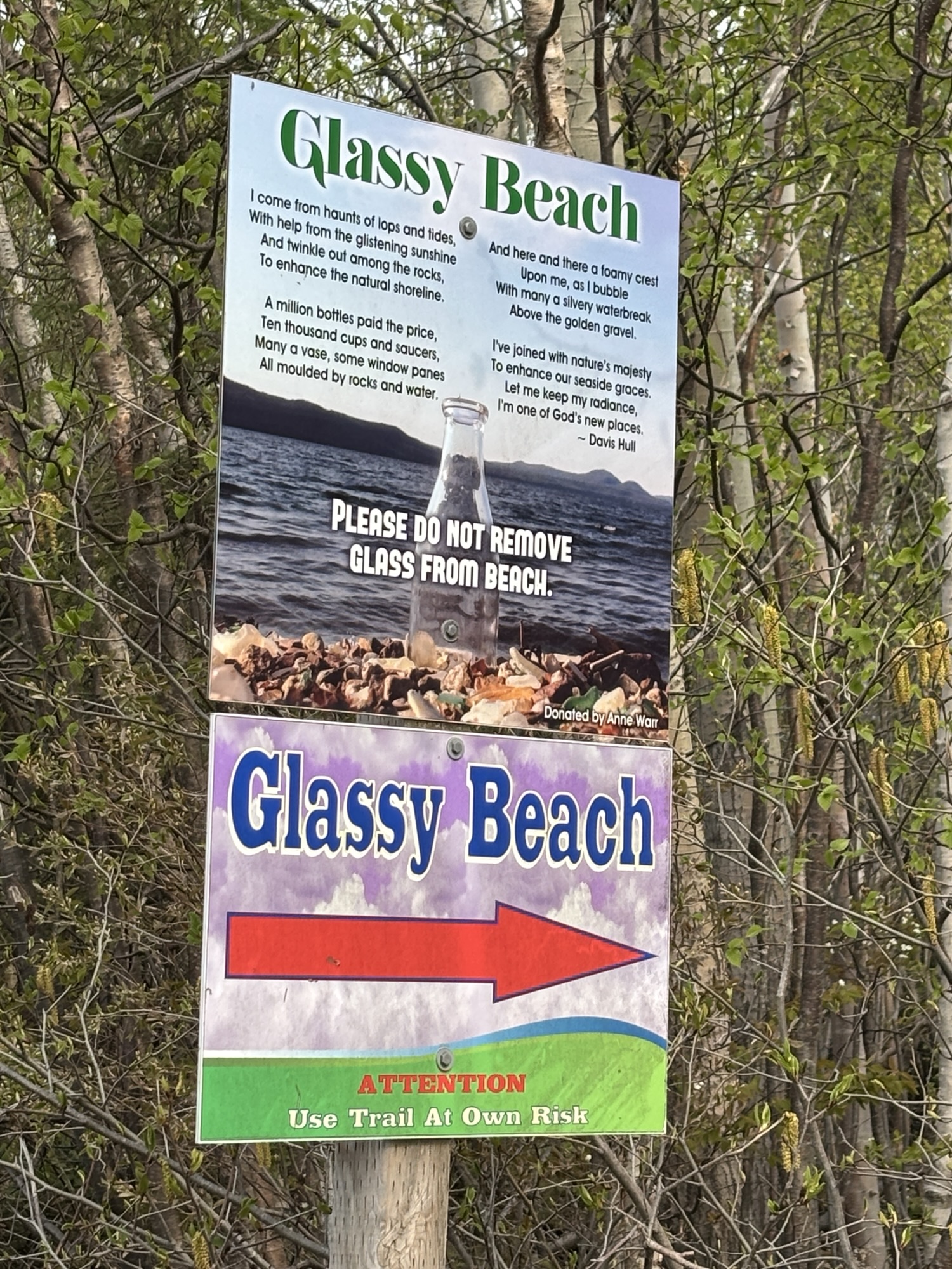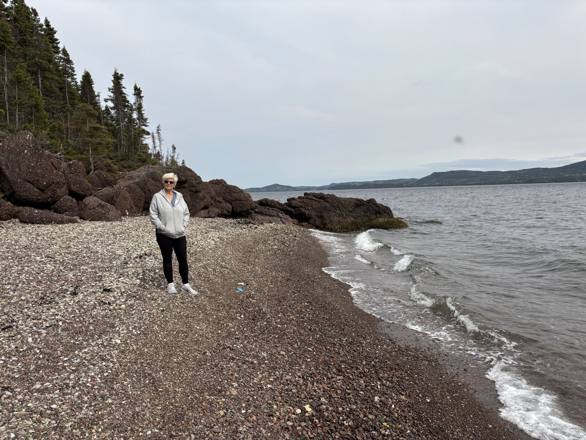 Glassy Beach is a small, rocky “beach” near Springdale that used to be a dump site. It was eventually closed and cleaned up, but all the broken glass was left behind. People kept bringing more bottles to the site to add to the shards! Hence the name.