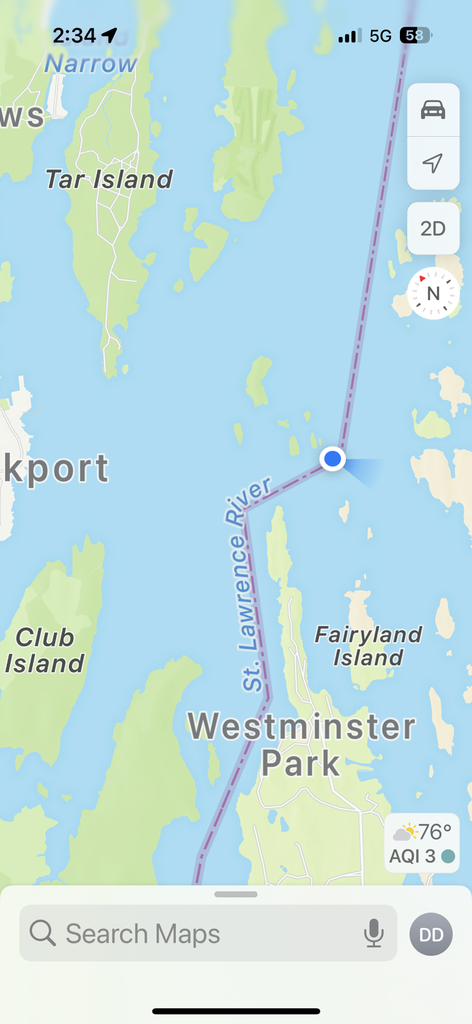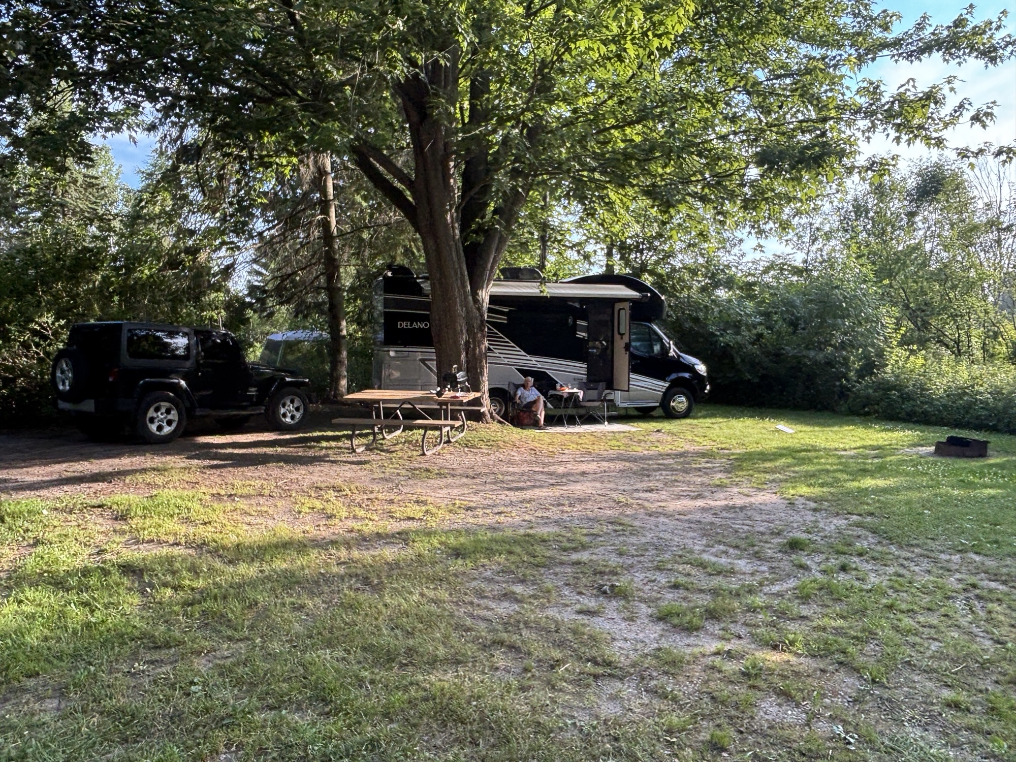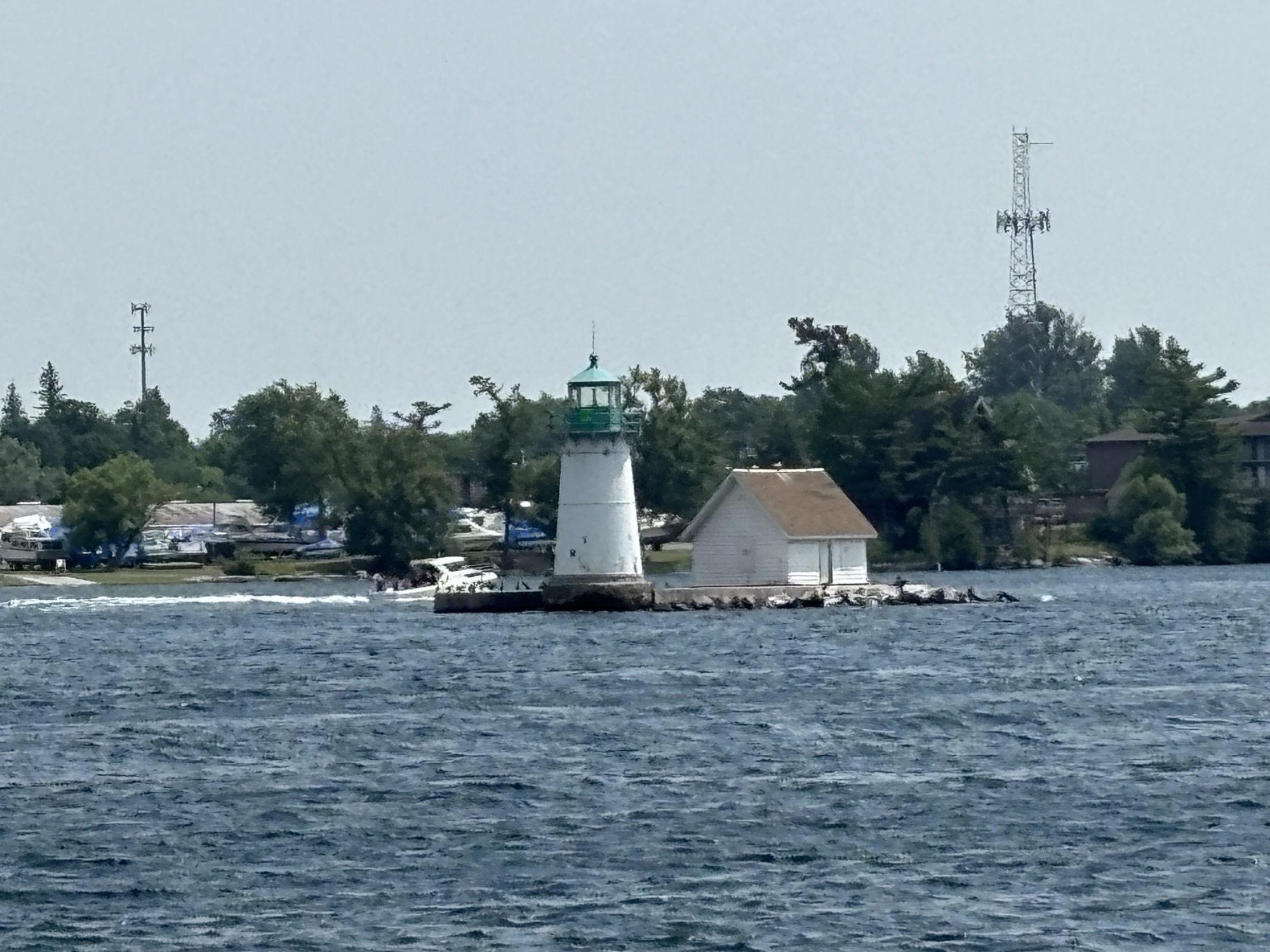 First, we headed out of Ottawa and onto the main Hwy 416 south to the St. Lawrence. As it turned more west, it turned into Hwy 401 which we will see again as well. We got off and onto the Thousand Islands Parkway along the north shore of the Seaway. The drive was very nice. Our destination was a KOA park on the St. Lawrence called, as you might expect, 1000 Islands KOA. The park was nice and had full hookups!