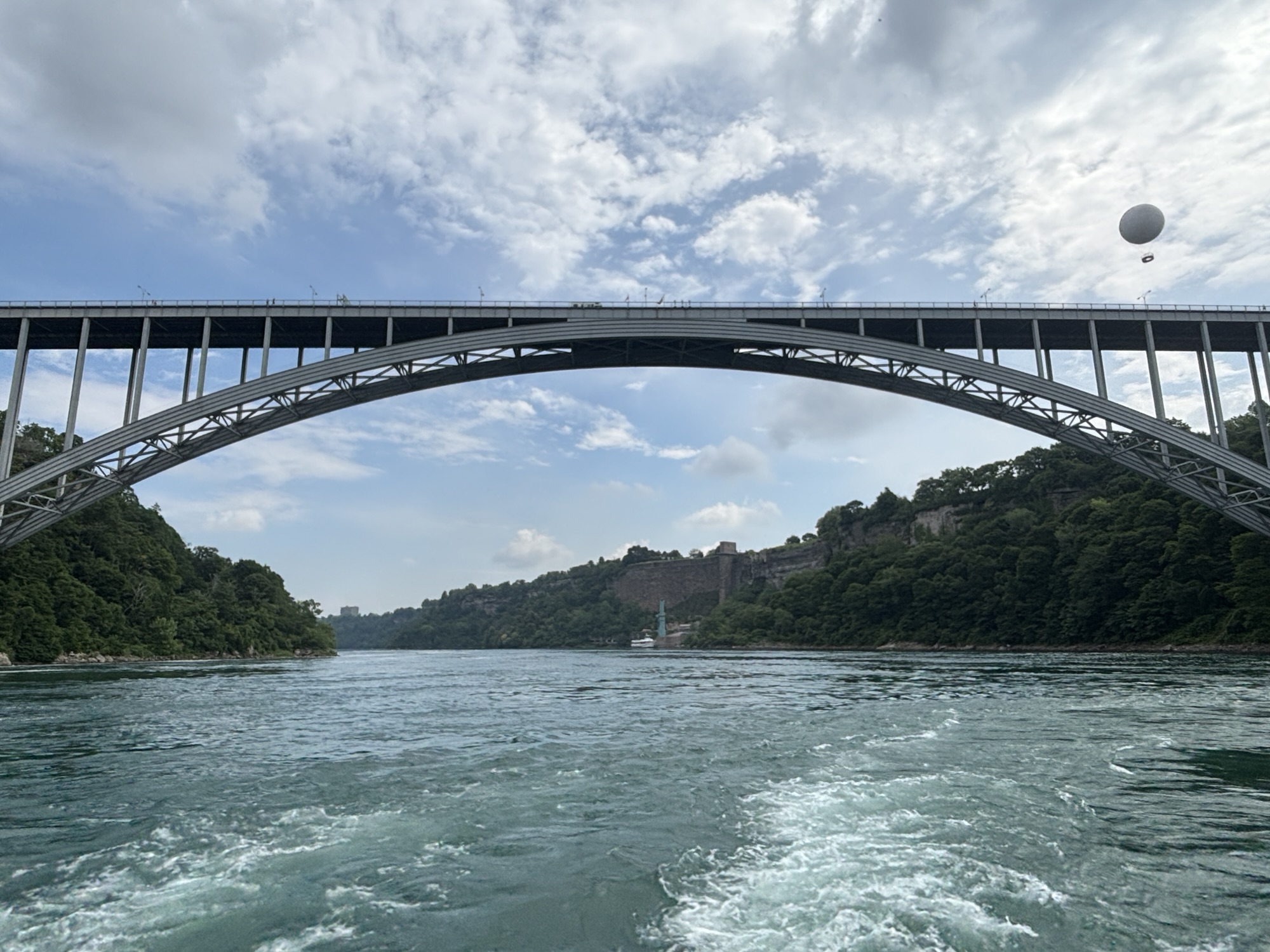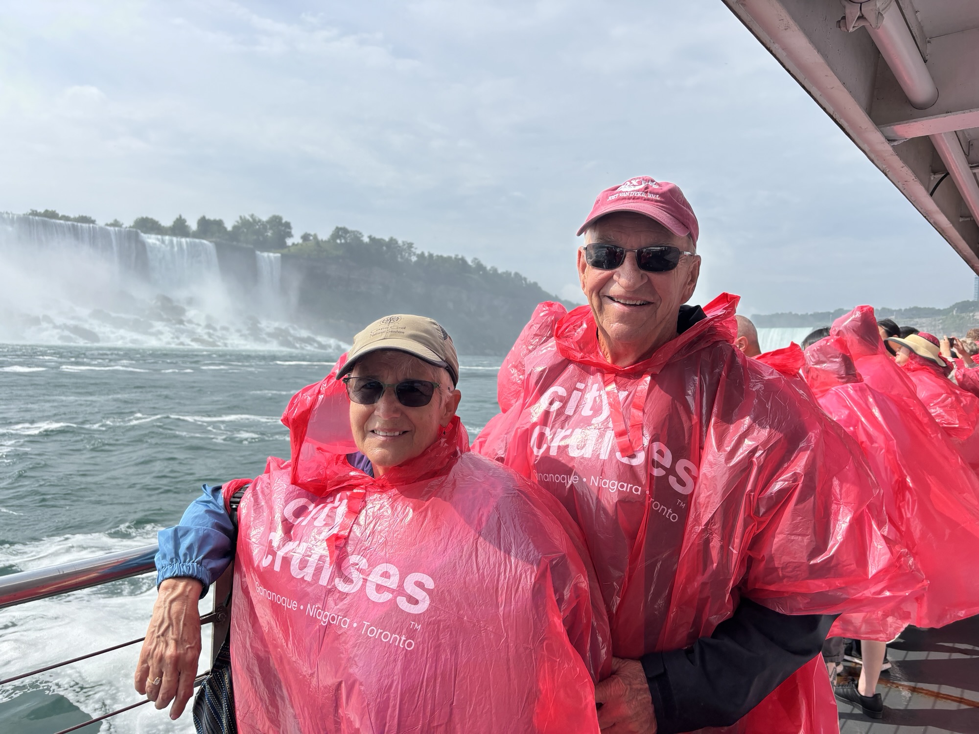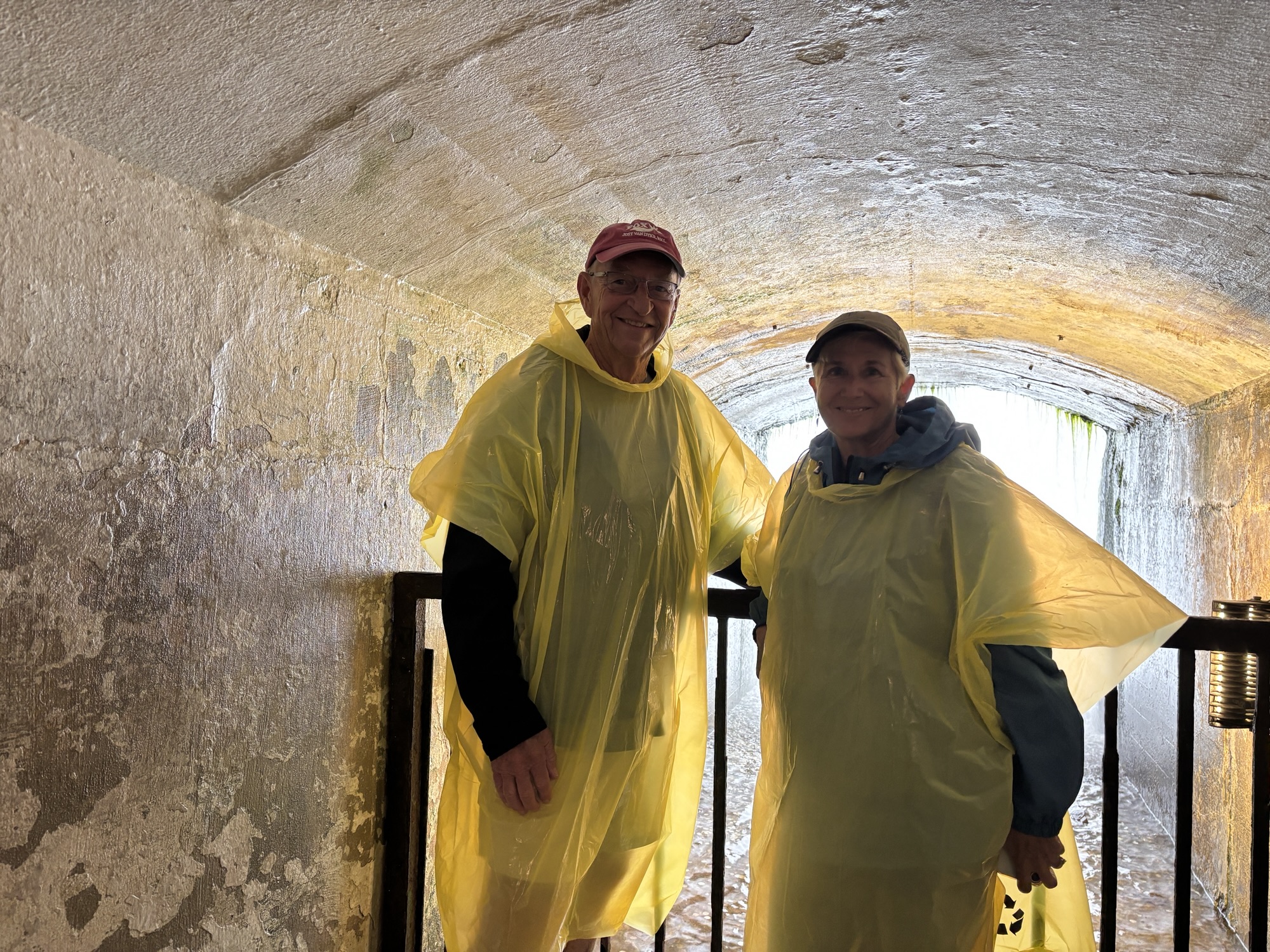 We had both been there years ago but had only viewed the falls. Gail was on the US side and I had been on the Canadian side. So, we had purchased the Canadian tour of the falls by boat like the famous Maid of the Mist ride from the US. It is only a 20-minute ride out and back and it’s wet!! The boat goes right up to the falls, and the wind picks up a lot from the motion of the falls. So, the spray, mist and actual water get blown on you. The tour company provides you with a “reusable, recyclable poncho” (red for the Canadian boats and blue for the US boats. We had added our own rain jackets and seemed prepared. But we still got wet, which is part of the adventure. Fortunately, we didn’t go to the top deck, so we stayed a little dryer. But it’s an amazing site no less!