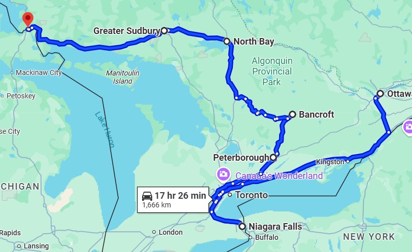 To Toronto and beyond!– Our planned trip across Ontario was to be a big Zorro-like “Z”. Well, not quite but definitely not a straight line either. Check out the route. Turns out it will cover almost 1700 miles.