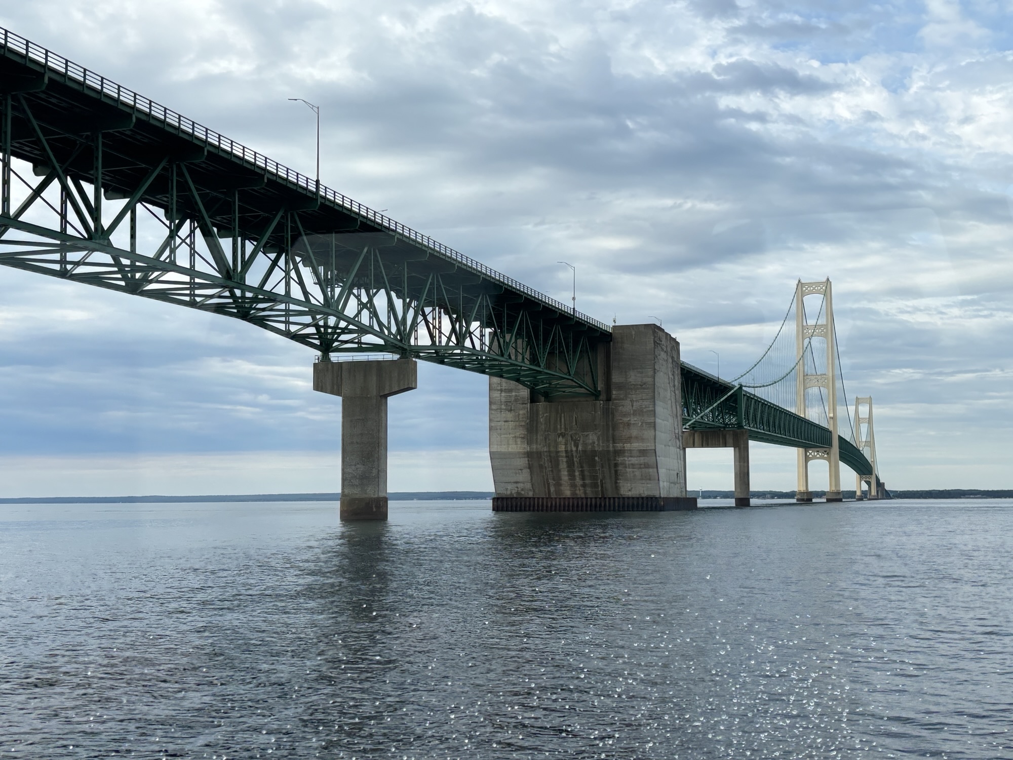The line wasn’t too long and shortly we made it to the window where the US Border Patrol guy looked at our passports, asked where we lived and said, “Welcome home”! That’s it. We and the RV were back in the US. We crossed the bridge and saw the SOO locks and ships below and soon were in Sault Ste Marie, MI. A new state for the RV and the trip! And we were on the north end of Interstate 75 that runs all the way to Miami! Seemed like home!
