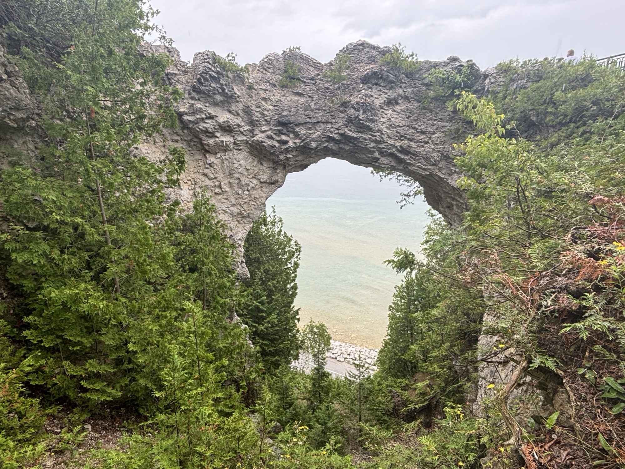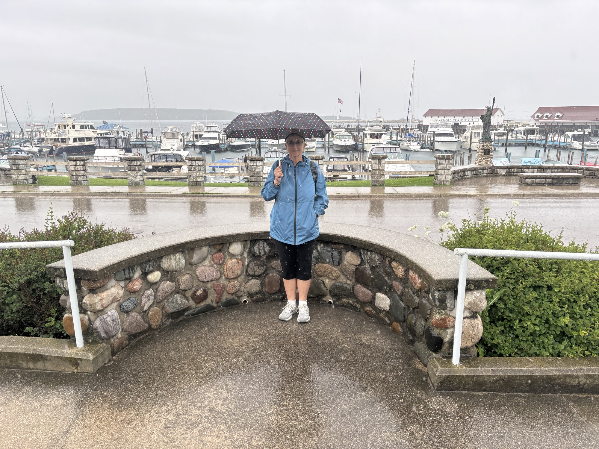 Finally, we got on another larger carriage drawn by 3 horses to take us through the Mackinac Island State Park with a very quick stop (8 minutes) at the Arch Rock. They dropped us at Fort Mackinac where we had a bite to eat looking out over the harbor and walked through some of the buildings. Then we headed back down to the main street. By now the streets were getting crowded as more people arrived, including those from a small cruise ship in the harbor. And it had started to rain heavily. We had come prepared with rain jackets and umbrellas.
