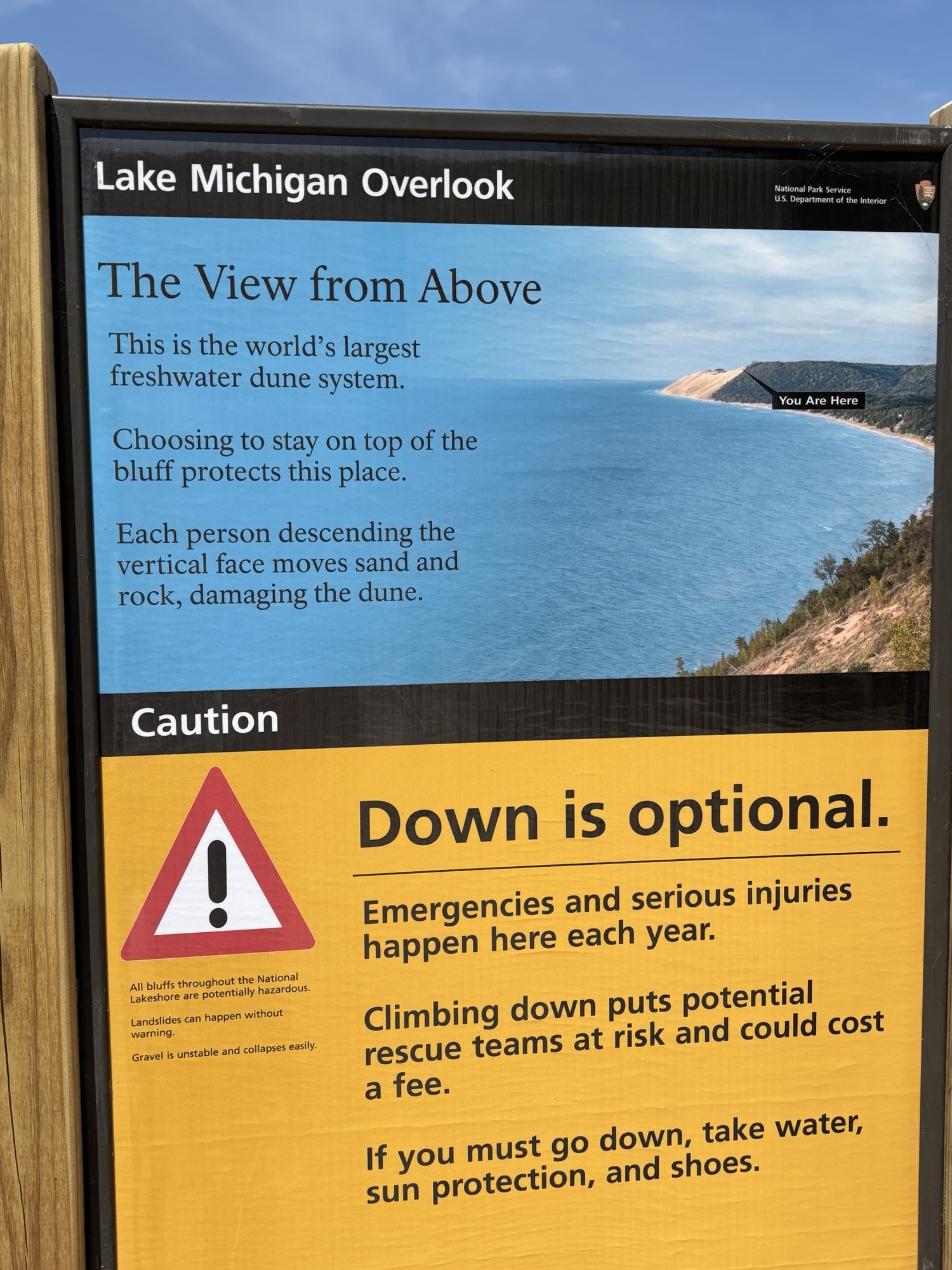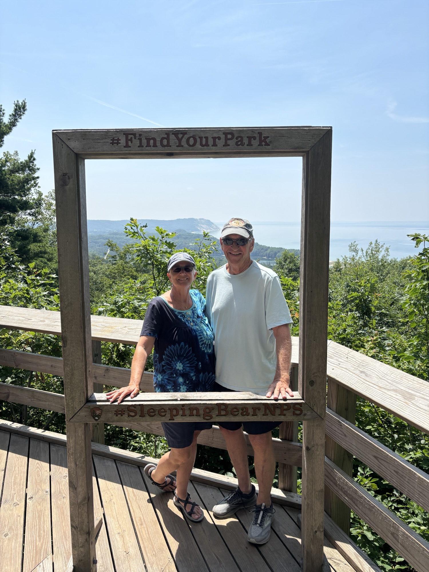On our last day there we headed out to the west side of the larger peninsula along the shore of Lake Michigan to a National Park called Sleeping Bear. We didn’t realize that it was a National Park, and we had forgotten our Senior Parks card and my Parks Passport stamp book in the RV, so yes, we had to pay to get in!