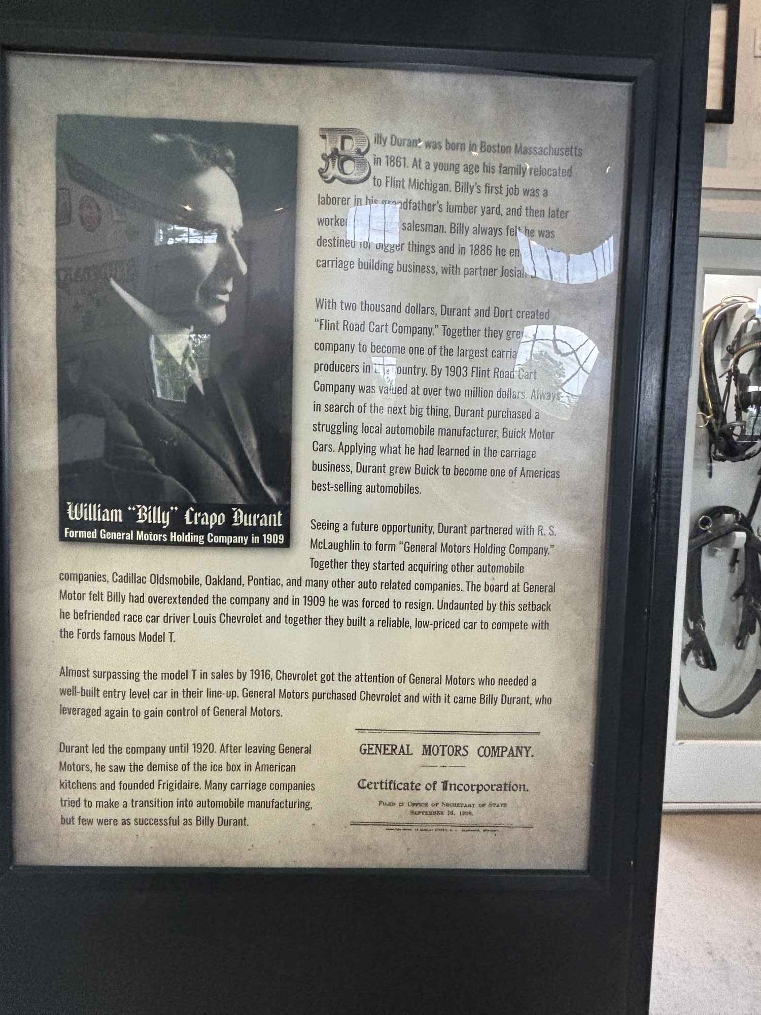 Another interesting historic coach story was about Billy Durant who started building coaches in 1886 and grew that business into forming General Motors by purchasing Buick Motor Cars and later others like Cadillac, Oldsmobile and Pontiac. And then in 1916, they acquired Chevrolet and the rest is history! He later even founded Frigidaire as the demand for the old “ice box” declined. A very interesting story.