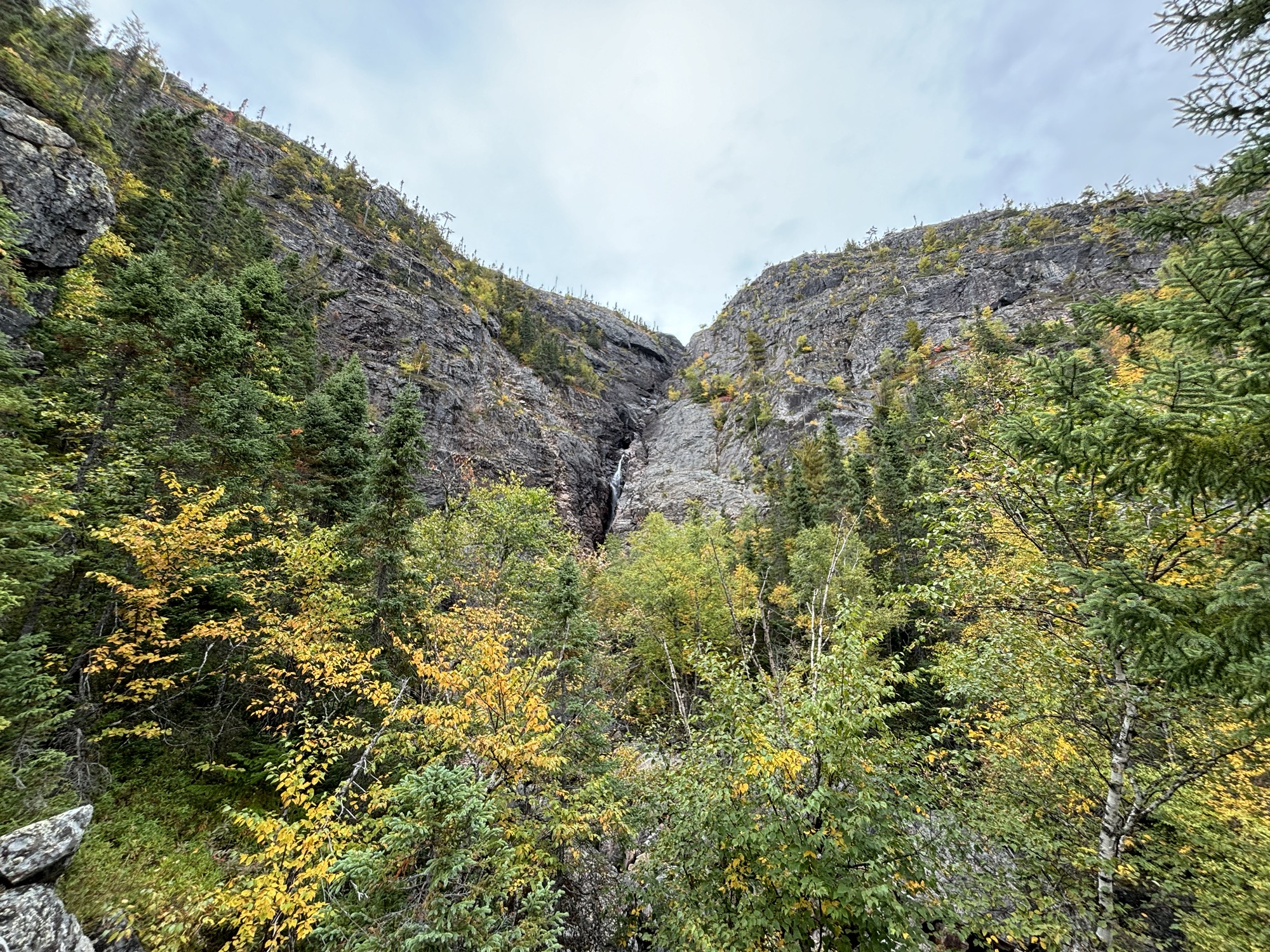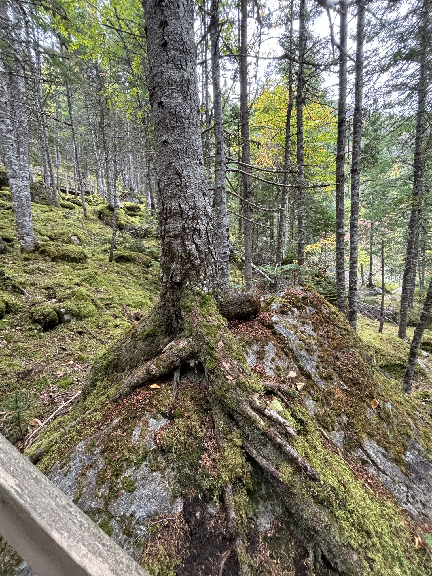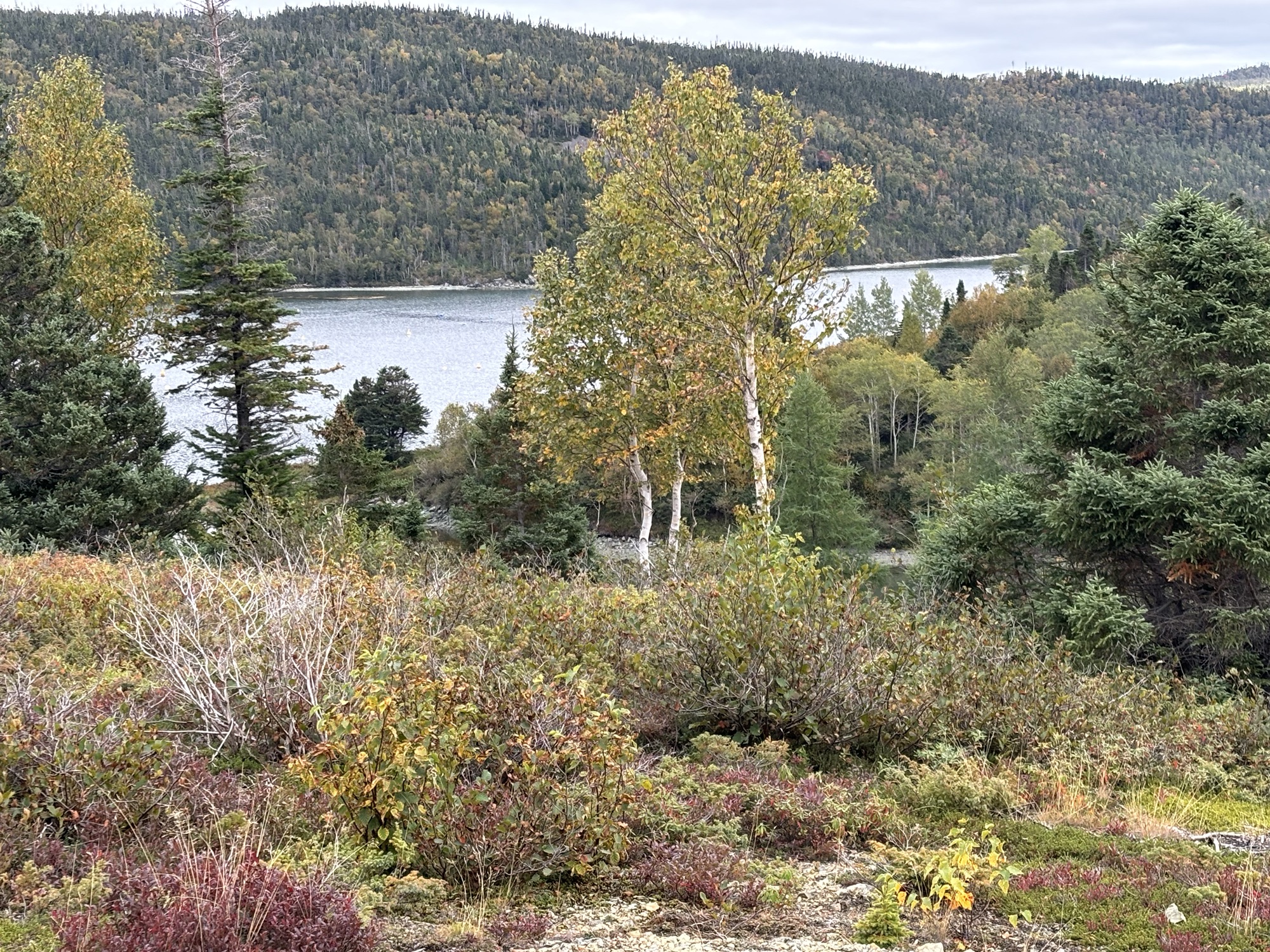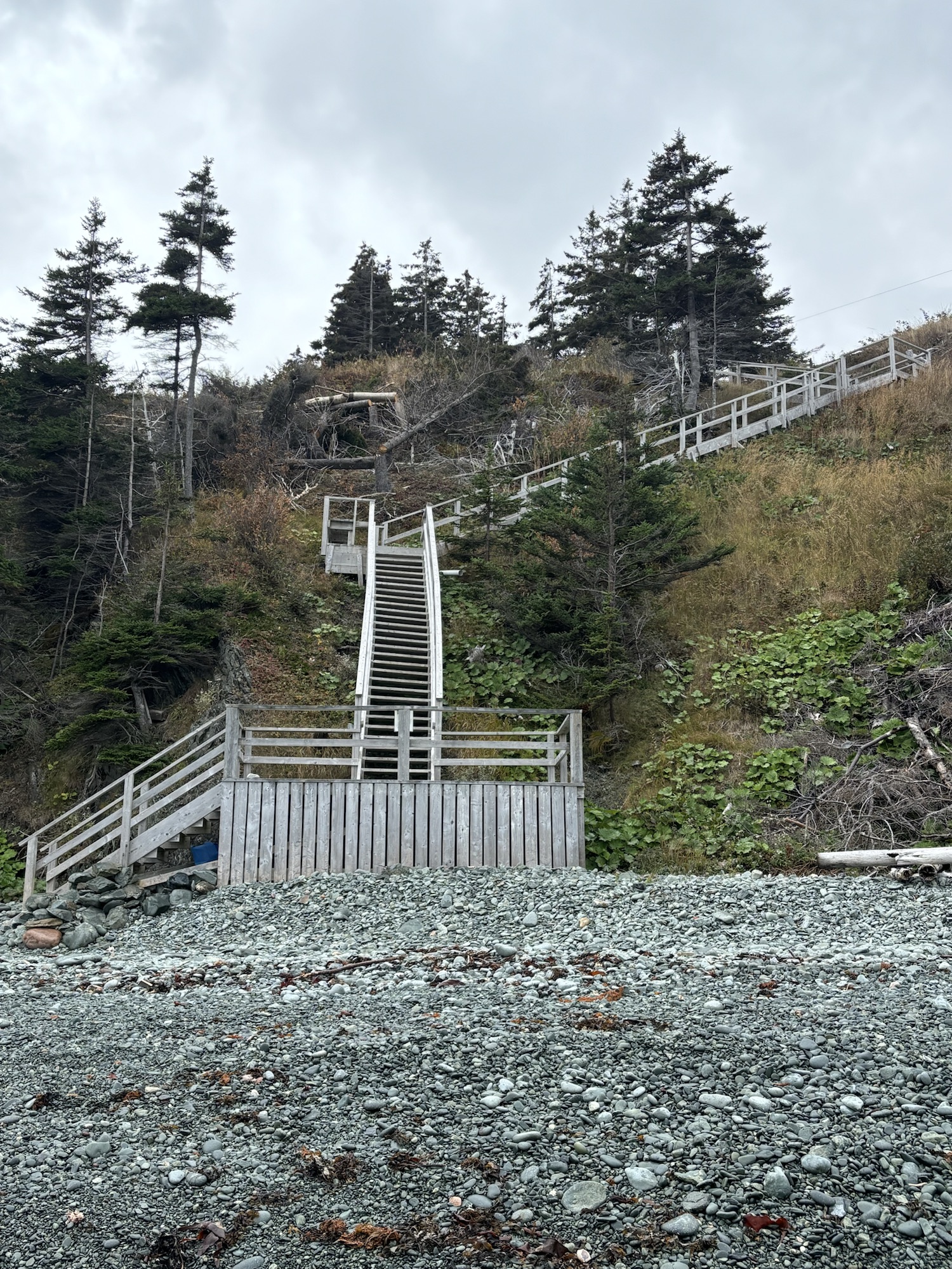 We went for a drive the next day to Back Cove Beach. We had to walk down 96 steps to reach the shore. But very nice. Then on to King’s Point and Rattling Brook to see the waterfall (yes, another waterfall!) There we had to walk up 124 steps, but it was well worth it. Lots of huge boulders and “rocks” around the falls, in the stream and along the cliffs. Saw a tree growing out of one of the larger ones. Along the way you could see evidence of mining or at least the exploration of the area.
