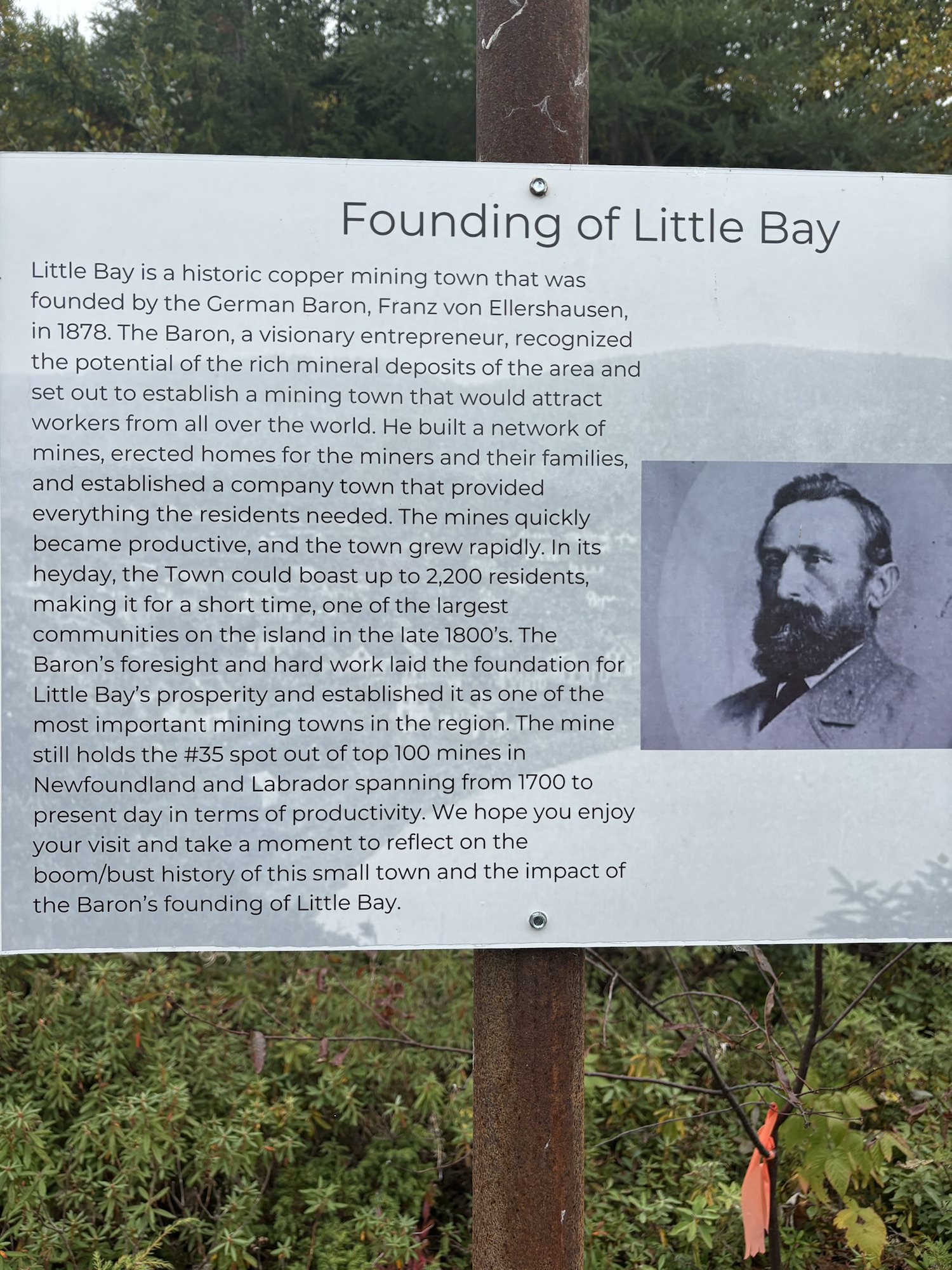 Little Bay is famous as we learned. There was copper discovered in the late 1800’s in the area. And the Little Bay mine turned out to be one of the most successful. In fact, at one time, Little Bay had over 2000 residents and was the second largest town in Newfoundland. The town had everything for that era. It piqued my interest so much that I googled for more info and found a book called “Once Upon a Mine”. It spoke of all the mining in the area and on the island. He listed over 70 mines operating from one end of the island to another. Some more successful than others. And they also mined for other metals like iron, gold, and even antimony!