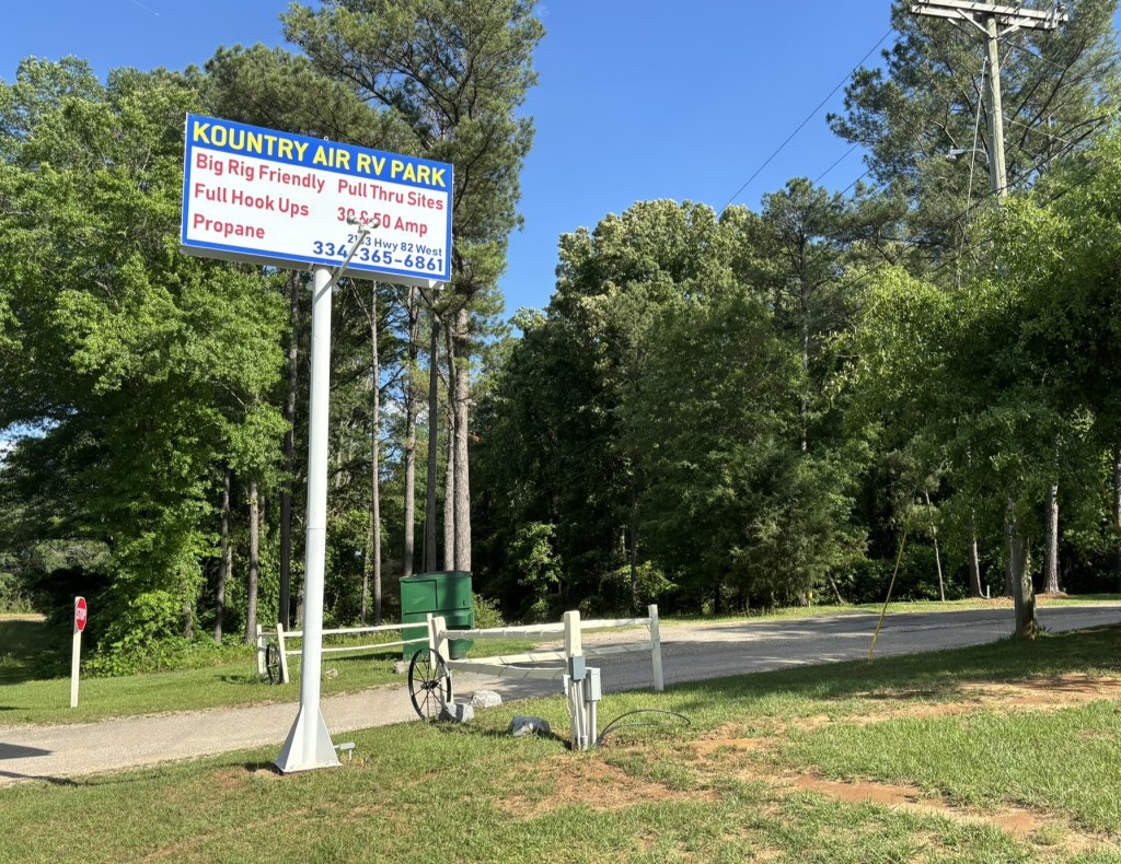 Day 3 we had a shorter leg up to Montgomery, AL and another different kind of spot. This was a privately owned RV park called Kountry Air near Prattville, AL. It was wonderful. On the internet it was rated 9.0 and one reason to put it on our list. Located in the woods with an easy pull thru pad. And a laundry. We went into Prattville for dinner, and it happened to be a festival weekend with food trucks and music at park downtown by the river. Cajun food and a huge scoop of ice cream.