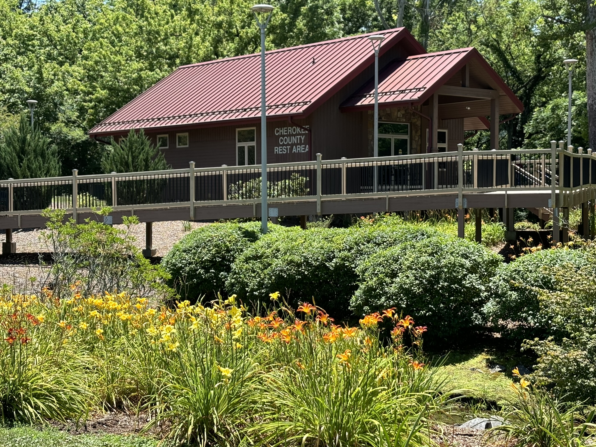 As we entered Cherokee County, NC we stopped at a roadside rest area. You might be wondering – so what? We are mentioning it, because it was the nicest one we have ever seen. We even sent an email to the county clerk’s office to express how much we enjoyed it. (Especially the daylily garden!)