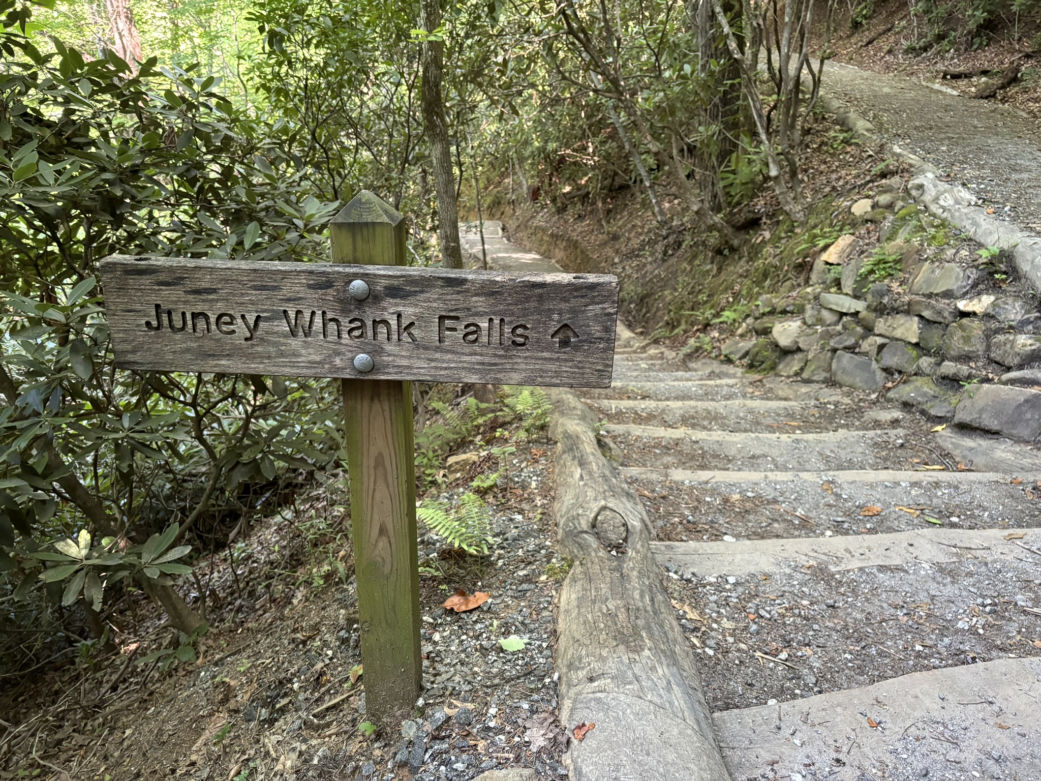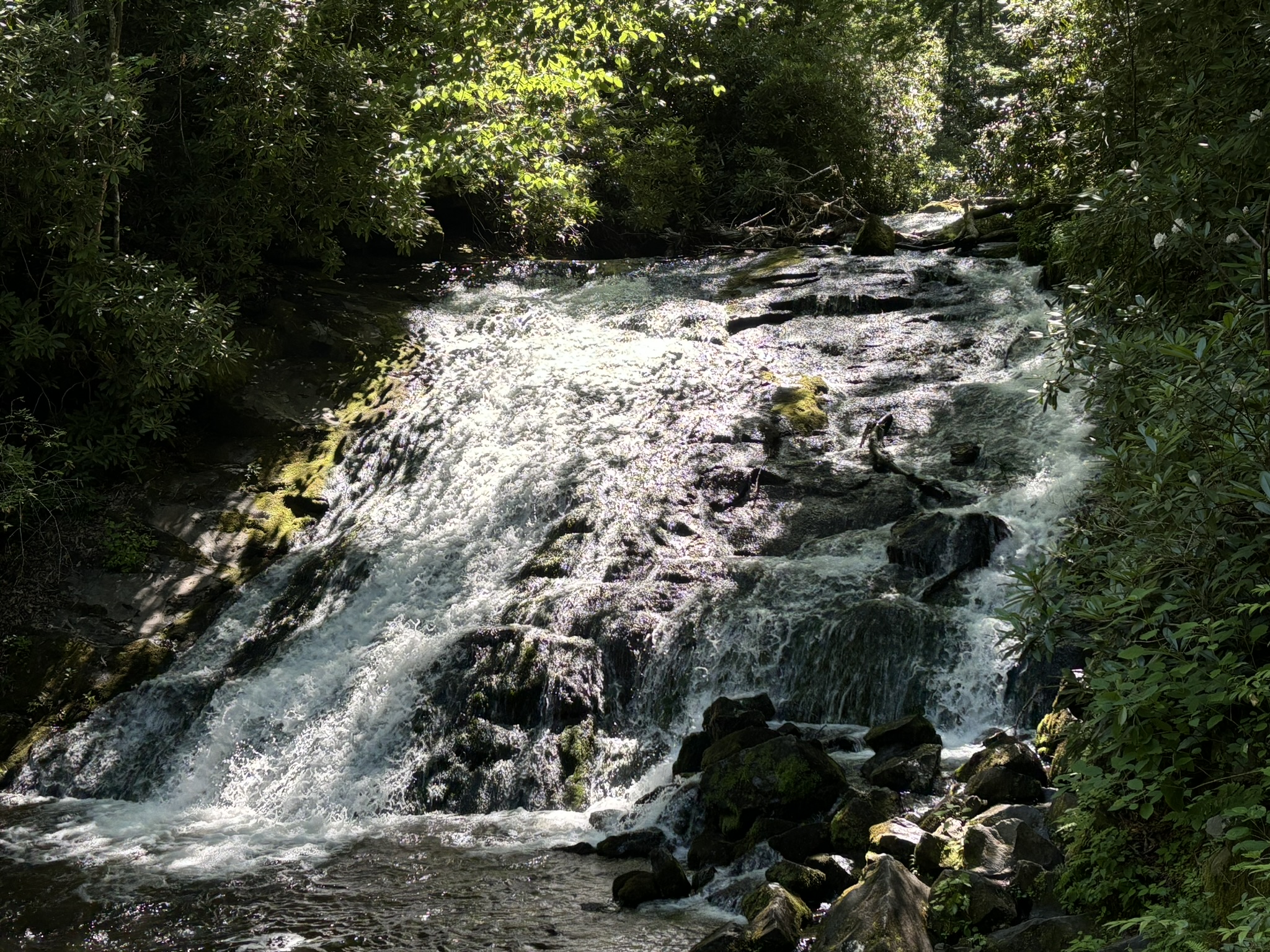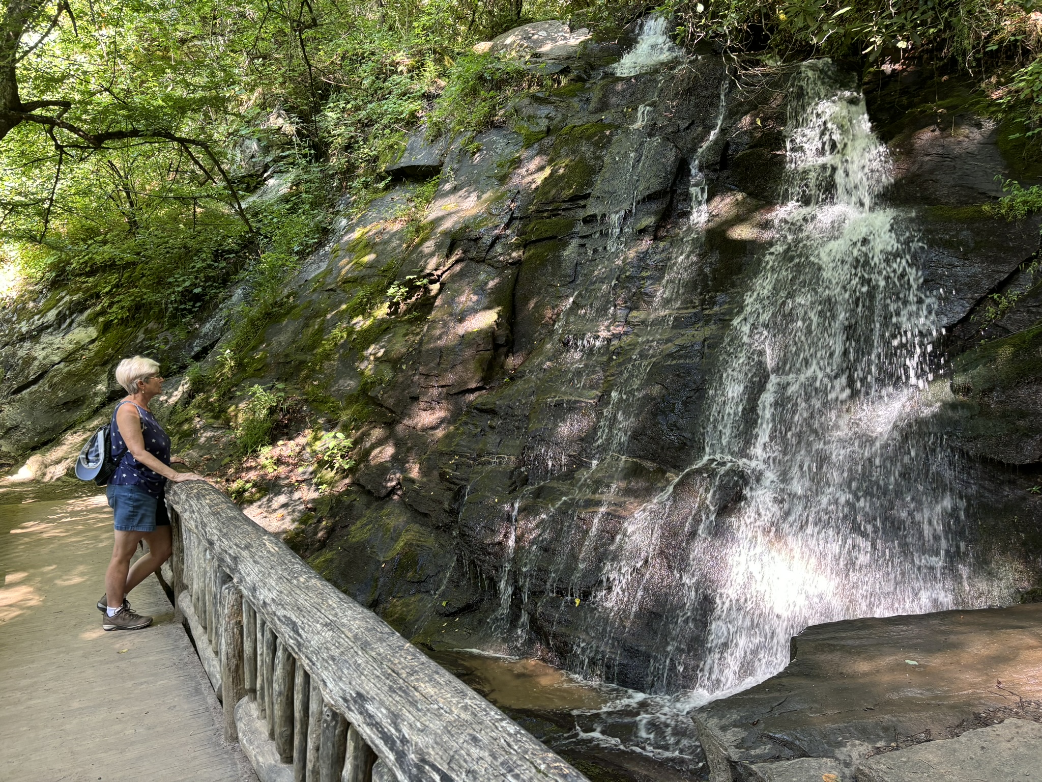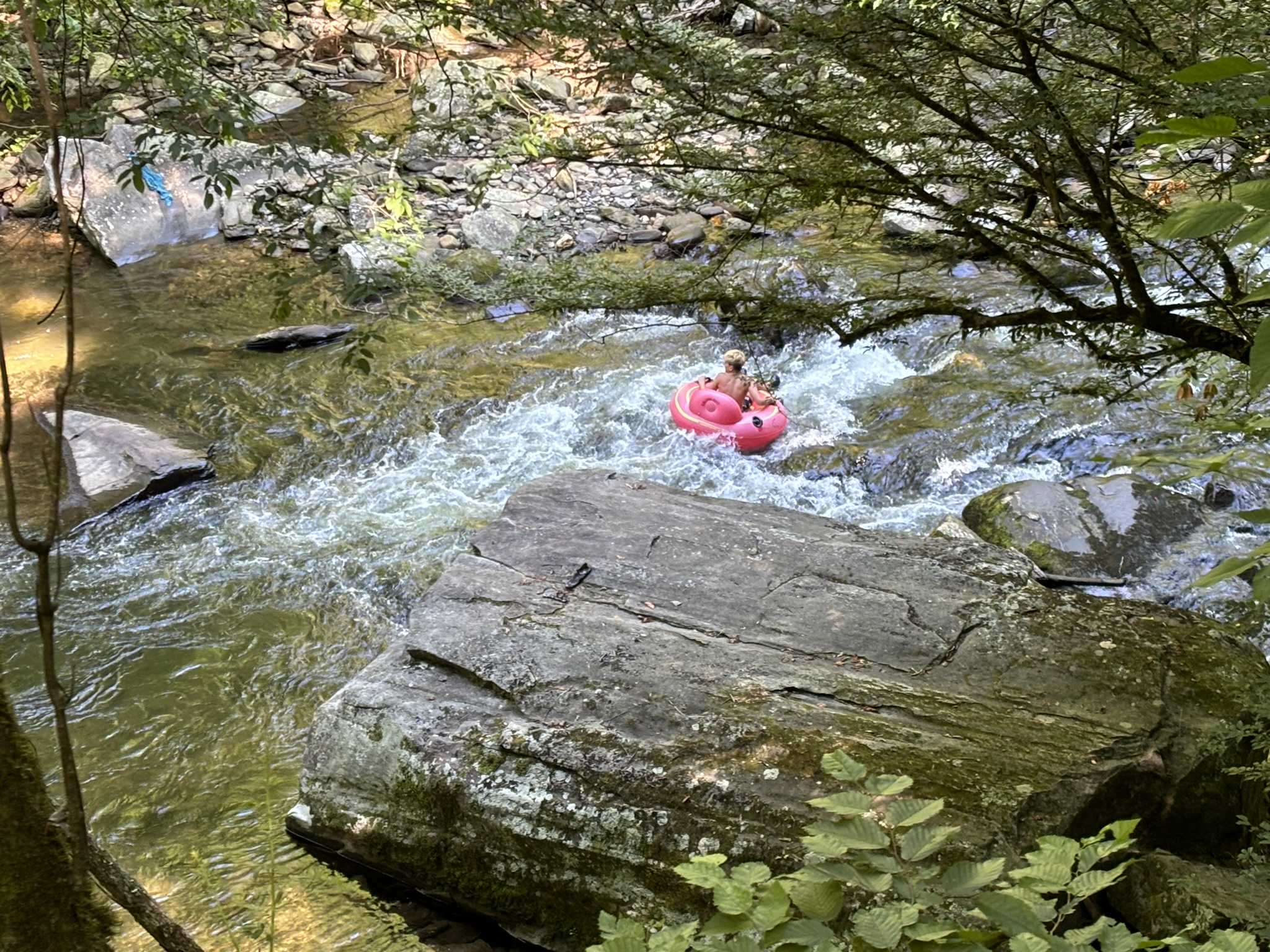 The falls parking was almost empty as we were up early. The first falls trail said it had a moderate elevation change but their definition and ours is quite different! Overall, it was doable, only about .5 mile and the result was very nice. Called Juney Whank falls (meaning “where bears cross”). Coming down was steep but easier, and it took you to where the path is wider and, as we would soon discover, where all the tubers hike up to their launching point! We found the other 2 falls after a nice relaxing hike and headed back to the parking lot.