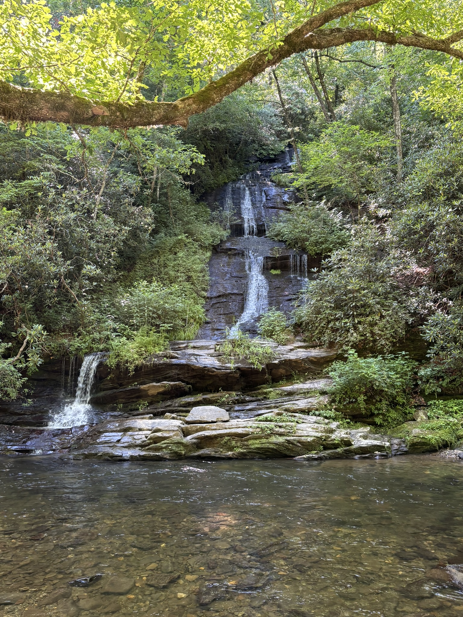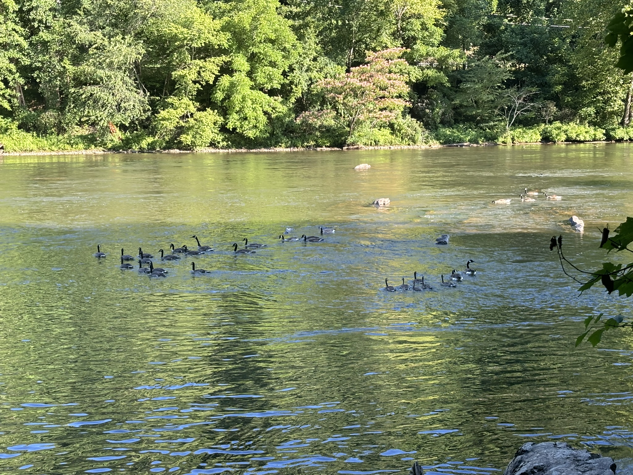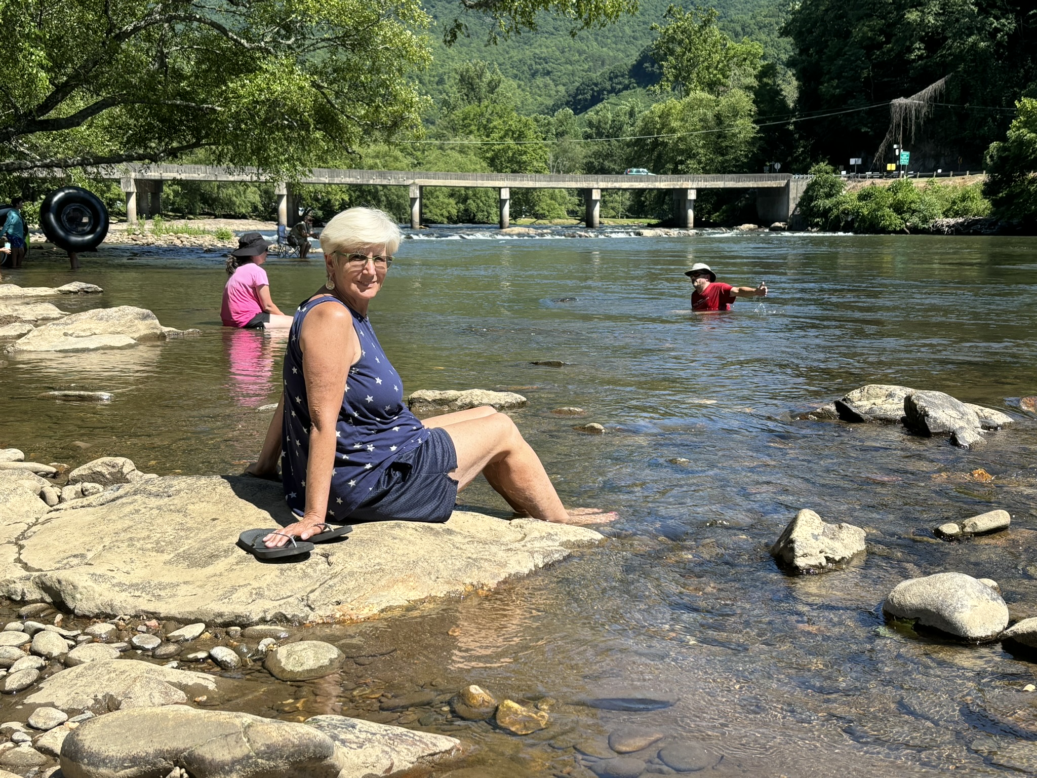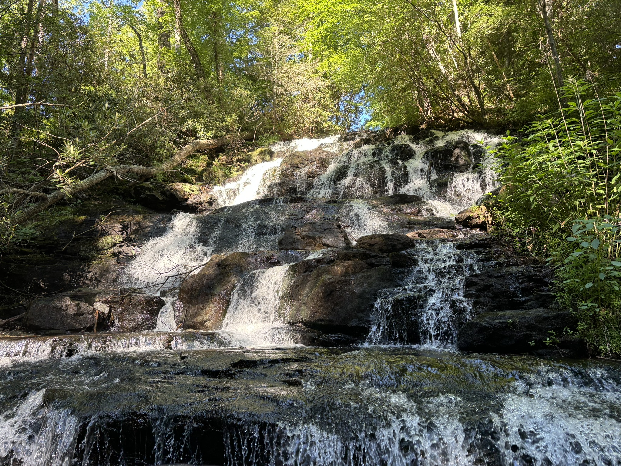 The falls parking was almost empty as we were up early. The first falls trail said it had a moderate elevation change but their definition and ours is quite different! Overall, it was doable, only about .5 mile and the result was very nice. Called Juney Whank falls (meaning “where bears cross”). Coming down was steep but easier, and it took you to where the path is wider and, as we would soon discover, where all the tubers hike up to their launching point! We found the other 2 falls after a nice relaxing hike and headed back to the parking lot.
