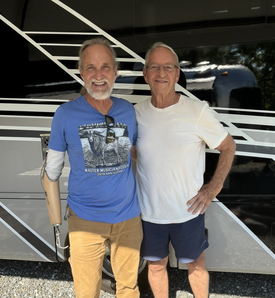 Later that evening our friend Zip Robertson came by the RV park to visit. We have known Zip for many years in Miami. I sold him a sailboat that he lived on with his black lab, Major, and we became good friends. Zip also played guitar in several bands over the years and especially at the Coconut Grove Sailing Club in our neighborhood. Zip had retired and with his sister had bought some land just outside Bryson City and he is now living and playing there full time. We hashed over some old history and discussed RVing and life in general. Great to catch up.