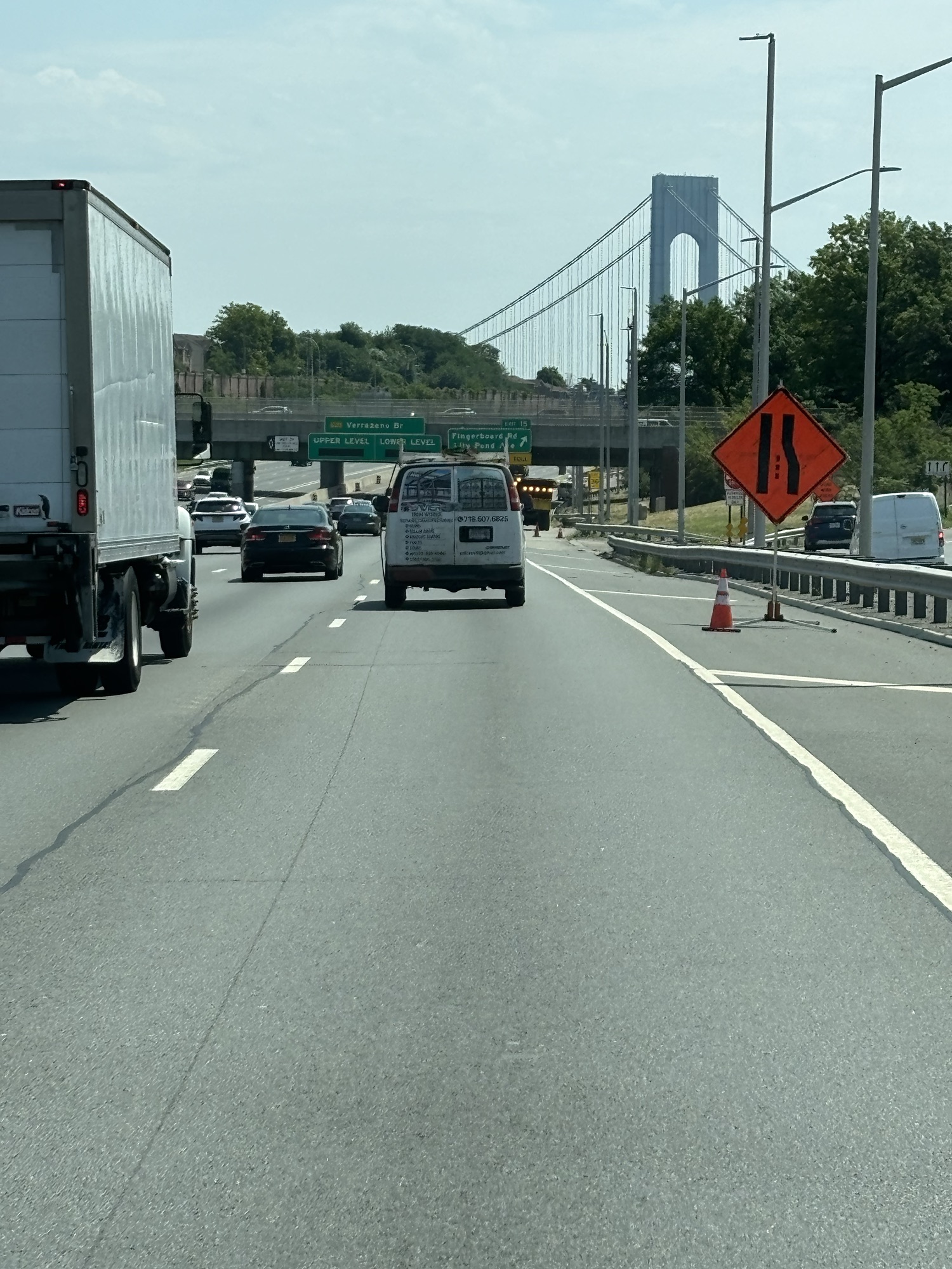 As we took the exit, there was a sign saying if you were over 10’6” in height you cannot use the Belt Parkway! Oops! We are 11’8” and we were a little stunned what to do. The next sign said to exit if you were over height, so we did! But we exited too soon into a fenced in and gated work area for the city! It appeared that we were stuck. But as it turned out, fate provided us with a perfect solution. There was a team of Bridge and Tunnel workers sitting in a city pickup taking a break. I went over to ask what to do next and they calmly explained the Expressway/Parkway differences in the city. You cannot drive with any trailer (and no commercial vehicles are allowed) and must be below the posted max heights. We were both.