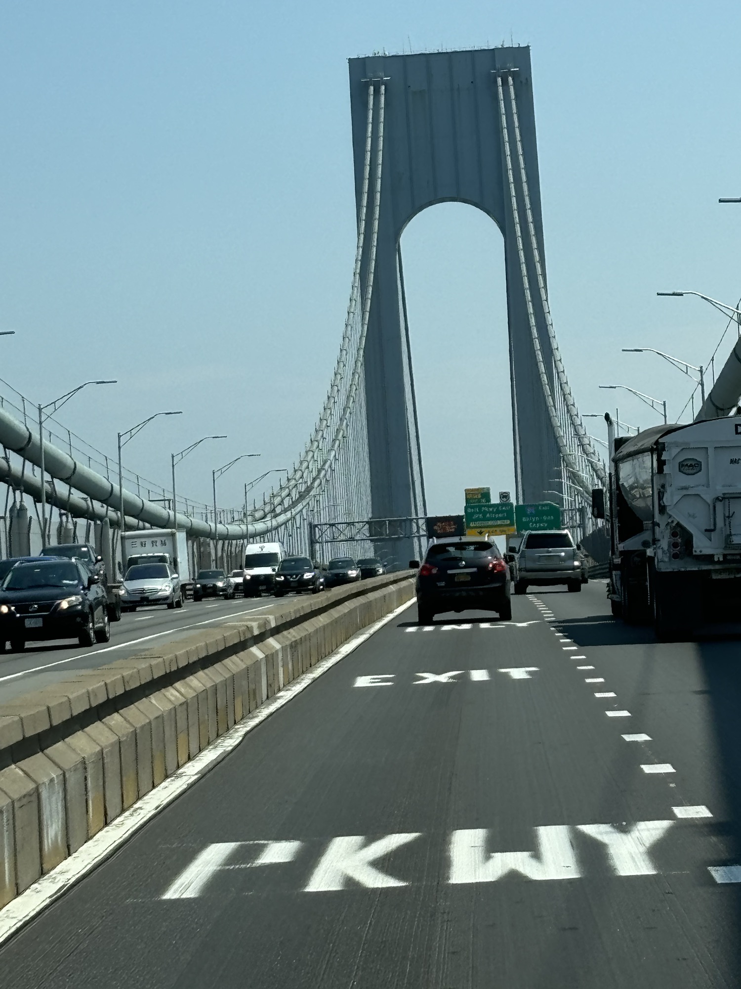 So we set off for Long Island and Wildwood State Park for a long stay. But we had some navigating (more than we anticipated) to do getting thru the city. We took the Garden State Expressway up north to the city. It was nice and inexpensive. We crossed into Staten Island easily and across to the Verrazzanno-Narrows bridge into Brooklyn. We had decided to use the Belt Parkway to avoid going thru Brooklyn and the city traffic. So just across the bridge, the navigation “lady” told us to exit onto the Belt Parkway. (Those of you familiar with the freeway system in NYC may know what is coming next!) (Oh! BTW- The SunPass/EZPass charge for the bridge was $93.50! RV with double rear wheels towing a car!)