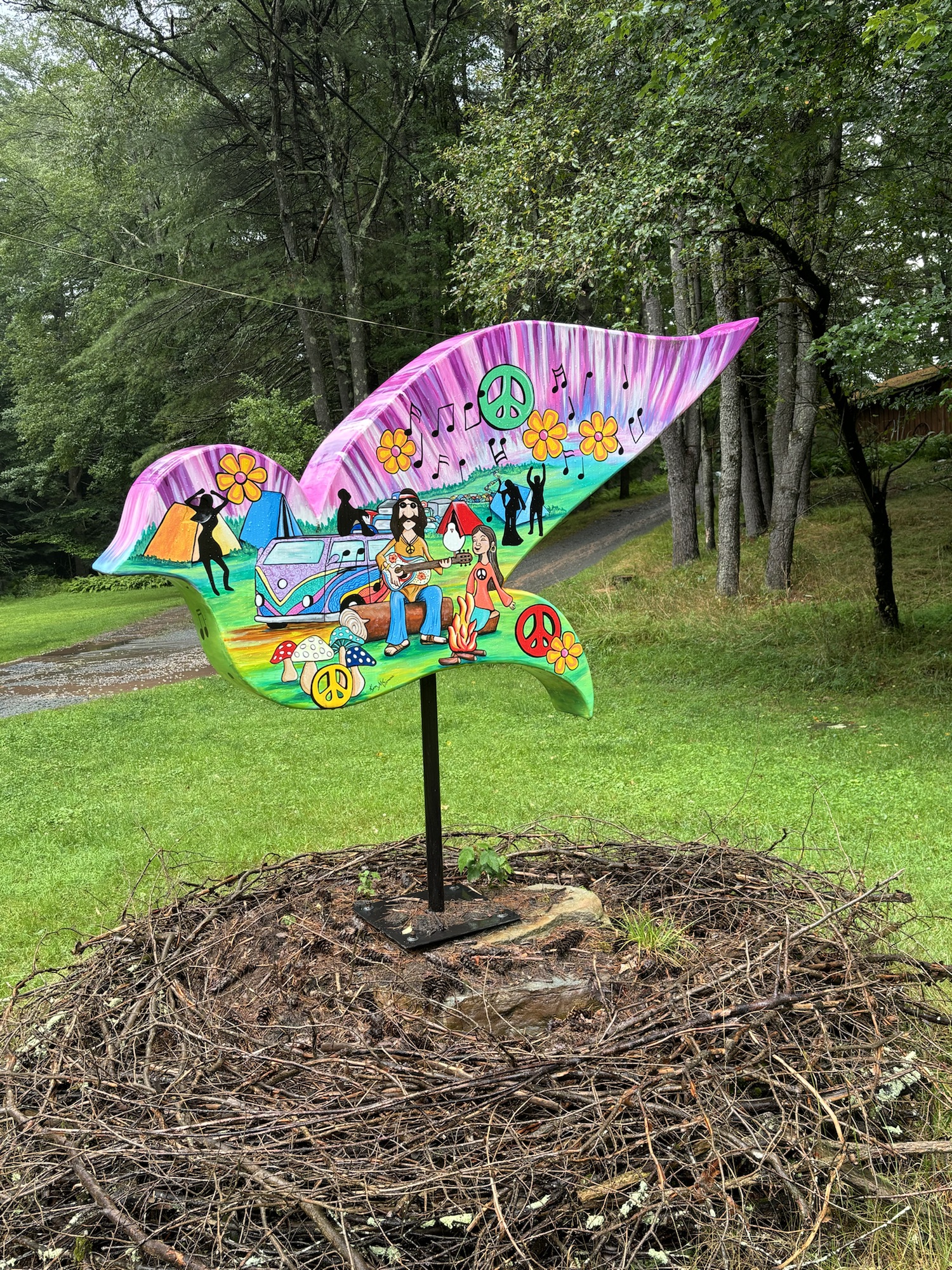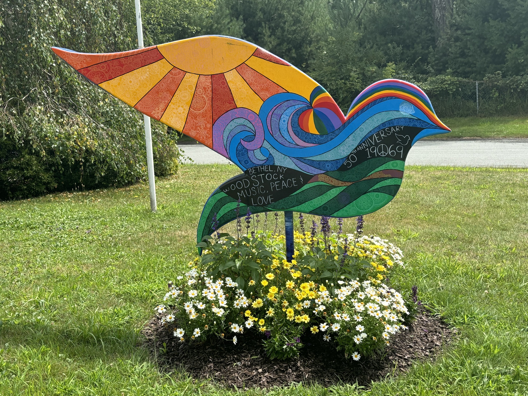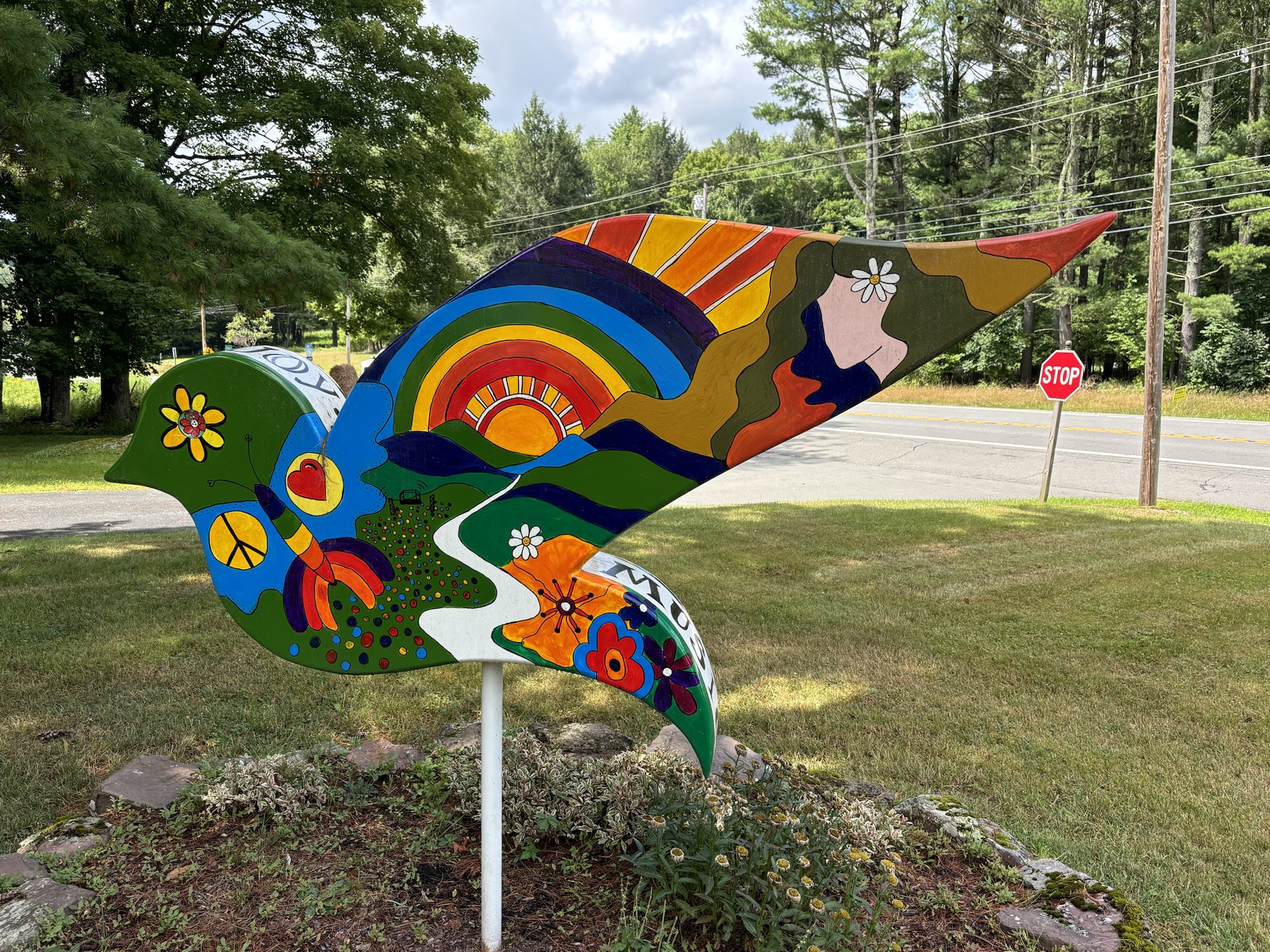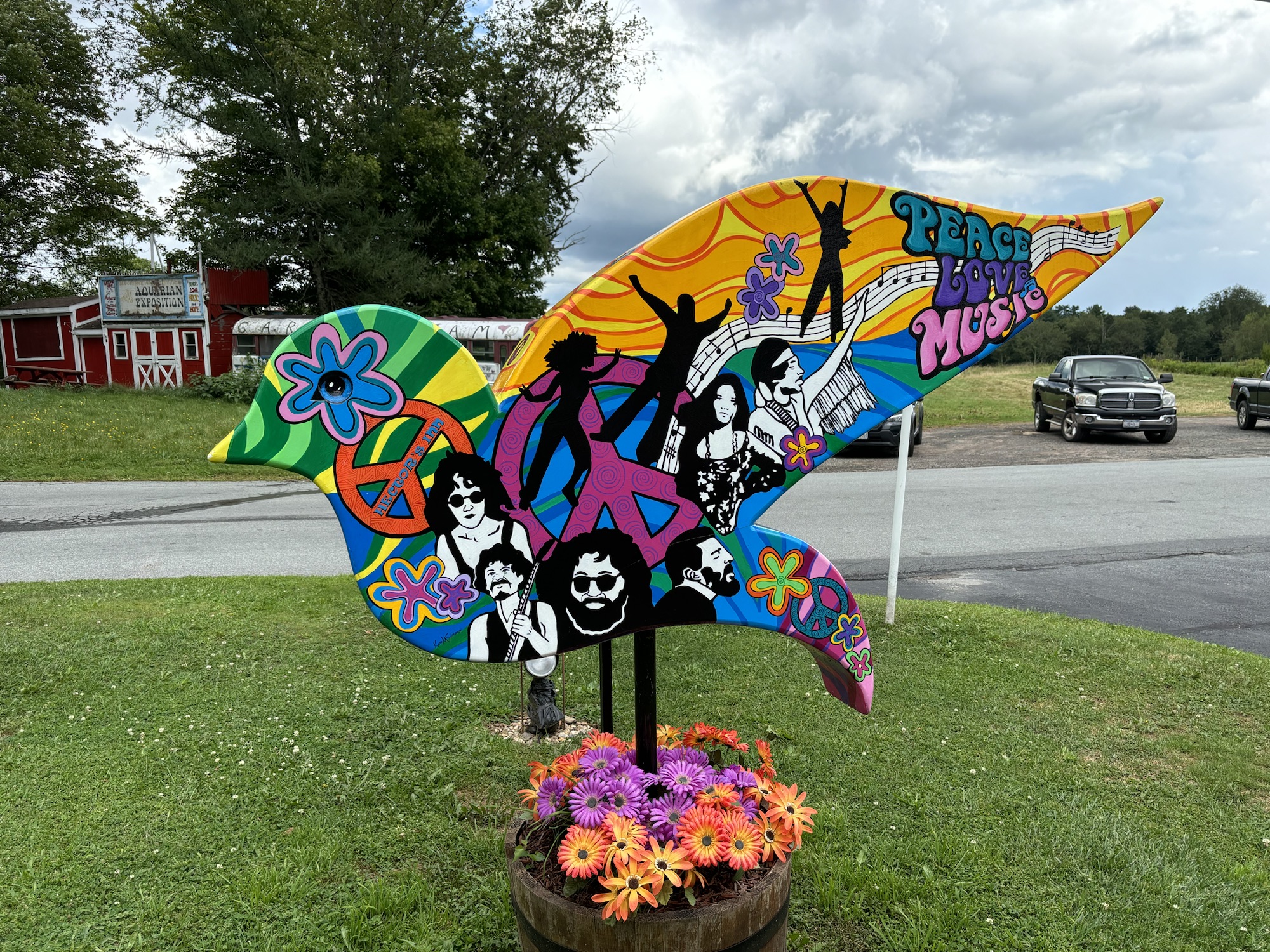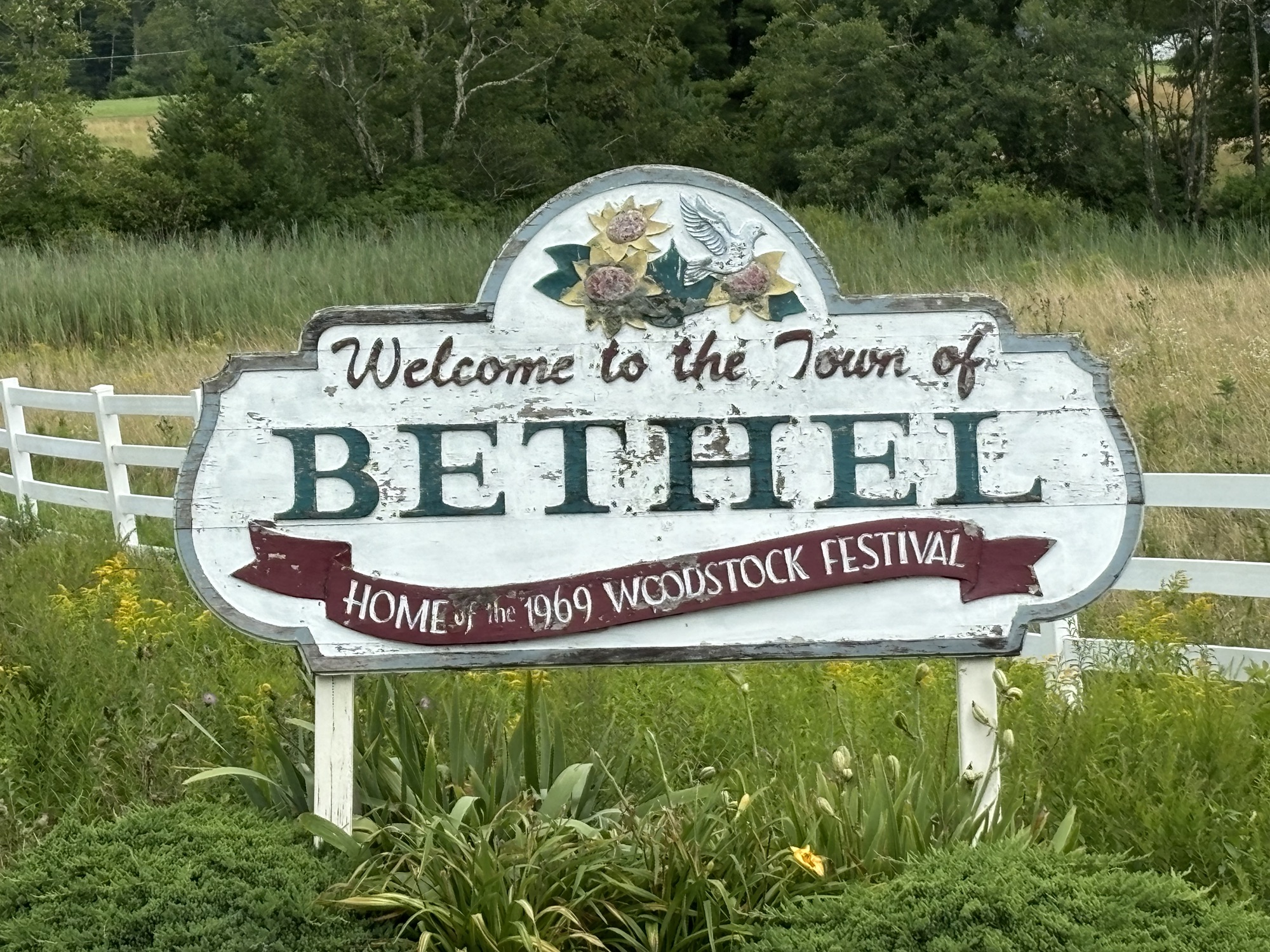 The town of Bethel and the surrounding towns are still full of the Peace, Love, and Music theme of the Woodstock era. To commemorate the 50th anniversary of the concert in 2019, the county placed 60 dove sculptures around the area with each one painted with artistic scenes of the event. We drove around the Bethel area and found about 6 of the 60, including the one at Happy Days.