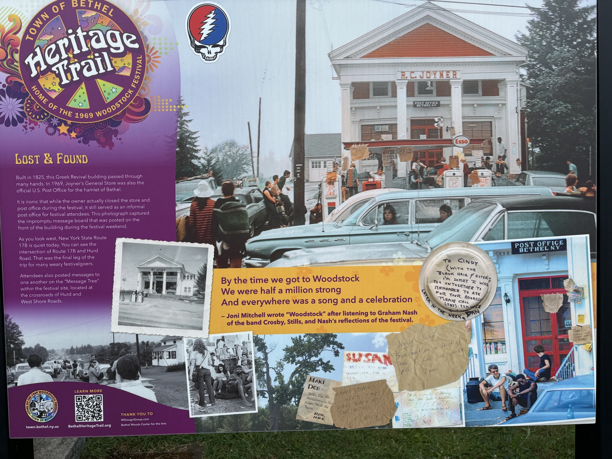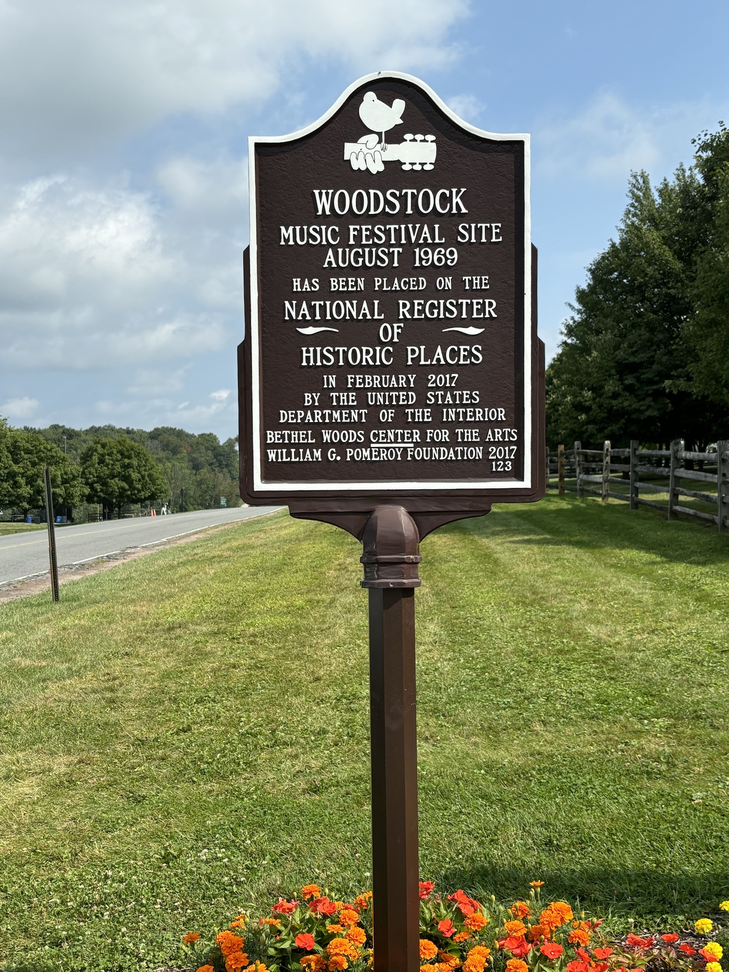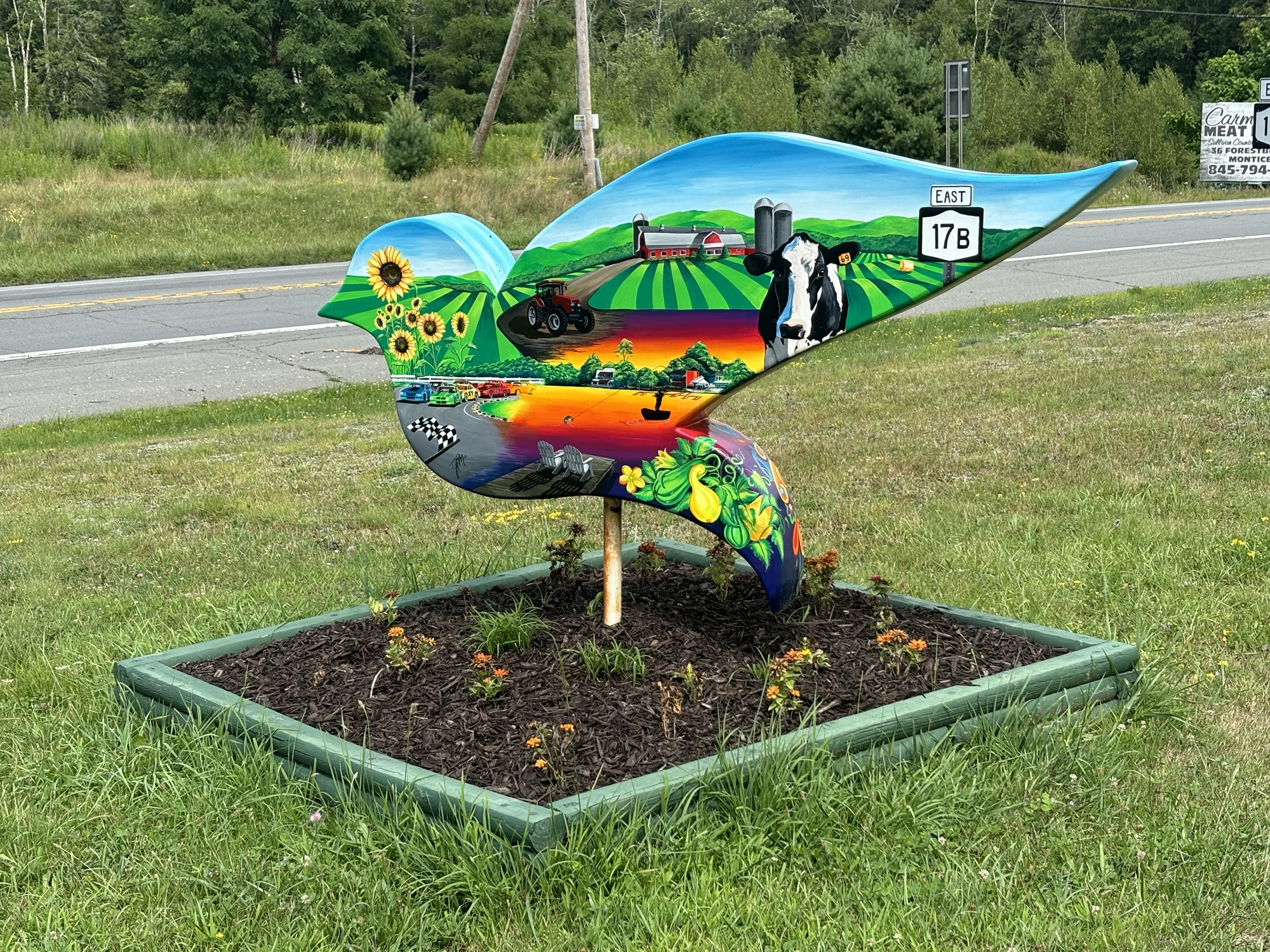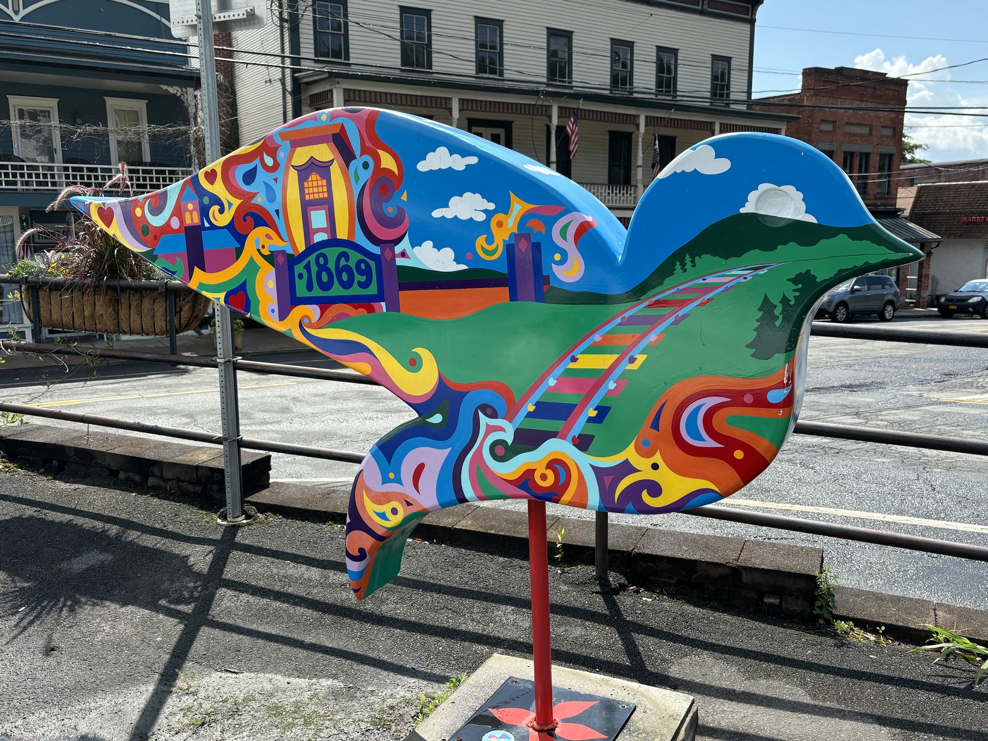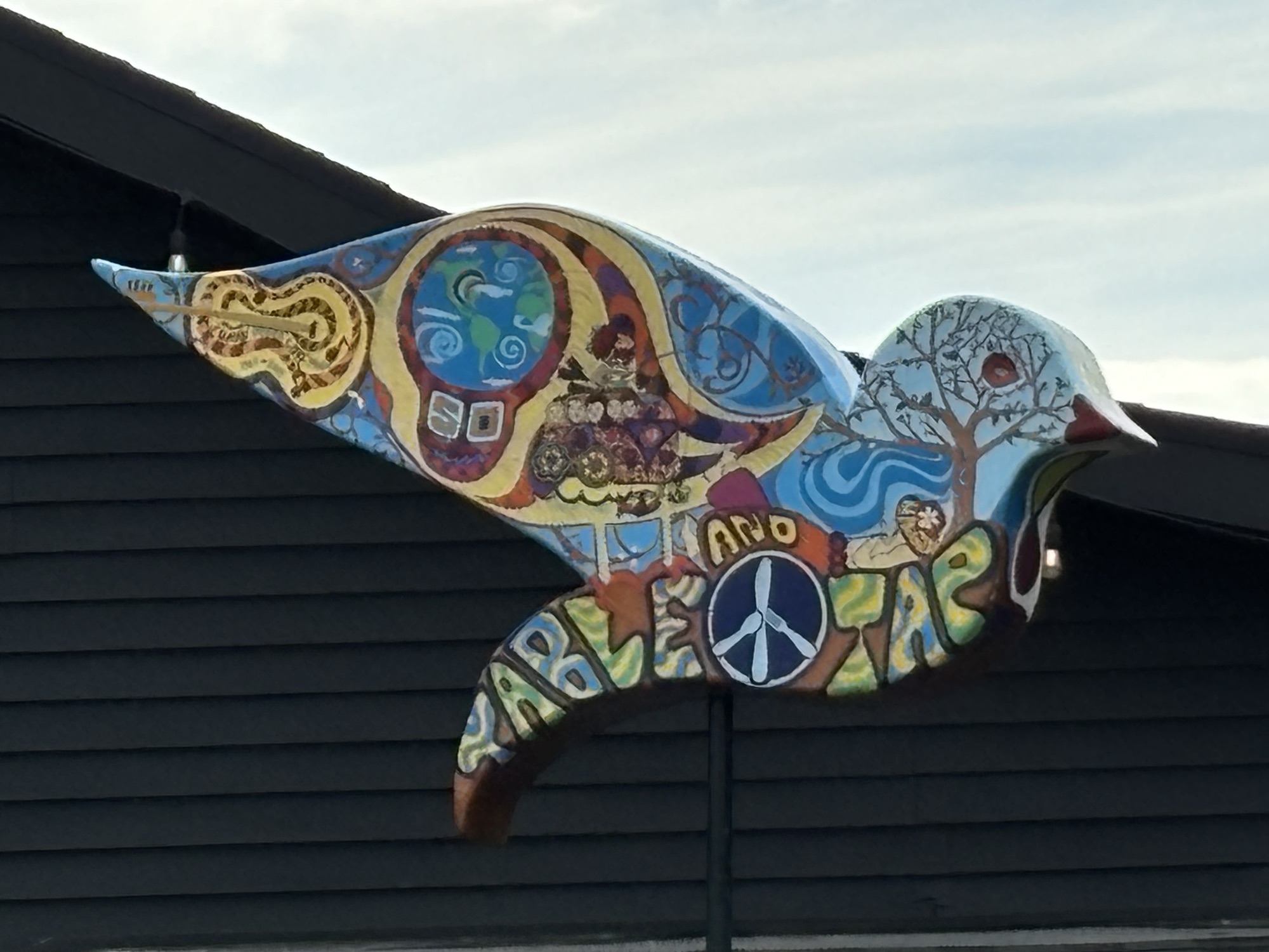 The town of Bethel and the surrounding towns are still full of the Peace, Love, and Music theme of the Woodstock era. To commemorate the 50th anniversary of the concert in 2019, the county placed 60 dove sculptures around the area with each one painted with artistic scenes of the event. We drove around the Bethel area and found about 6 of the 60, including the one at Happy Days.