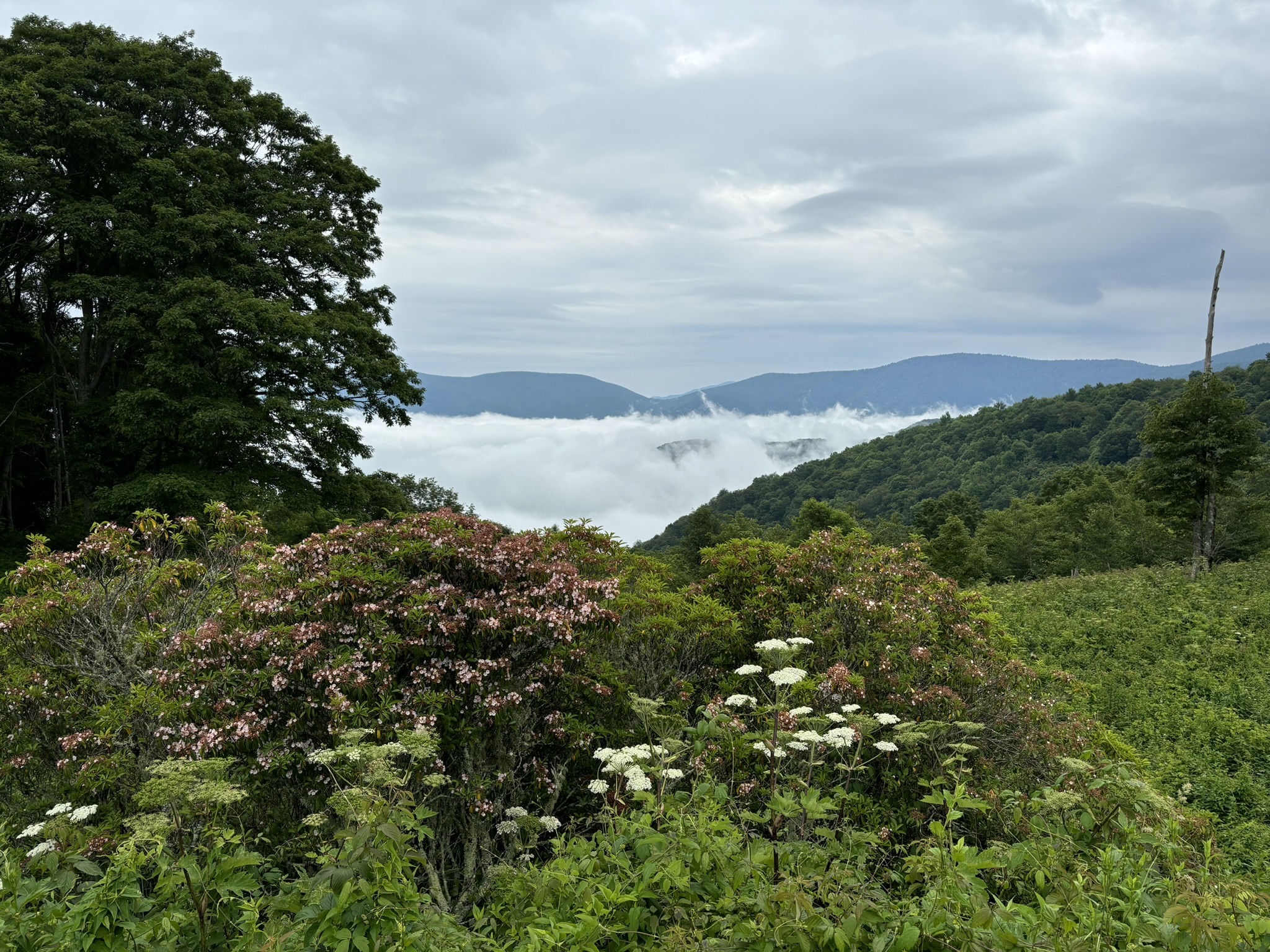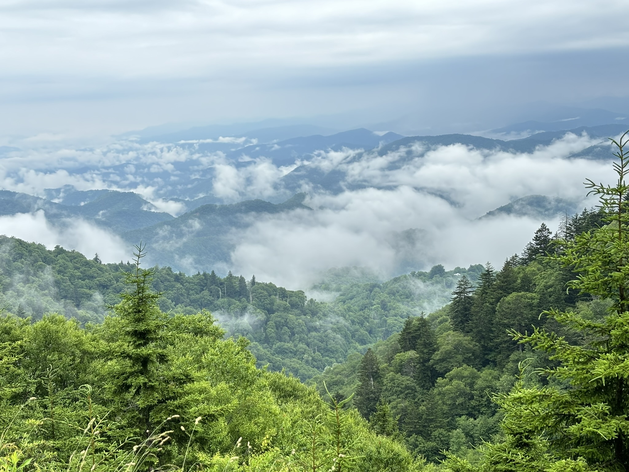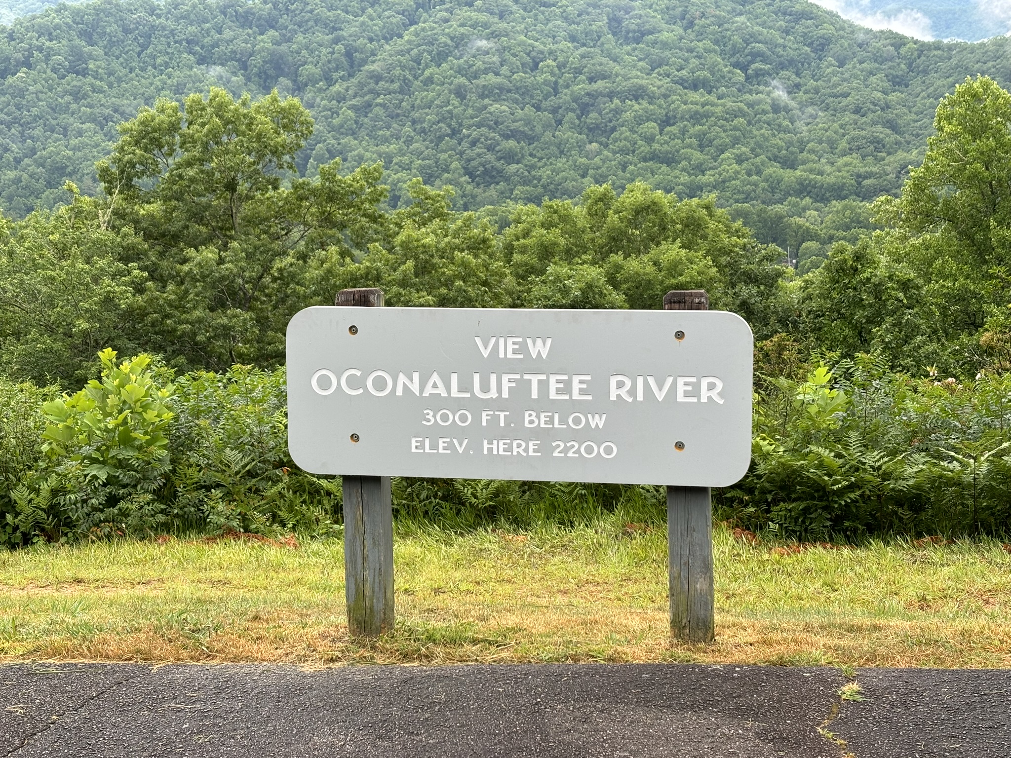 Obviously, you can’t stop at everyone but that first day was different. With the cloud layer sometimes above us and sometimes below us, the view changed a lot, and we stopped maybe more than was necessary. But it was new, and it was very stunning. So, we did. Picking photos to post would become even harder. But one stop of interest was the highest point overlook which was at 6053 ft. We met a nice couple from College Station, TX that took our picture.