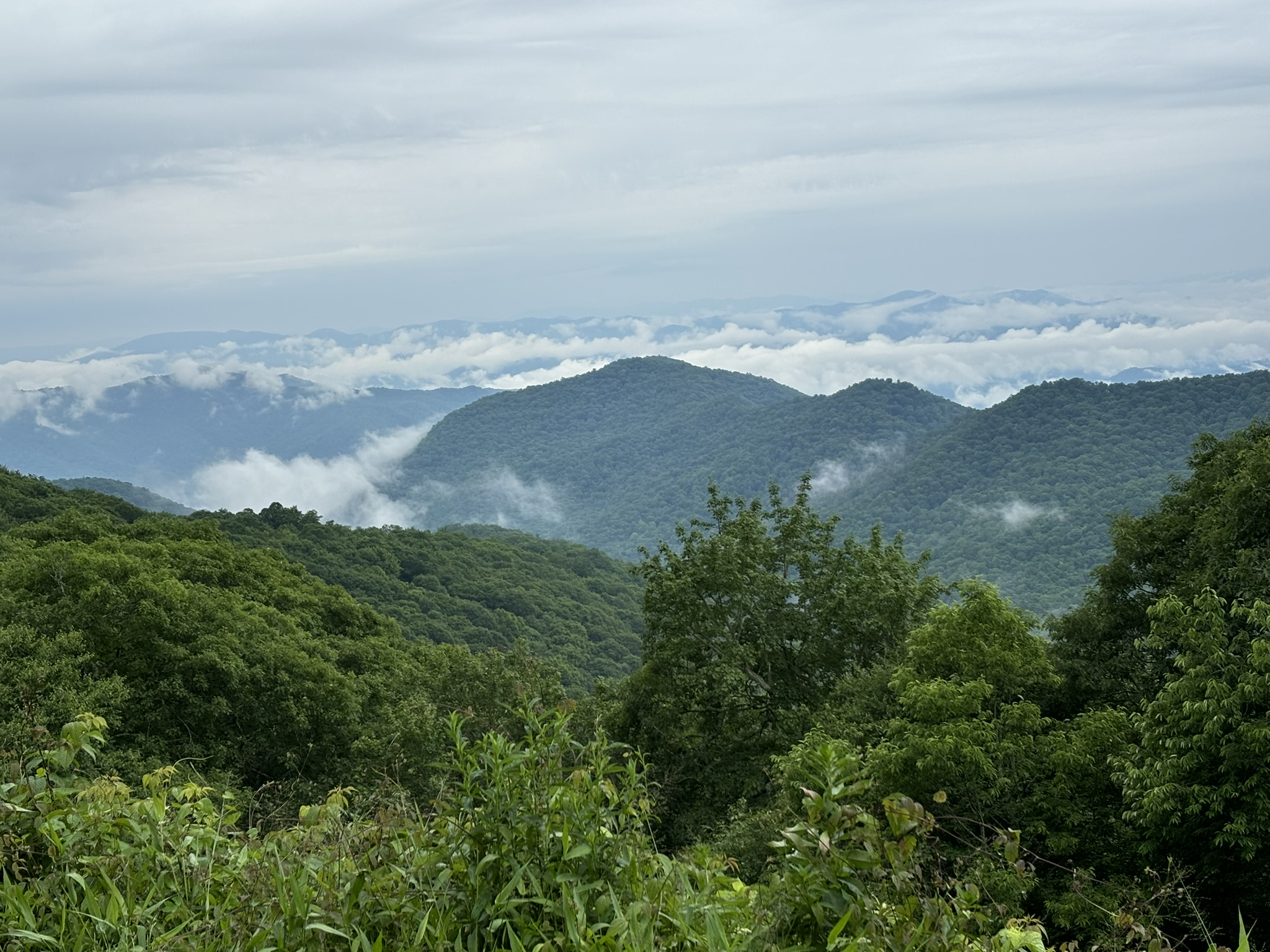 We woke up the next morning and looked up into the mountains north of Bryson City where we were headed to what looked like fog. It had rained some in the night and it was actually a low cloud layer still hovering in the mountains. We unhooked and headed to the Parkway entrance and were immediately rewarded with no traffic and beautiful scenery.