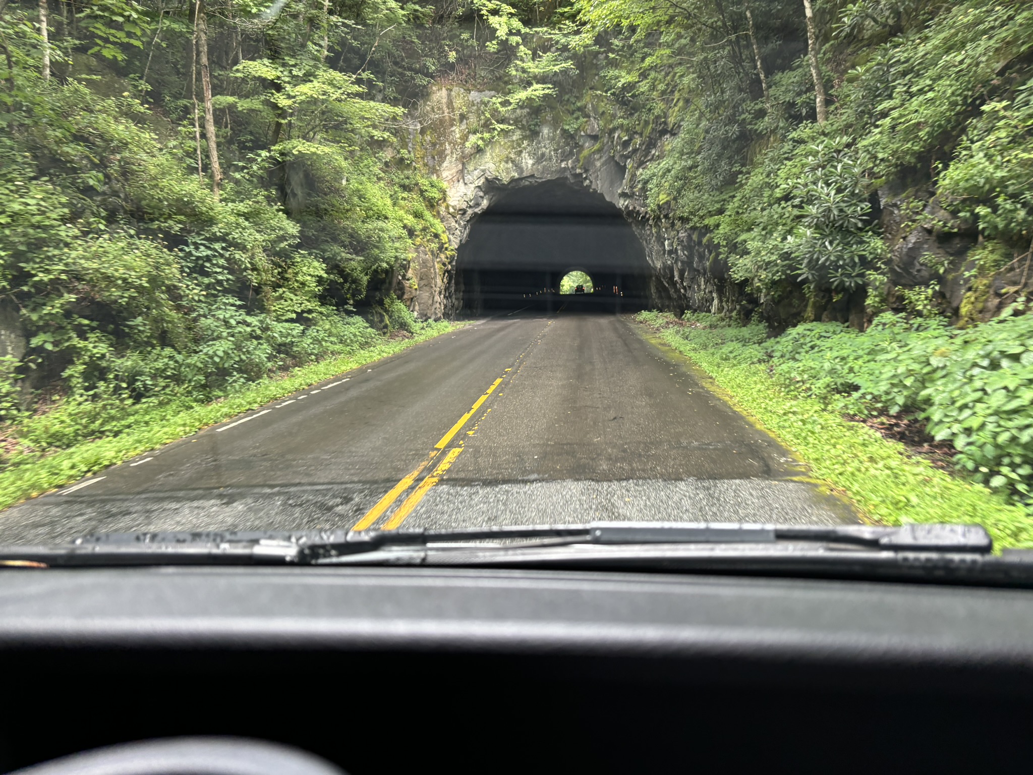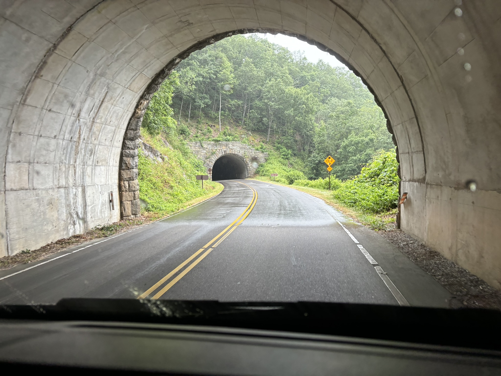 There are also 26 tunnels on the parkway and all but 1 are at the south end so we did 25 the first day and the last one on the 4th day. They range in height from 19’ 3” to 17’ 7” in the center to only 14’ 8” to 11’ 7” on the edge line. Since “the Boat” is 11’ 6” with our antenna, we felt good about going through them. I had asked some of the other Delano owners if they had driven the Parkway and was assured that the clearances were good. But it still looked close!