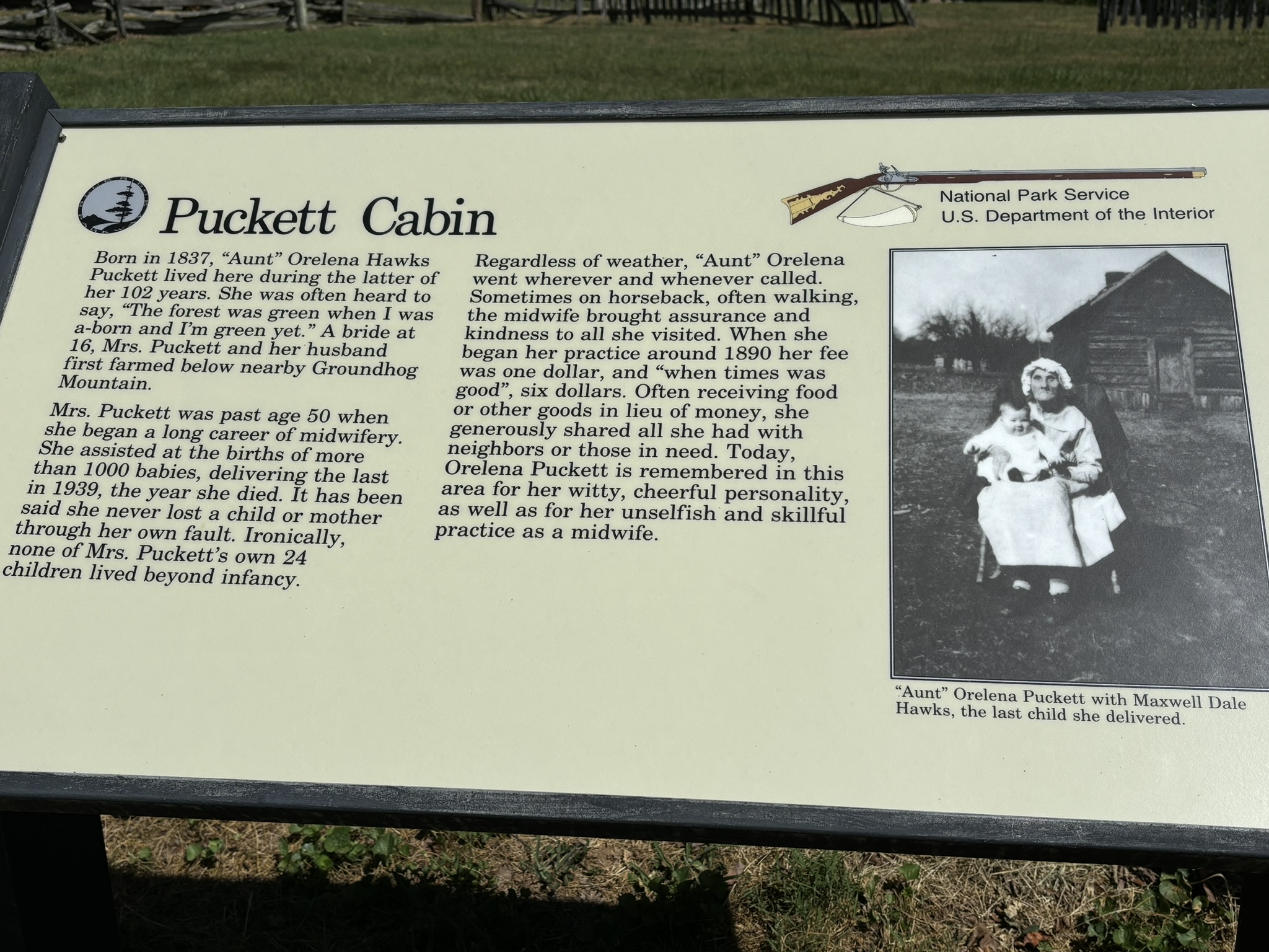 The next day we were back on the parkway for another 90 miles. We stopped at a few places including the Pucket Cabin where “Aunt” Orelena Hawks Puckett lived to be 102. What a life! She had 24 pregnancies but none of the children lived due to RH factor. Later in her life, she became a midwife and delivered over 1000 babies the last in 1939, the year she died.