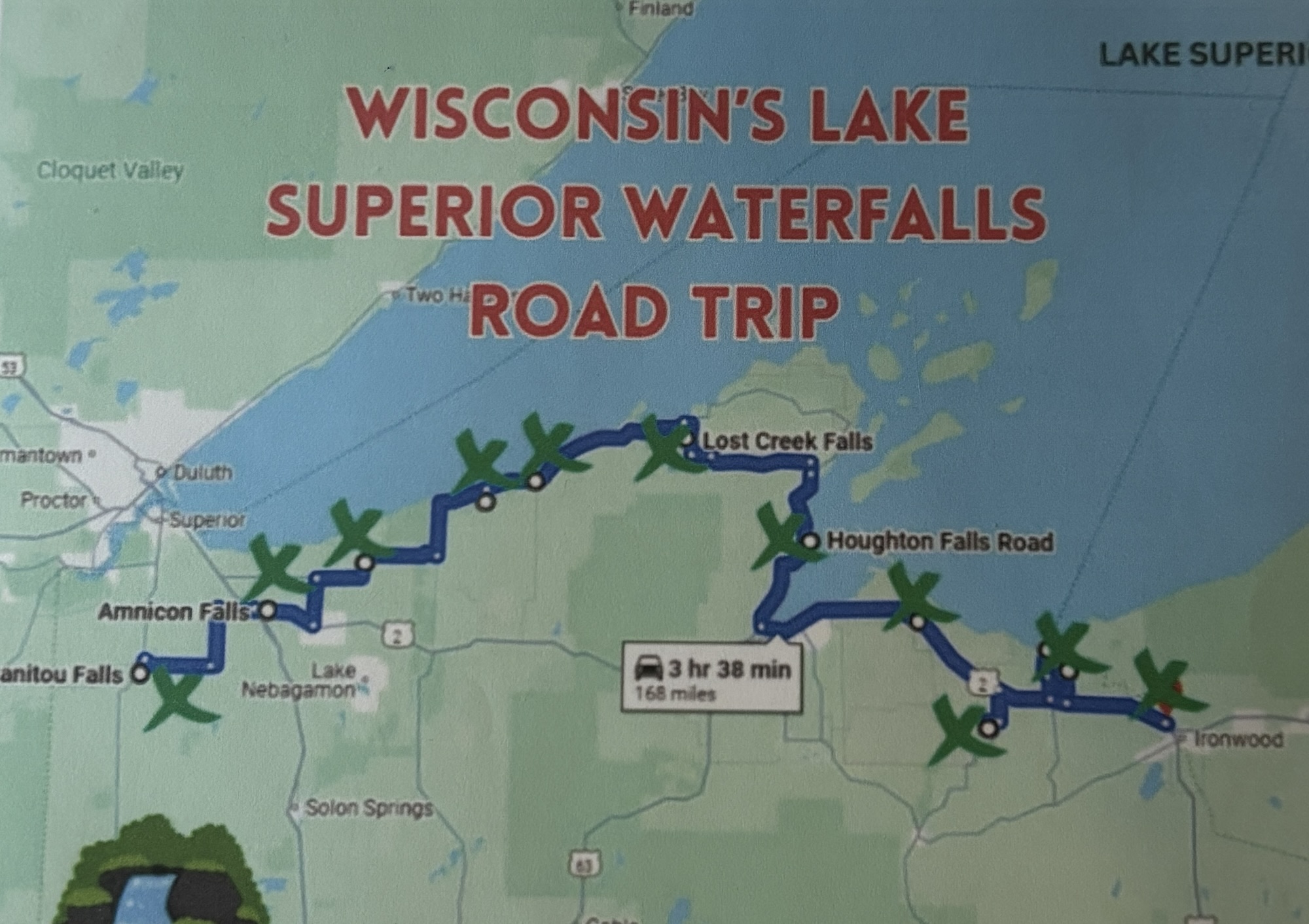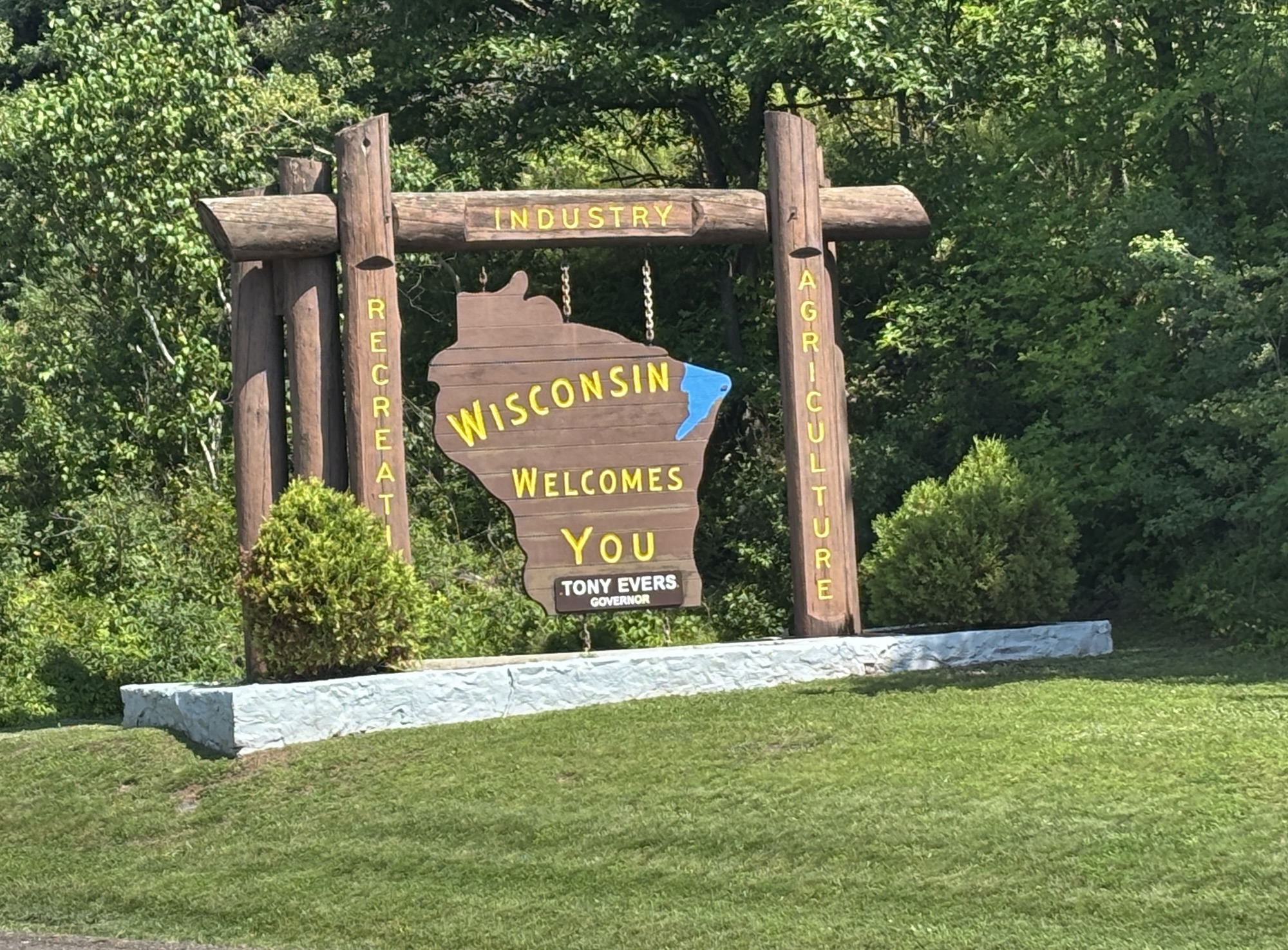 From Escanaba, we headed more west on Hwy 41&2 until they split, and Hwy 2 continued on to Iron Mountain, MI and then to Spread Eagle where we crossed the border into Wisconsin and the time zone to Central Time.