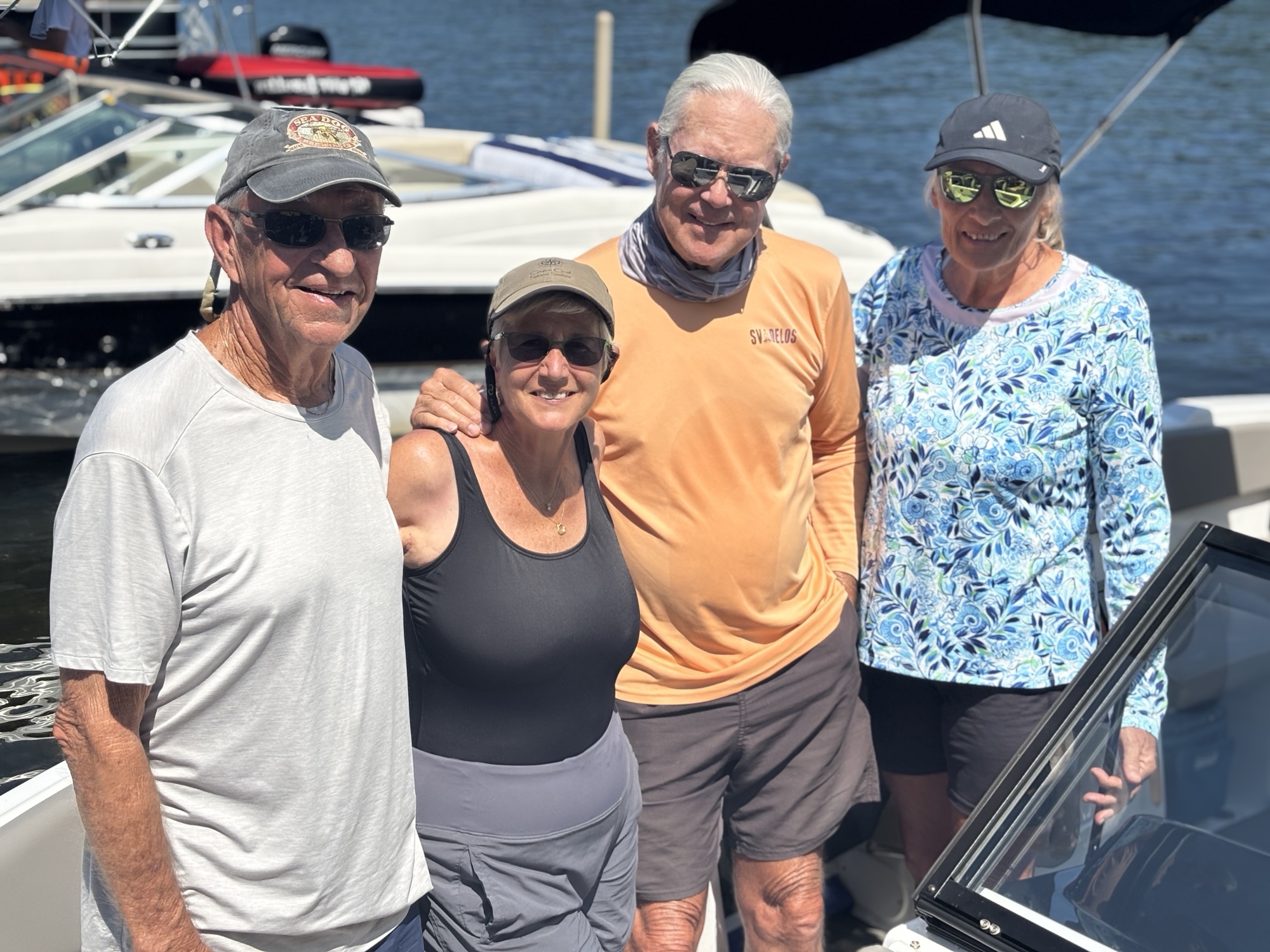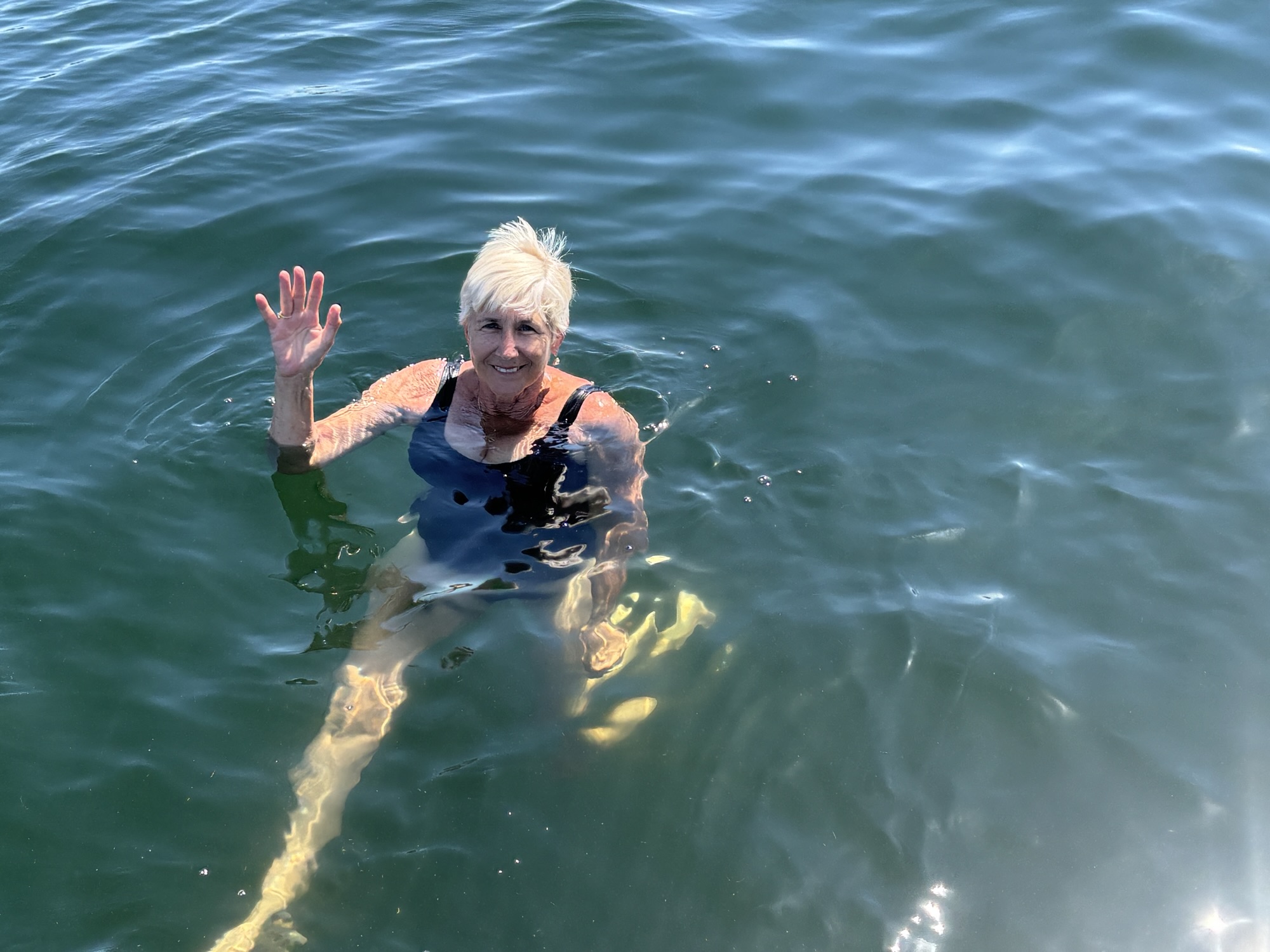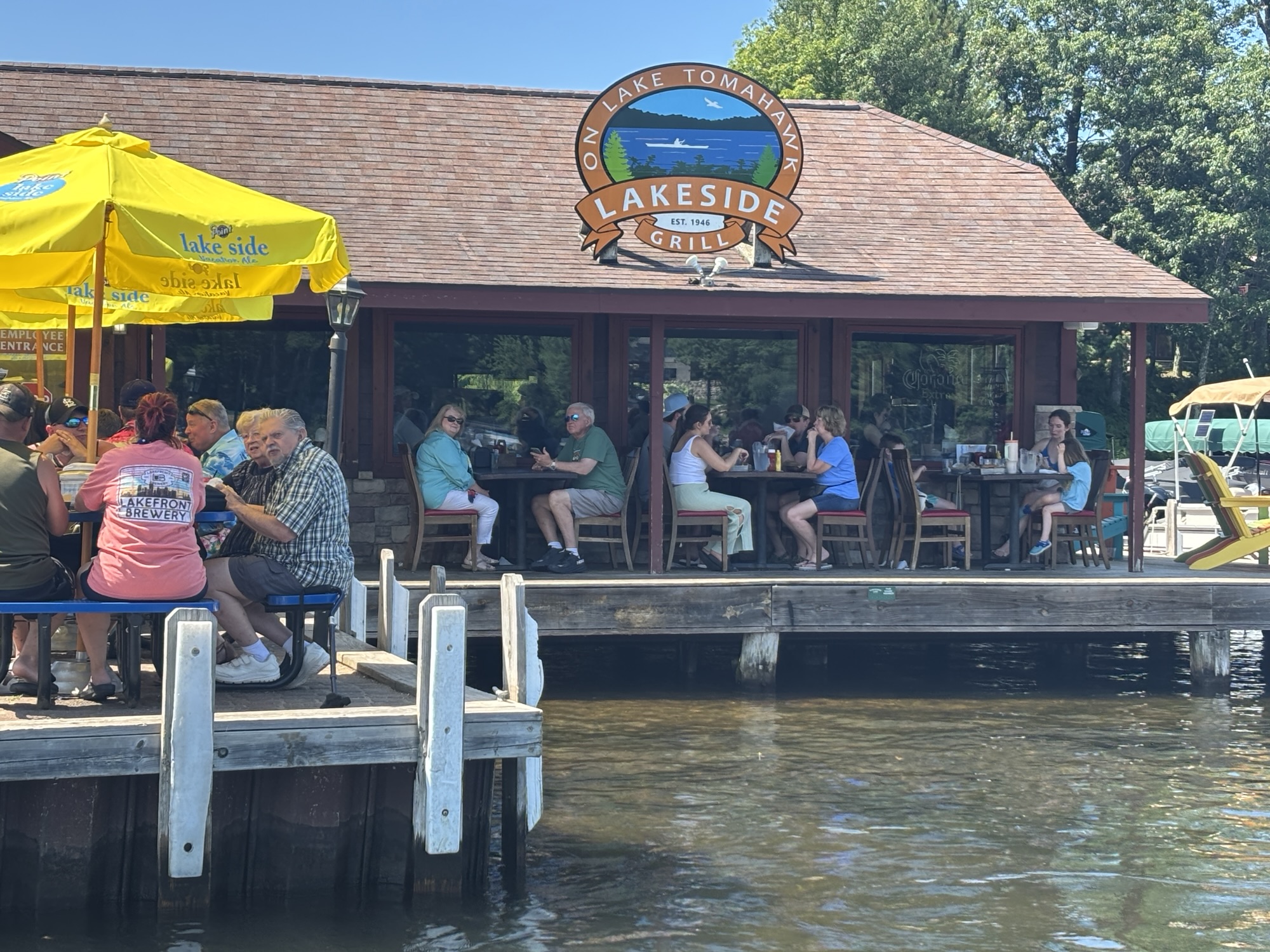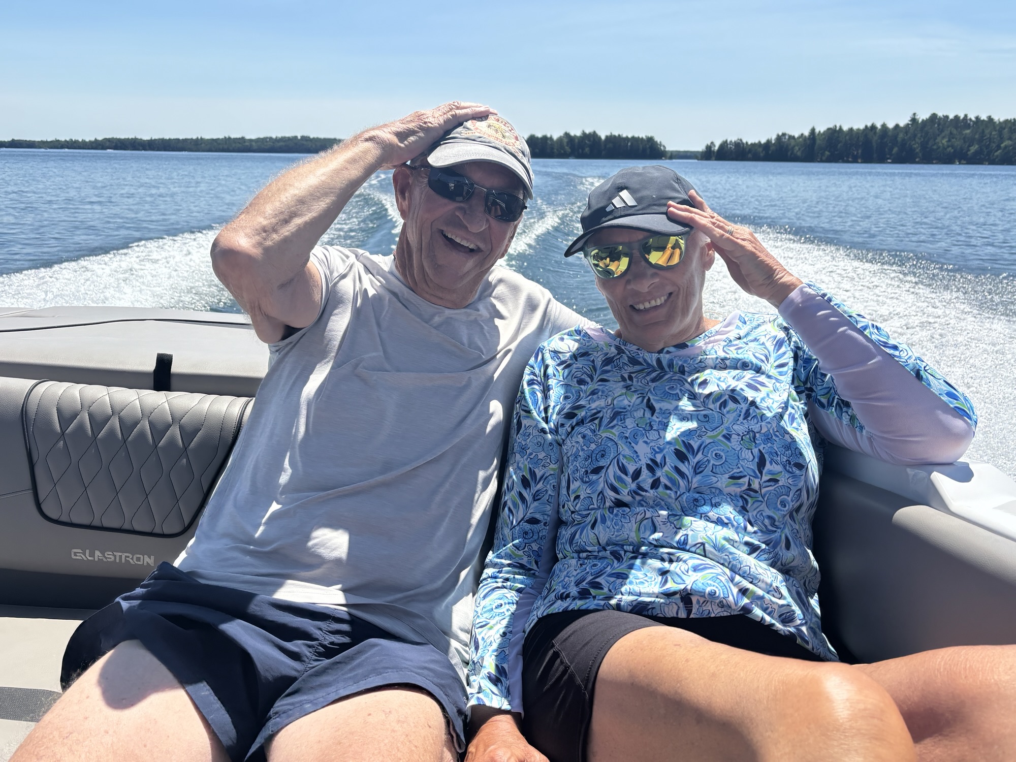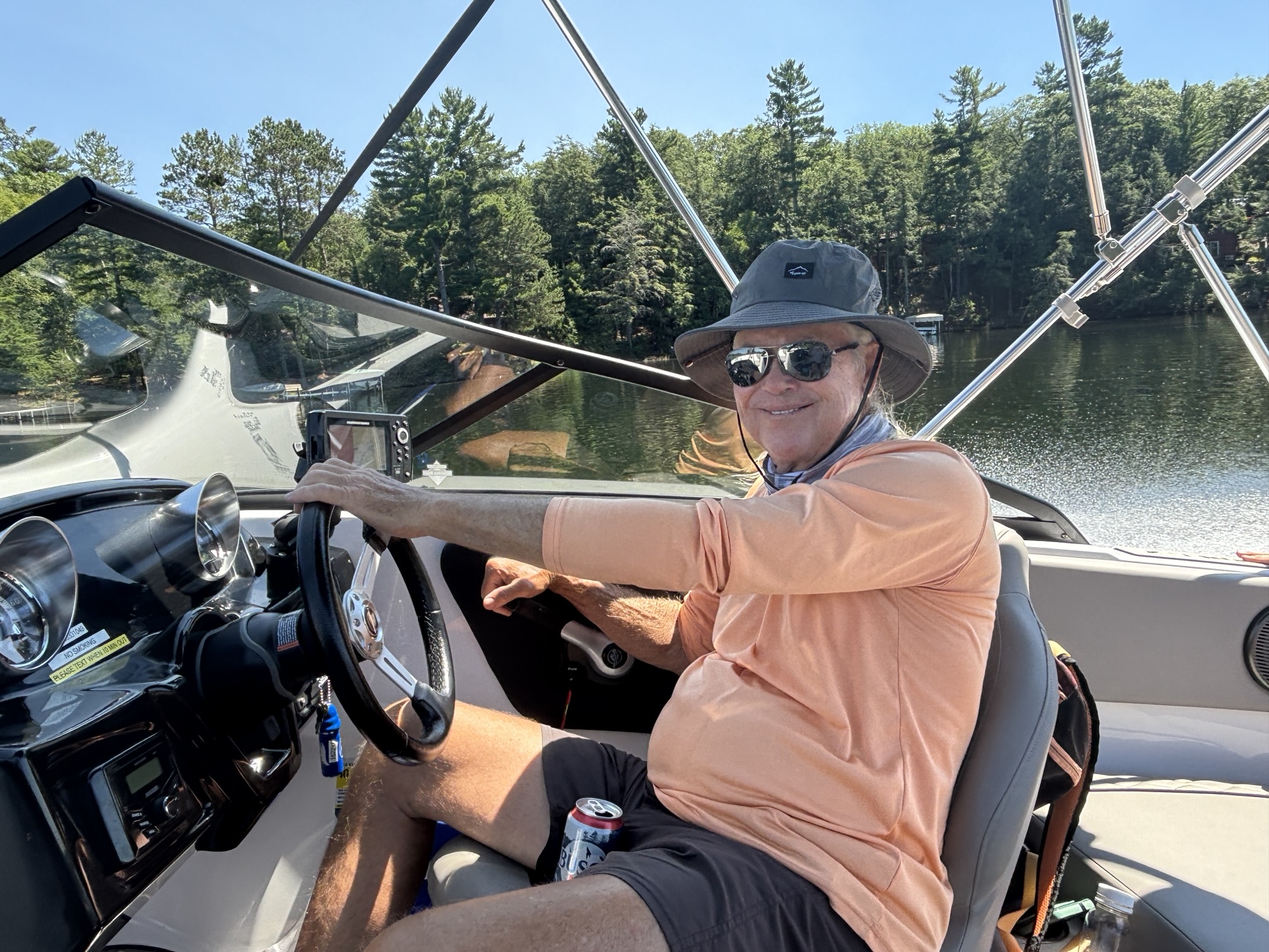 Deb and Chuck belong to a boat club that allows you to take boats out on many lakes throughout the US, so they arranged to have a 20 ft. ski boat for the day, and we took off touring the lakes. In Minocqua, there are several interconnected lakes to explore. We started on Lake Minocqua and headed to Tomahawk Lake. After a few hours of enjoying being on the water, we stopped for lunch at the Lakeside Grill. Then more exploring with a quick stop for Gail to jump in! She always says a boat is to take her someplace she can get into the water!