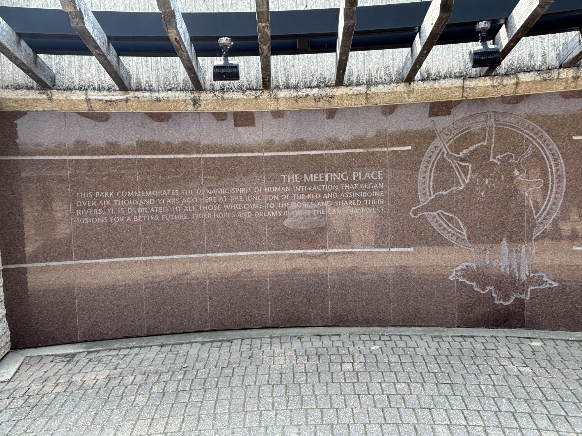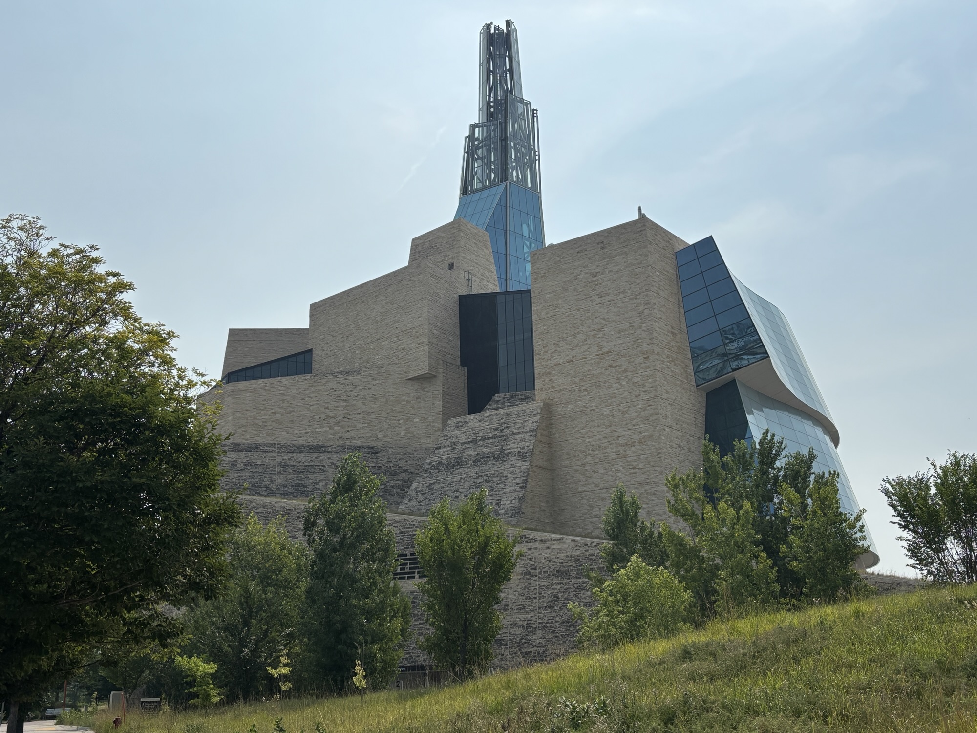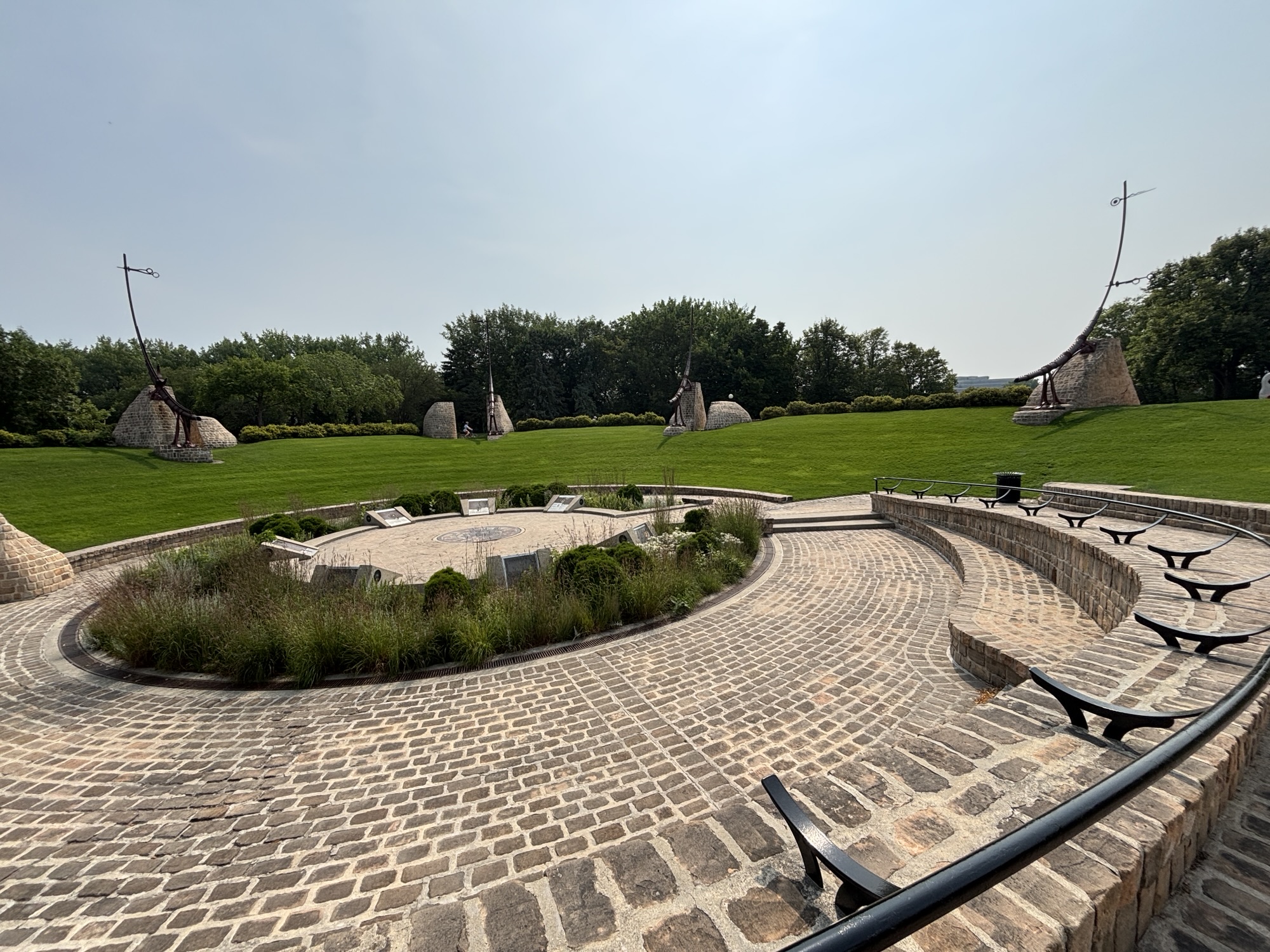 Then we headed to the Forks downtown. This is a Canadian National Park area downtown where the two rivers come together. The Assiniboine and the Red Rivers. This forms the Fork. It is a market and nice walking area that has some interesting displays like the Oodena Celebration Circle. It is described as a “naked eye observatory” which is a series of structures that have star sighting features that pinpoint stars in certain constellations at specific times of the year. And highlights their significance to the region’s history. There is the Canadian Museum for Human Rights which we did not have time to visit, but the architecture was fascinating.