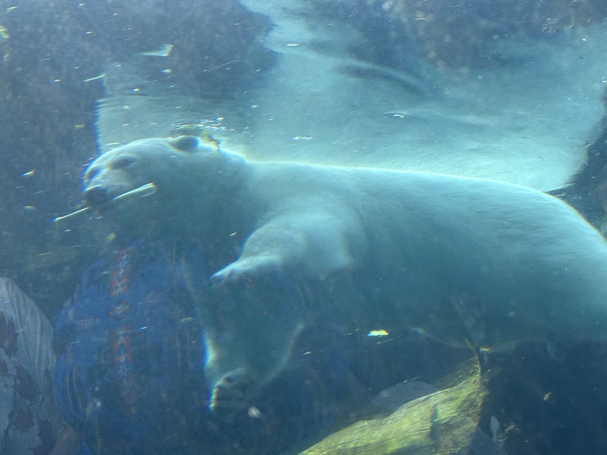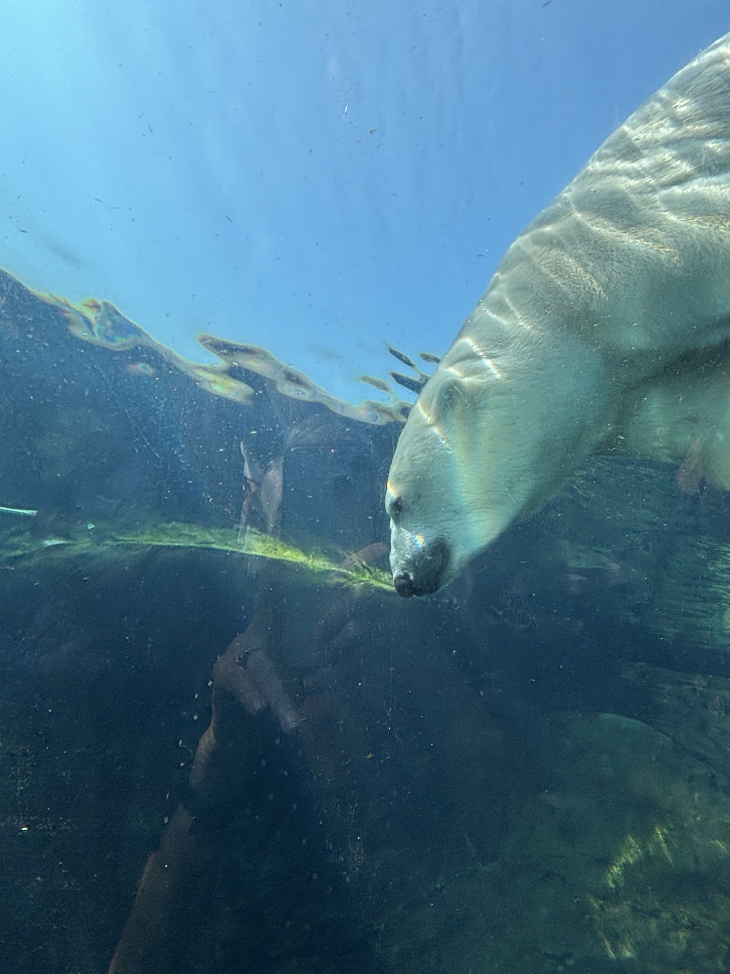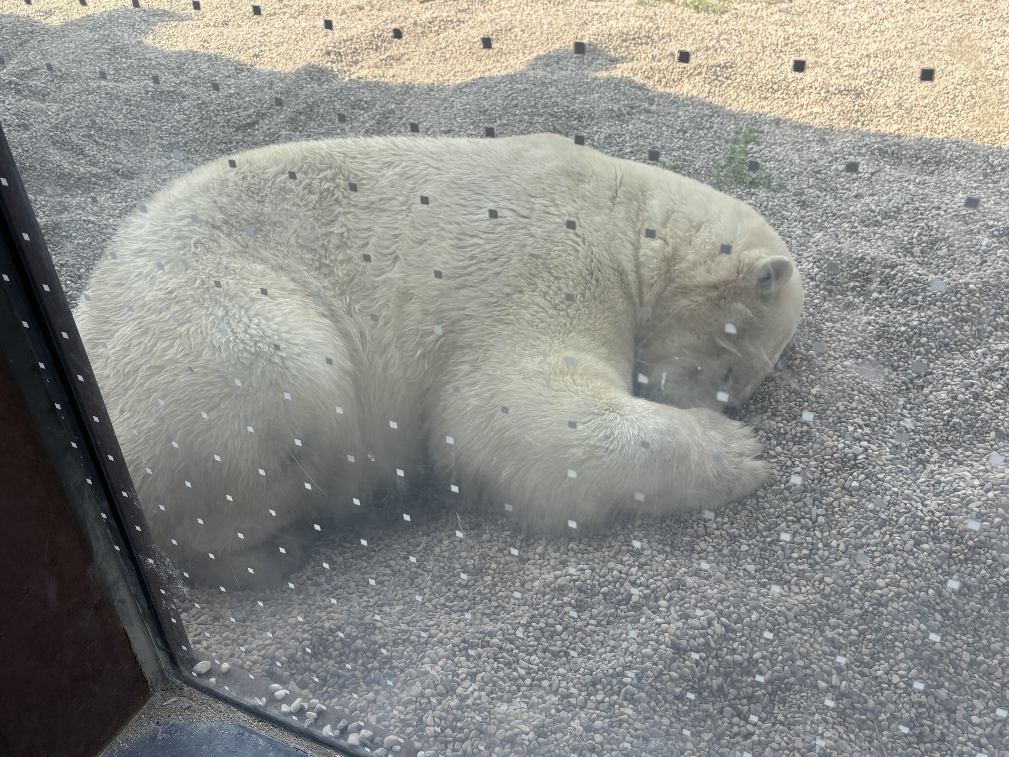 The polar bear pavilion is very large and features a pool where the bears can play and interact with the people below in a clear tunnel. And we were lucky enough to get a full show! Other bears were outside and visible from a viewing area, but they were sleeping.