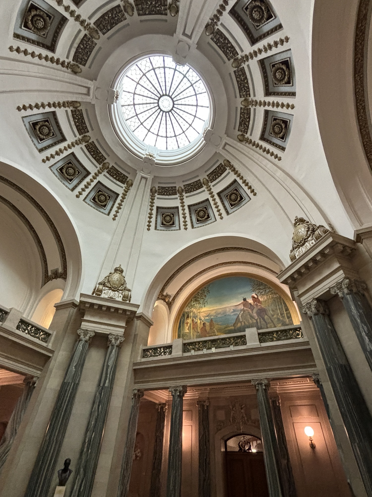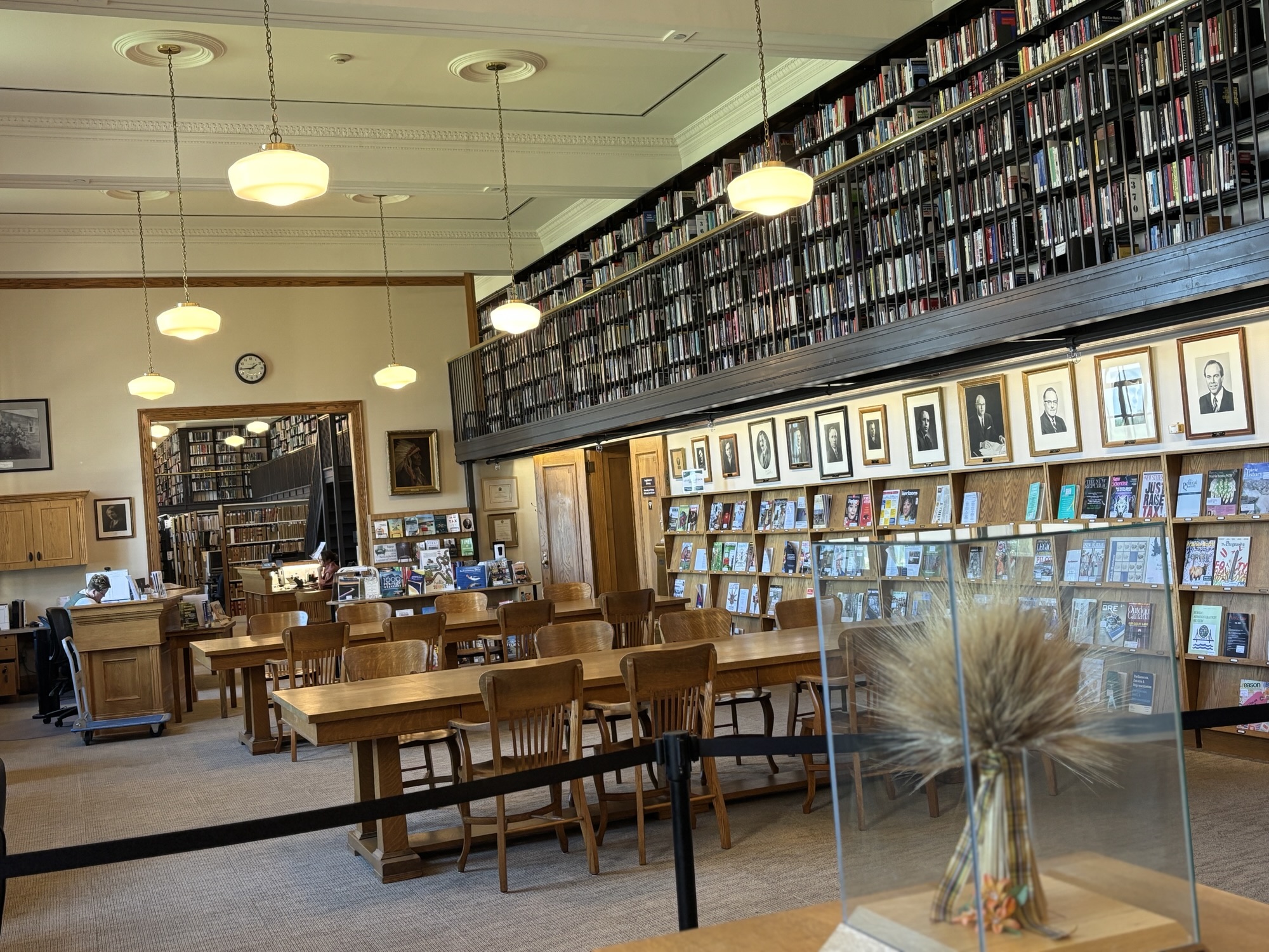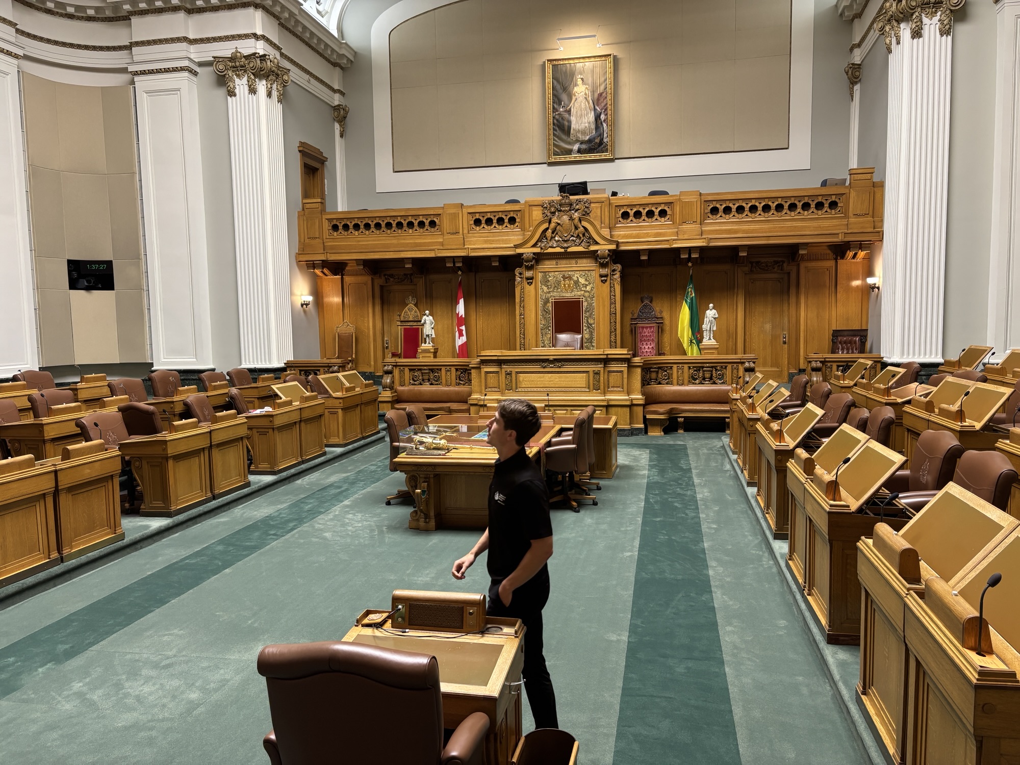 We then headed downtown to the legislature building. Saskatchewan became a province in 1905, and the building was built between 1909 and 1912. They only have 1 legislative body, and they move the desks around as needed depending on who is the majority party after an election. The tour included the rotunda, the actual house chambers, the library (open to anyone for research), and photo galleries. They have a portrait of all the past Saskatchewan premiers and all past lieutenant governors. The premier’s paintings are done when they first enter office, and the premier can choose the artist and setting for the painting. However, they do not hang them in the gallery until they leave the office.