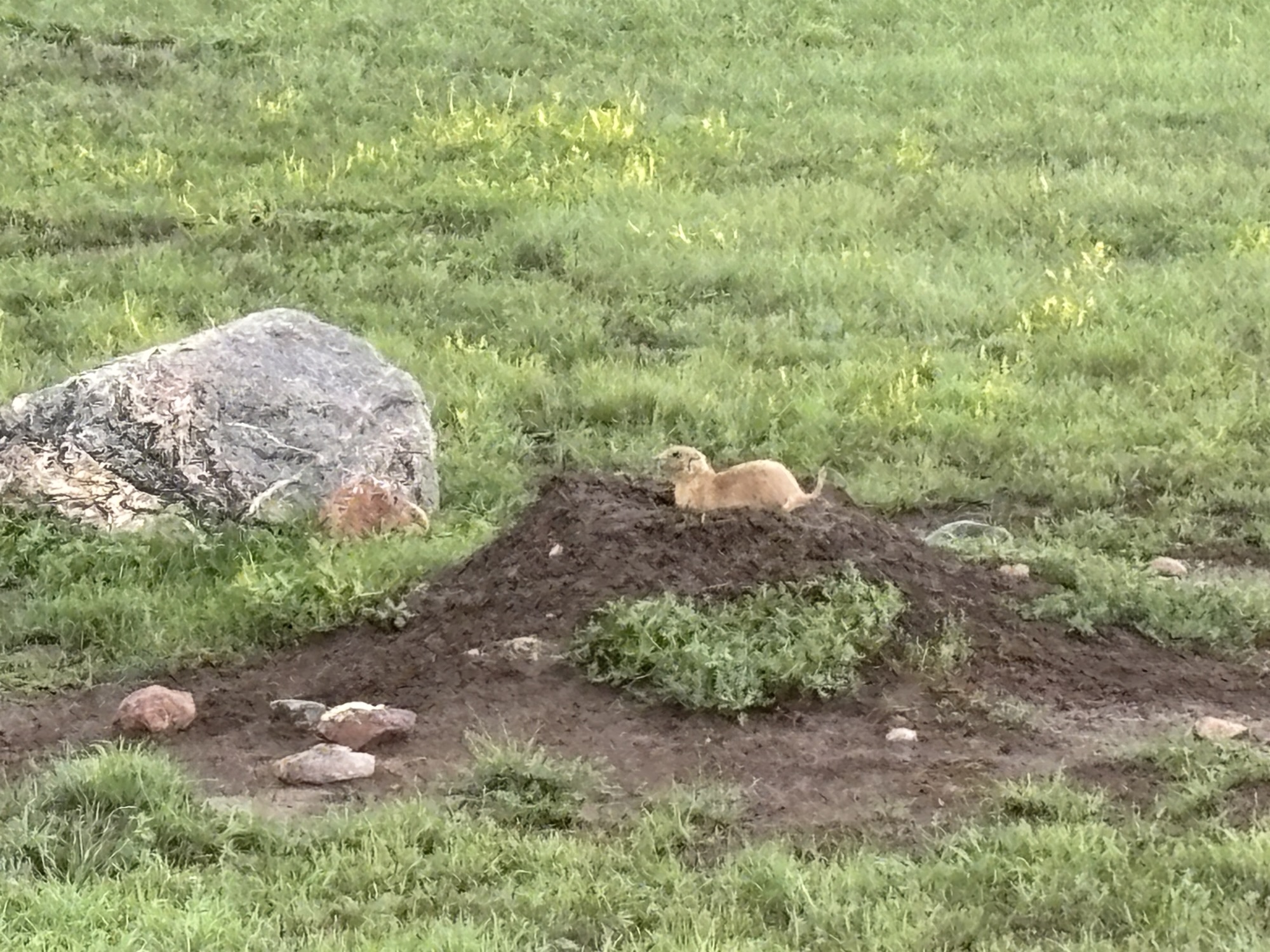 However, even though it was cool and drizzly, we did the Ecological drive through the park and learned about the different grasses including Blue Grama and Needle and Thread and their importance to the area. There are 7 interpretive stops throughout the park and most involve a short walk. And within the park, there is a large heard of Bison, over 900, but we did not see any. We were told they were in a remote part of the park. But we did see a lot of prairie dogs!