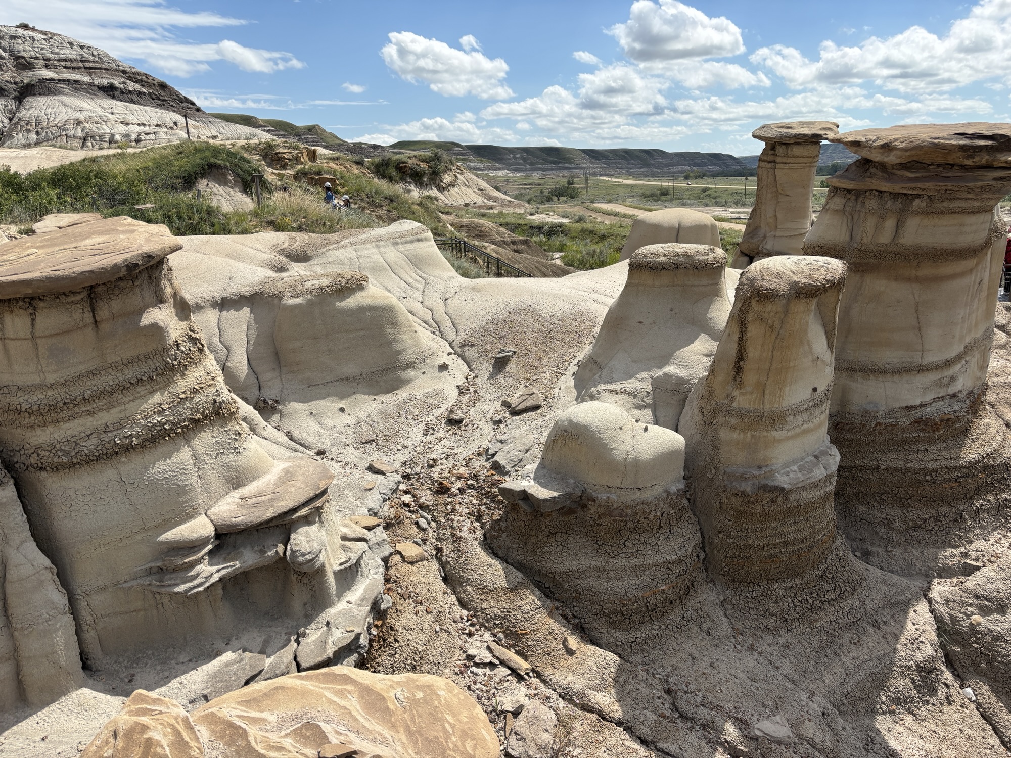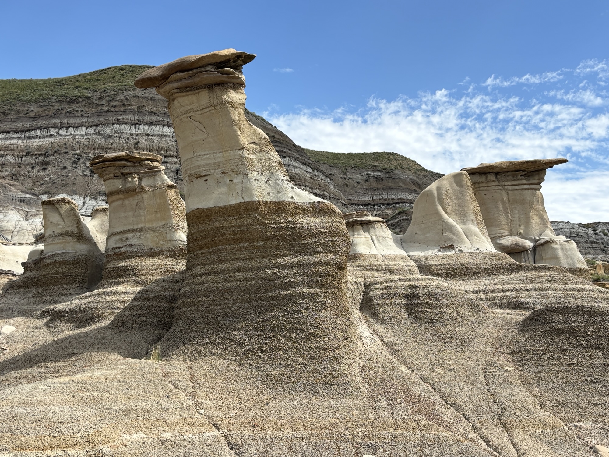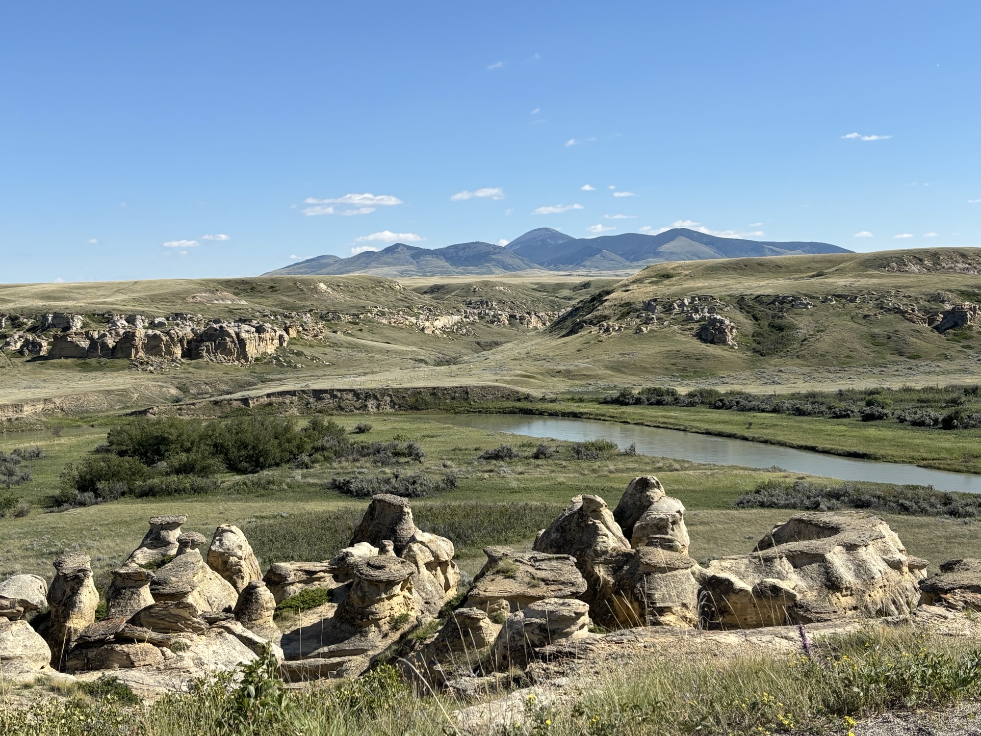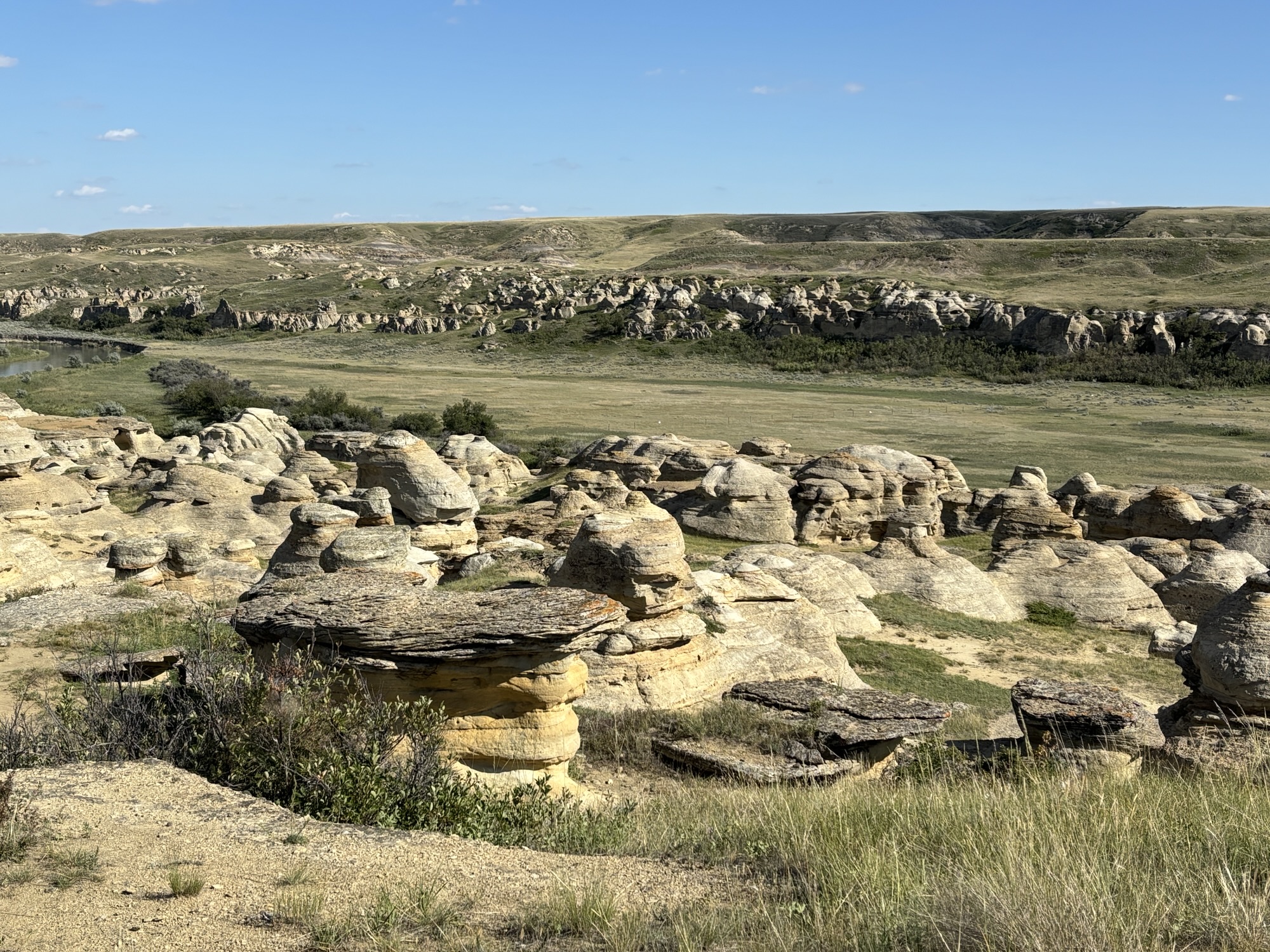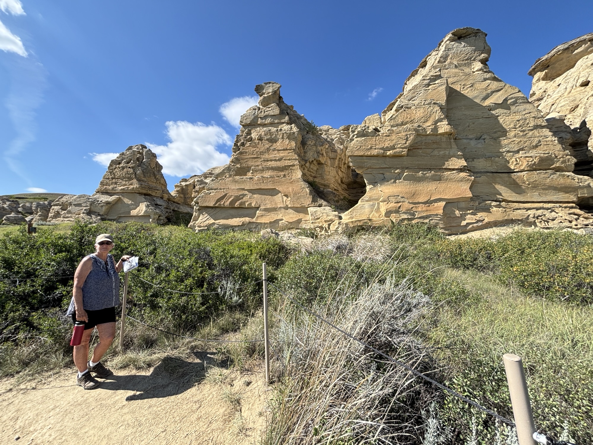 Our next stop was Writing on Stone Provincial Park, a UNESCO World Heritage site. The park is known for its unique landscape and the rock art preserved there. And this was our first view of the hoodoos. These are pillars of rock that look like something out of a fantasy world that are formed by a process of erosion and weathering. Hoodoos typically consist of relatively soft rock topped by harder, less easily eroded stone that protects each column from the elements.