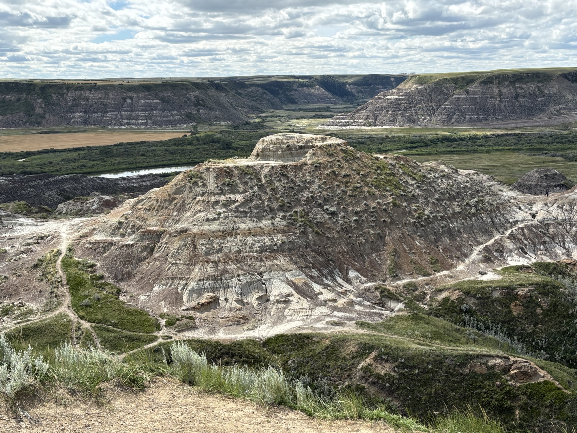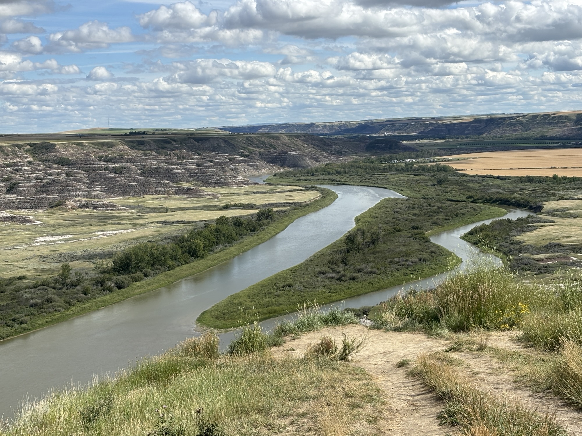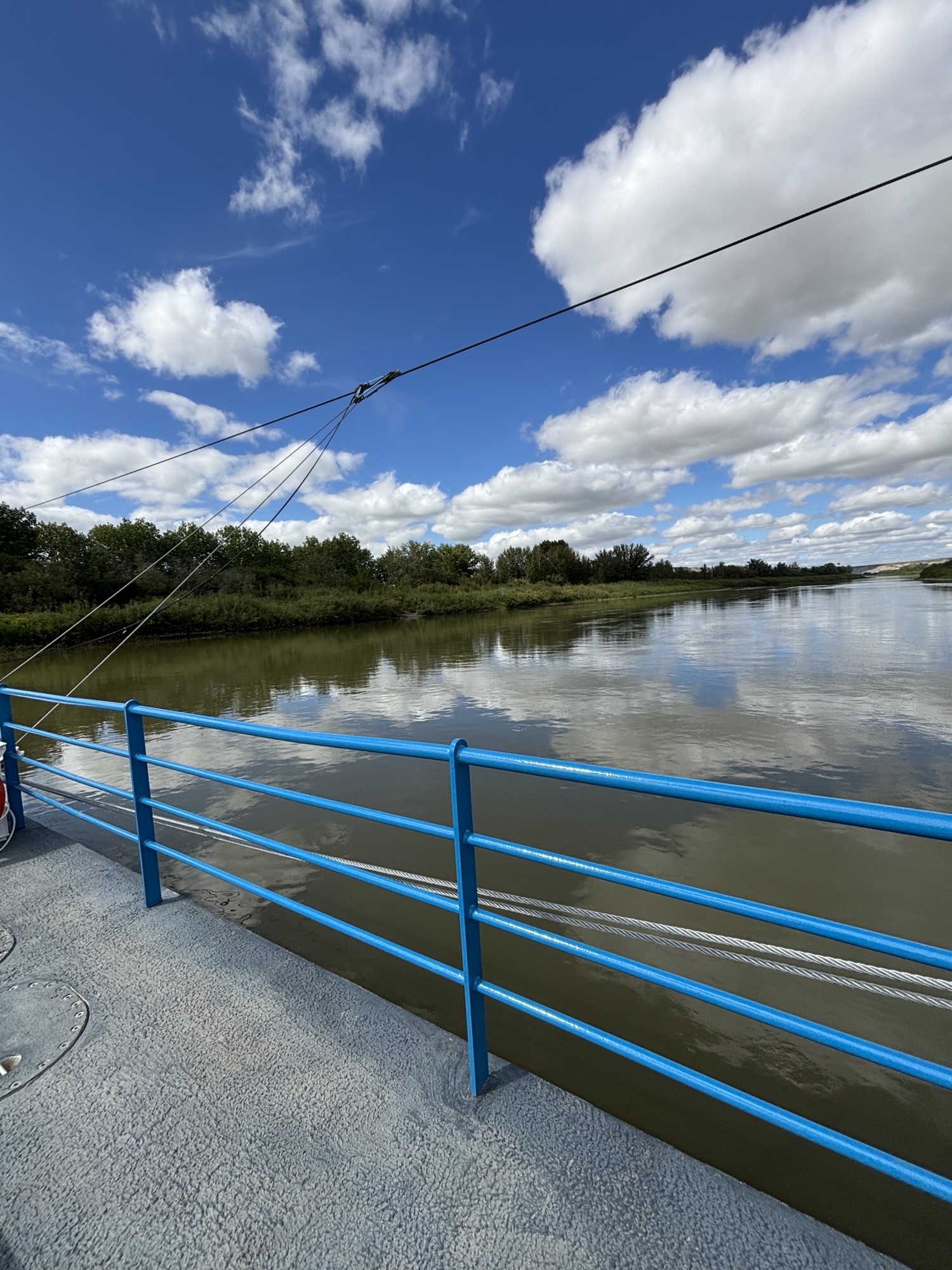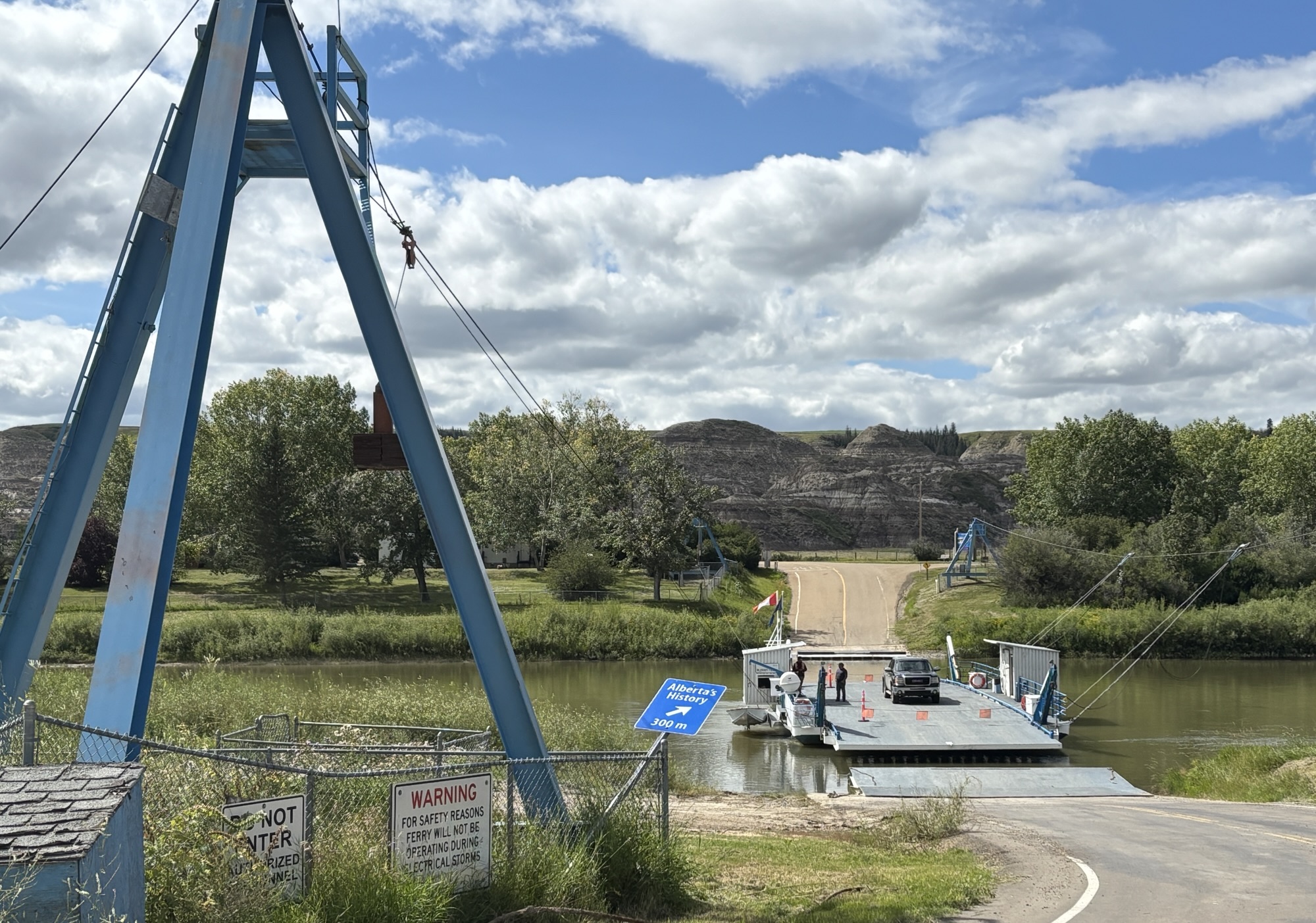 Further down is a small cable ferry (the Bleriot Ferry) that will take you across the Red Deer River in just under 6 minutes. We never pass up a chance to go on a ferry. Of course in this case we were driving a loop and the only alternative to the ferry was to backtrack (which we avoid whenever possible).