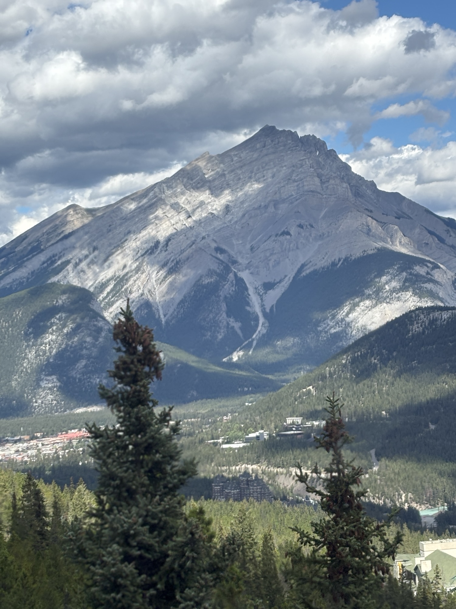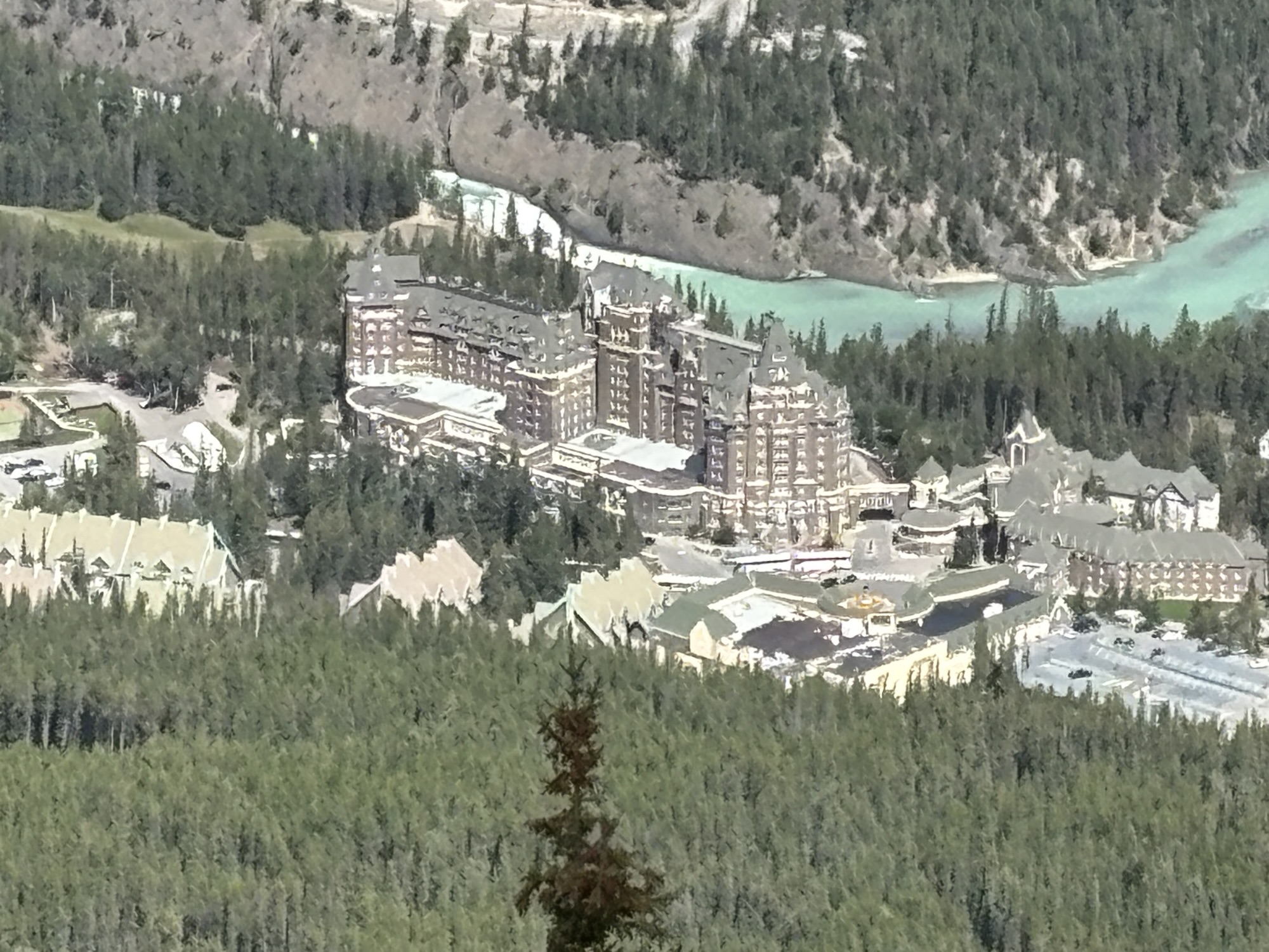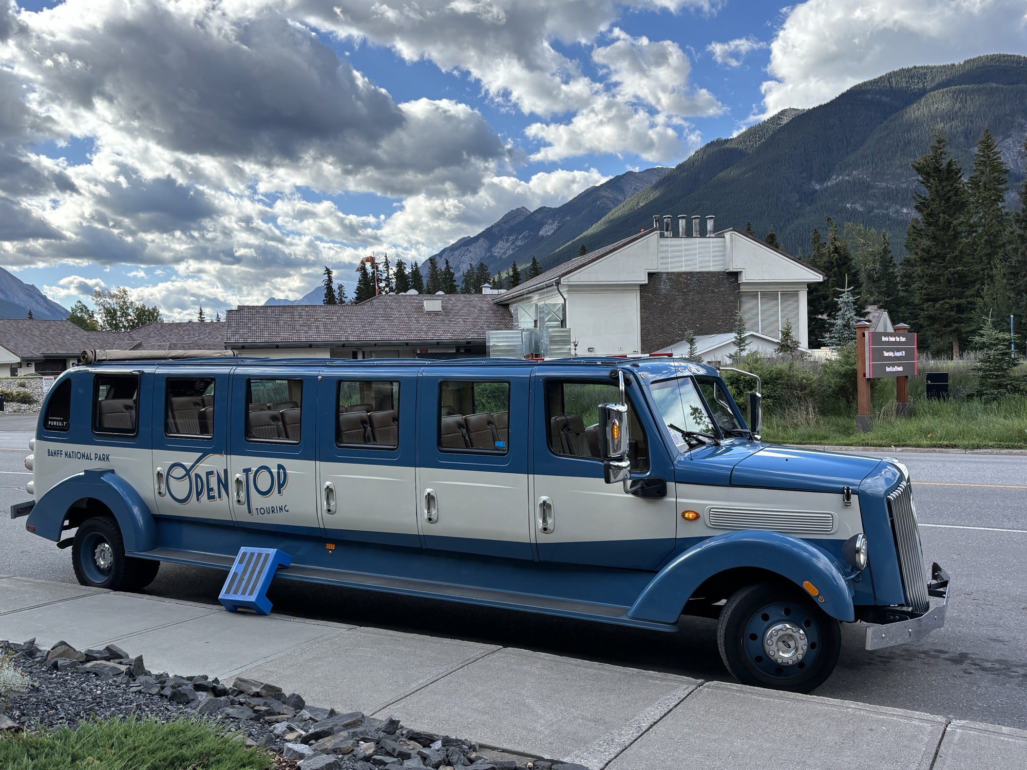 We had picked the Open Top Tour around Banff as our first ticket. This is a tour not of the town but of the surrounding area in an open roof replica of a 1930’s touring car that had been used when the tours started. But ours was a new-ish Ford chassis that seated about 20 guests, and each row had an open roof for the view. Our tour guide, Lucas, was dressed in a period outfit as a Swiss Mountain Guide who were some of the first guides to come to the area for the mountain climbers.