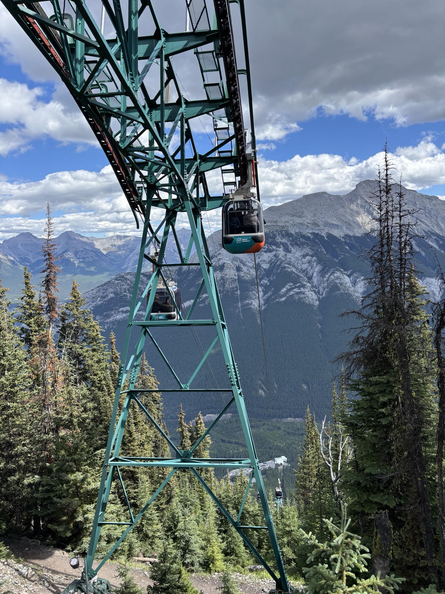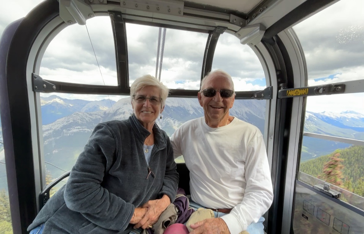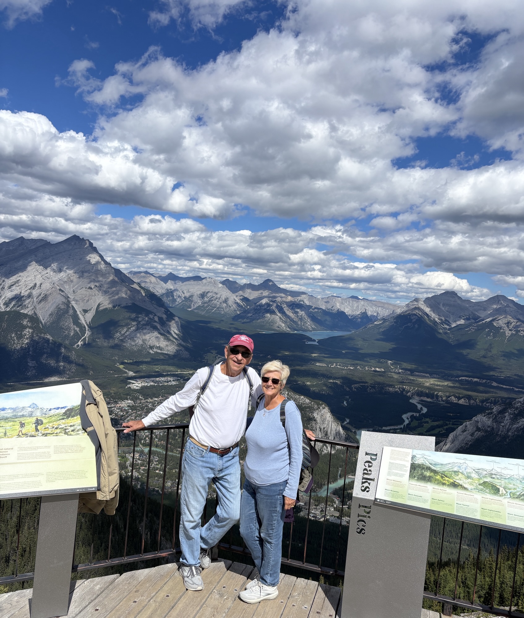 In the afternoon, we had tickets to the Banff Gondola that takes you to the summit of Sulfur Mountain. It’s an 8-minute ride up in an enclosed gondola with 4 people. So, being just the 2 of us, we hooked up with another couple in the line and rode up together. And it was a friendly ride, and we had a nice chat on the way up, but the other lady, being afraid of heights, would not look at the view and just stared at me the whole way.