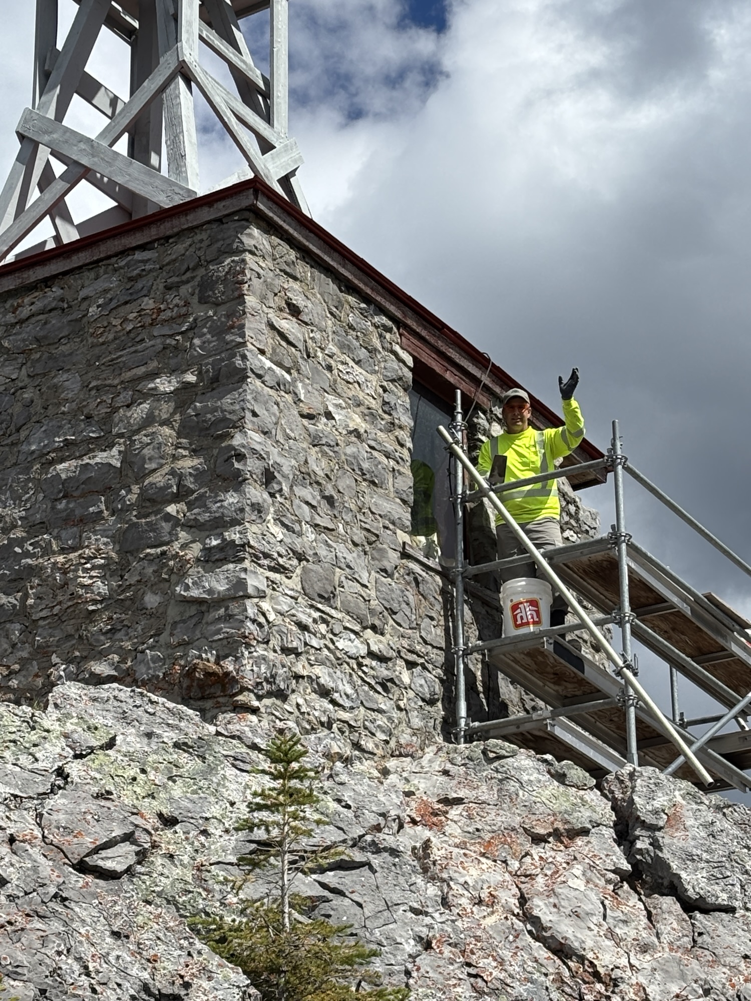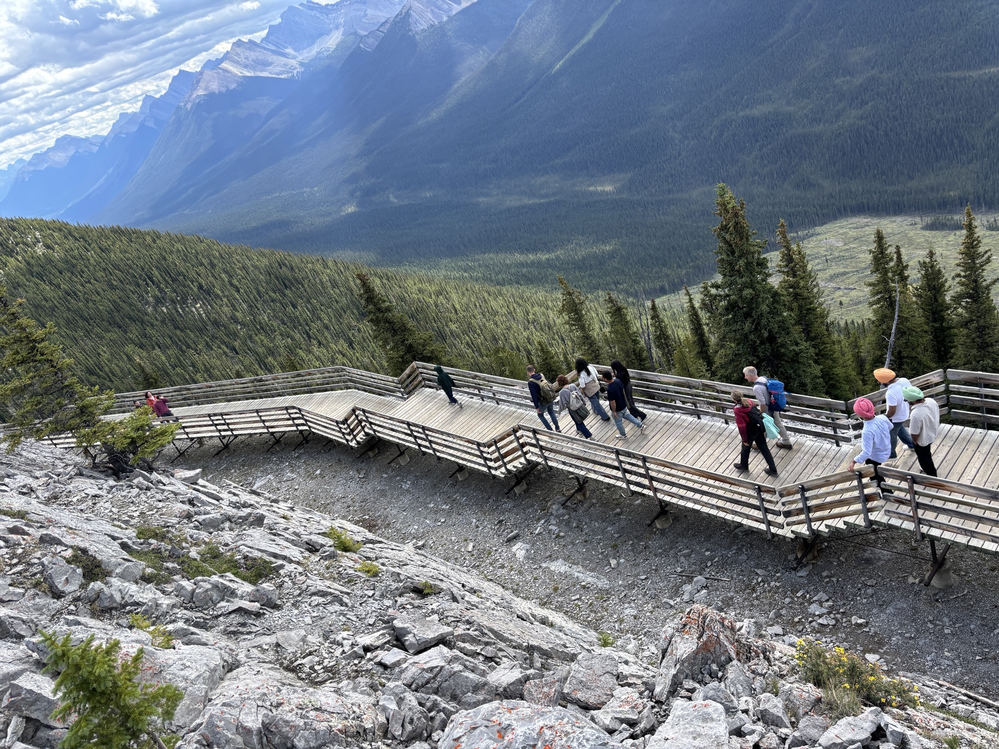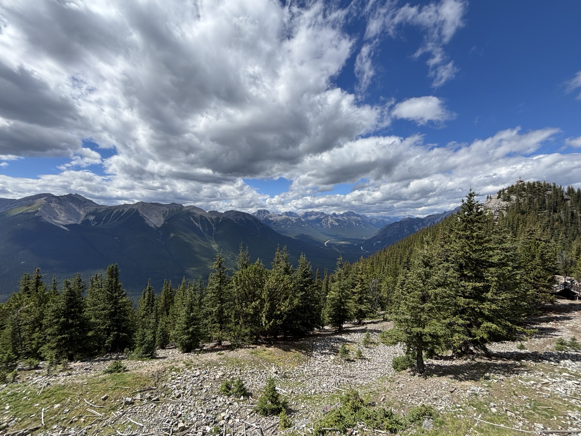 In the afternoon, we had tickets to the Banff Gondola that takes you to the summit of Sulfur Mountain. It’s an 8-minute ride up in an enclosed gondola with 4 people. So, being just the 2 of us, we hooked up with another couple in the line and rode up together. And it was a friendly ride, and we had a nice chat on the way up, but the other lady, being afraid of heights, would not look at the view and just stared at me the whole way.