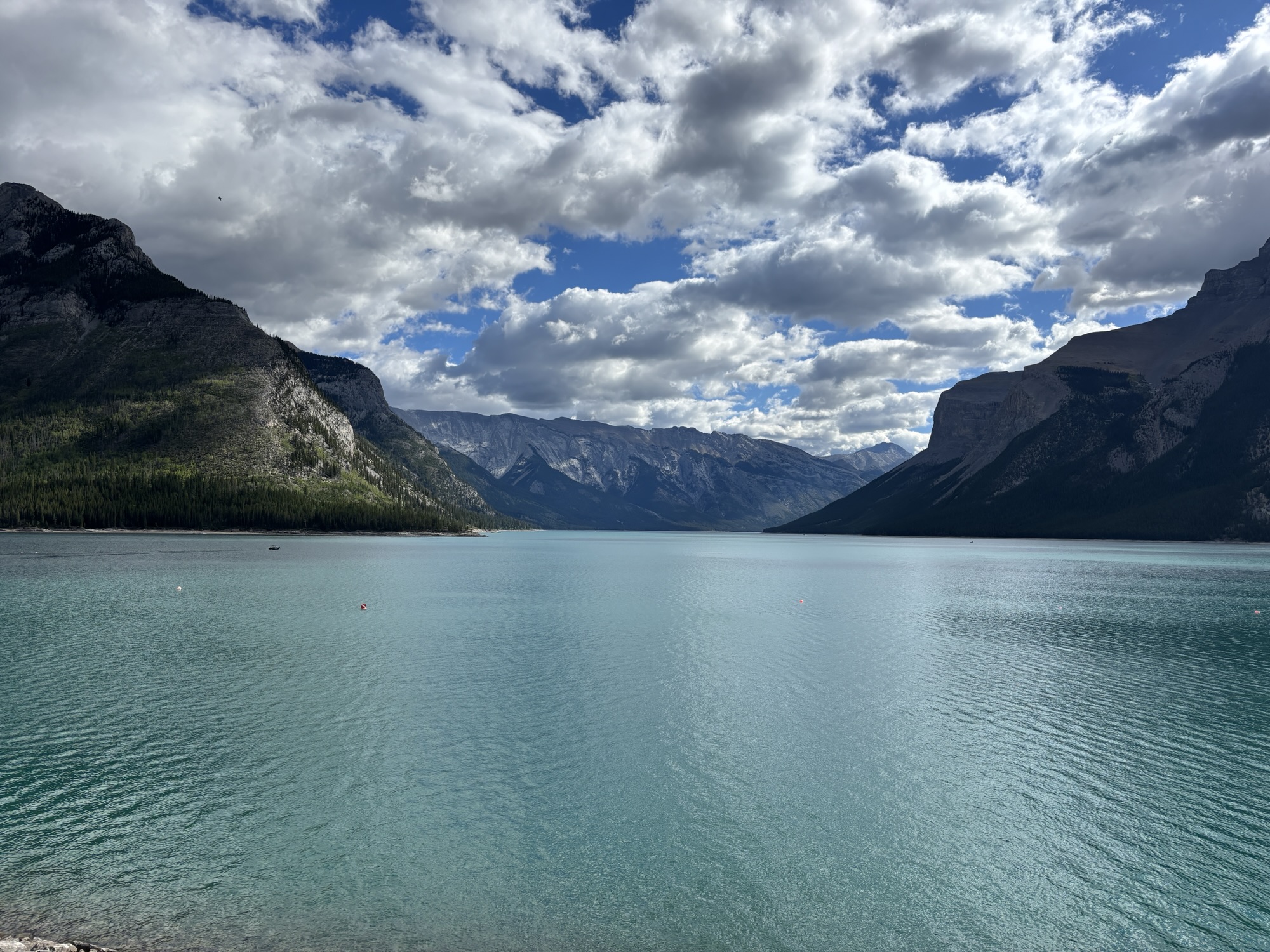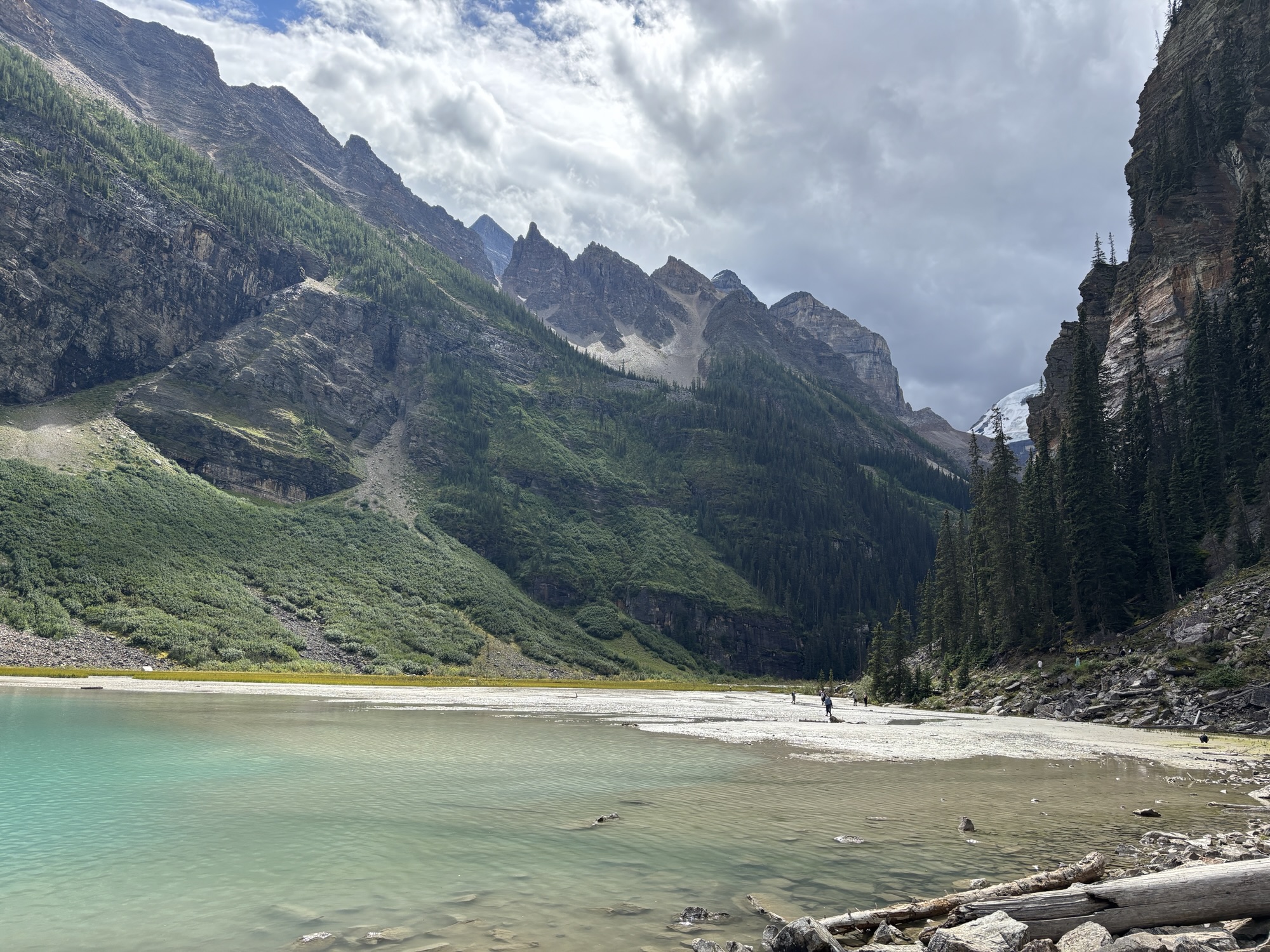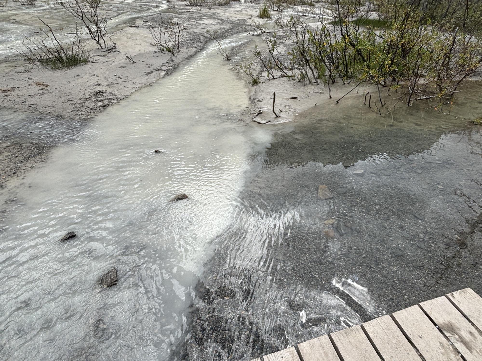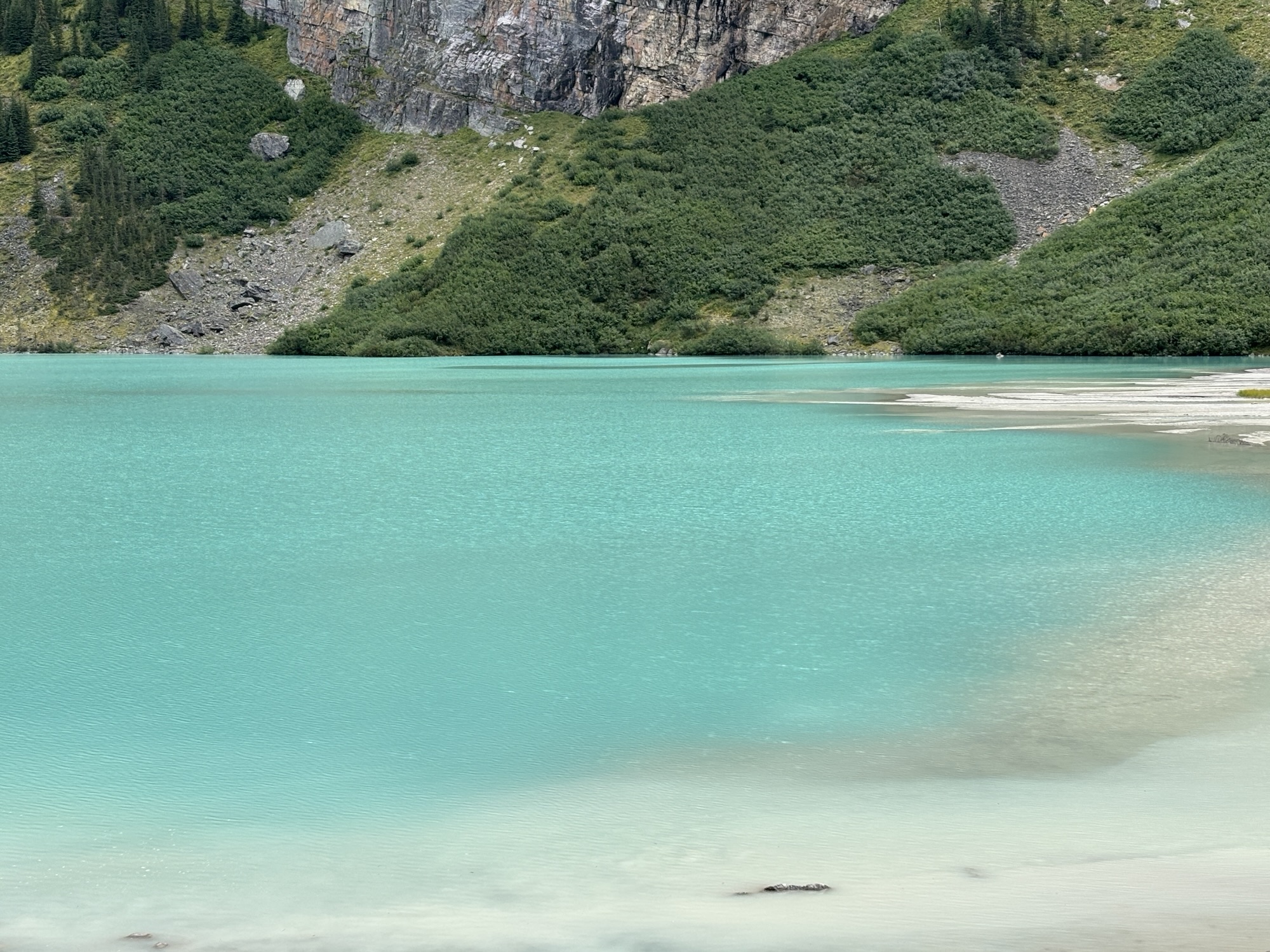 We took the shoreline hike just like at Lake Moraine. At the other end you see why the color of the water is so different. As the glacial water flows down the mountain, it brings a silt with it and turns the water into a milky, light turquoise. Here you can see where the glacial water and normal clear spring water come together and start to mix. Very interesting.