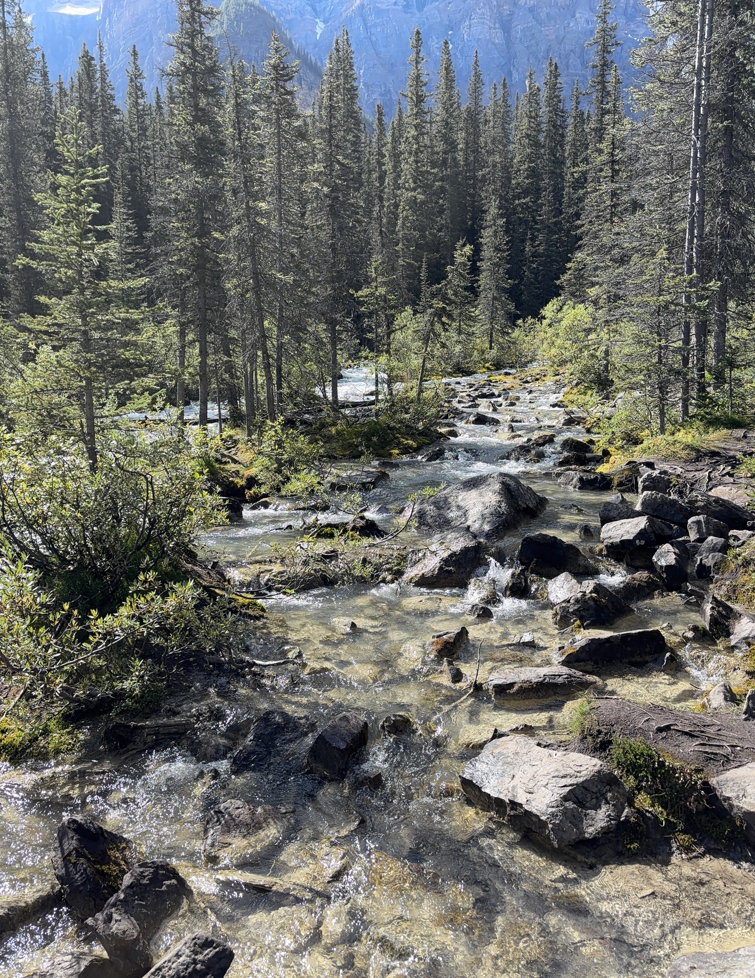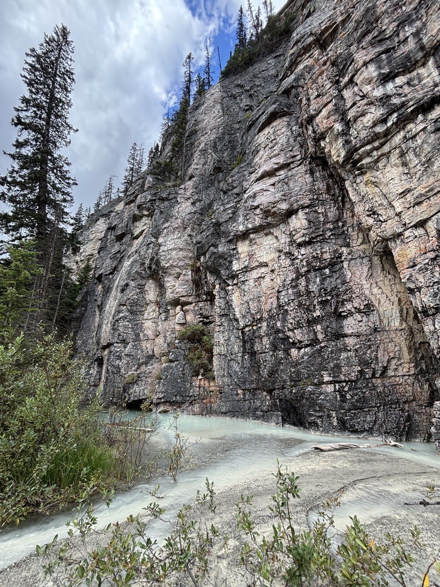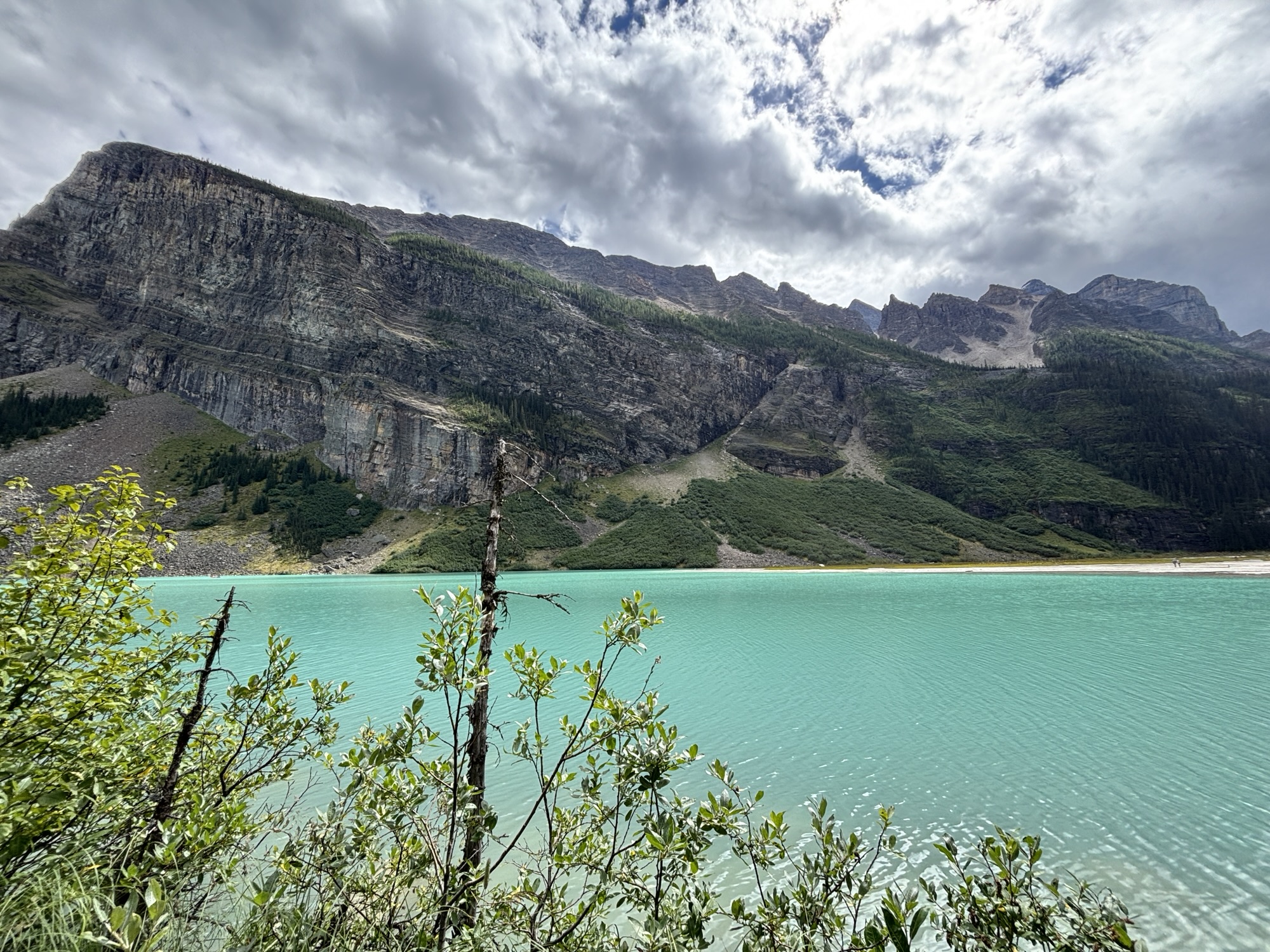 We took the shoreline hike just like at Lake Moraine. At the other end you see why the color of the water is so different. As the glacial water flows down the mountain, it brings a silt with it and turns the water into a milky, light turquoise. Here you can see where the glacial water and normal clear spring water come together and start to mix. Very interesting.
