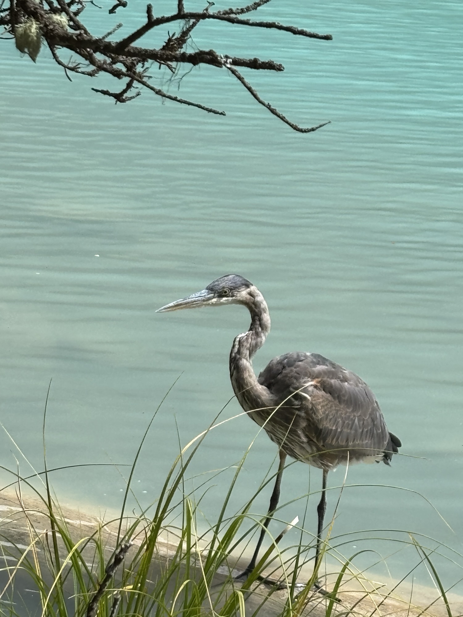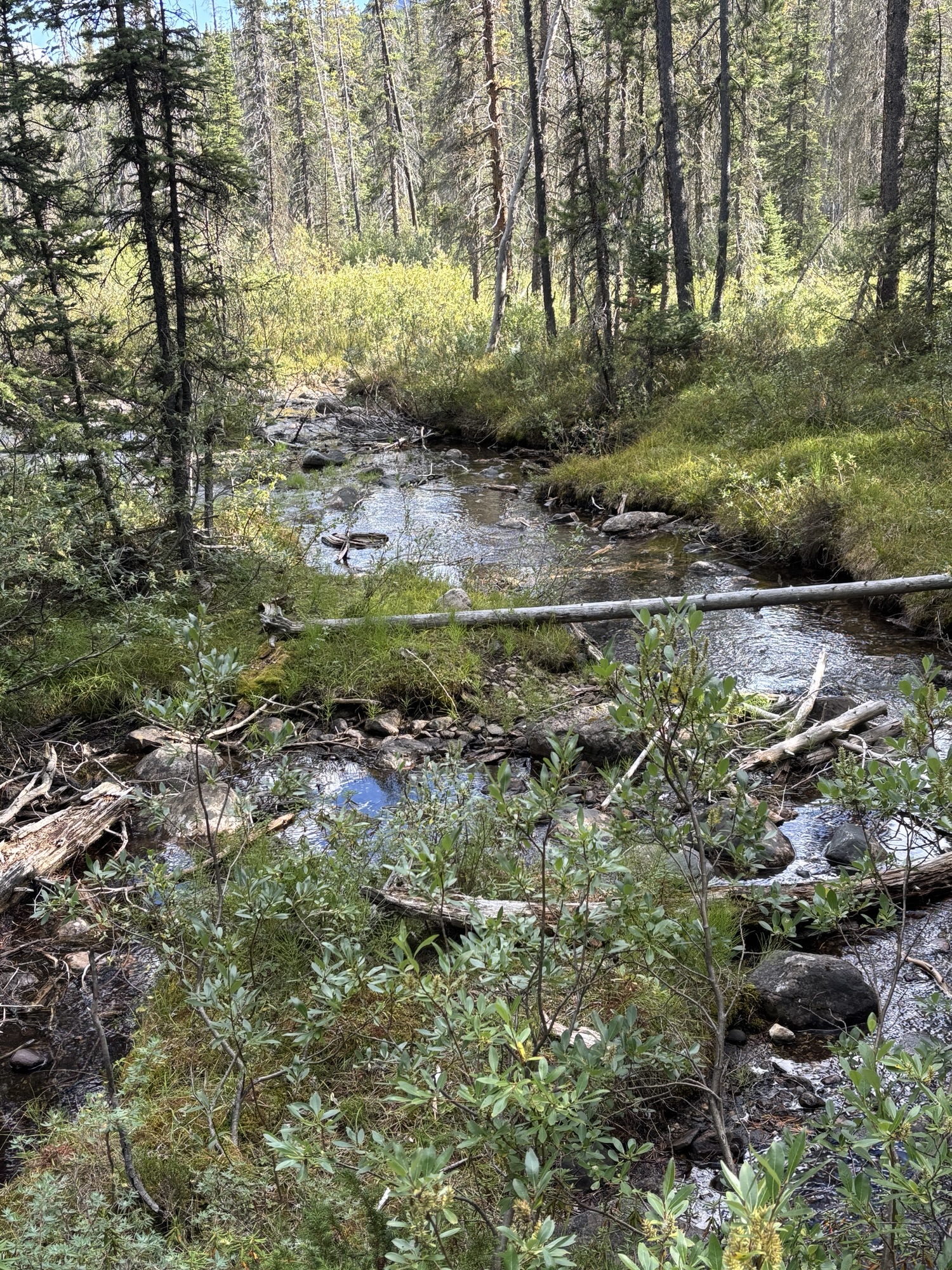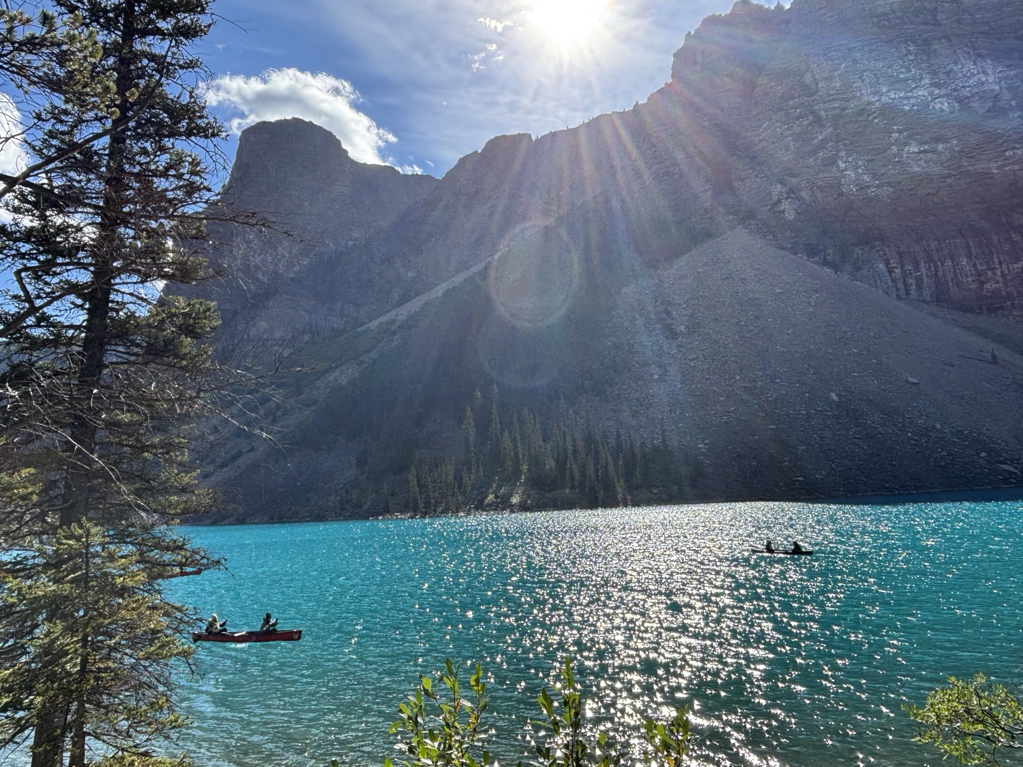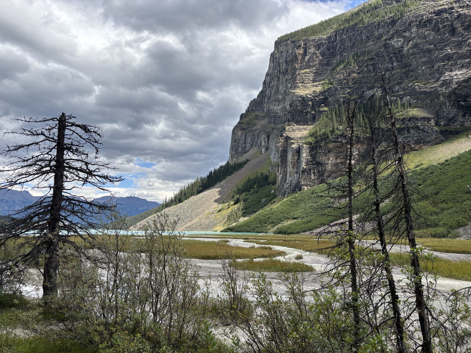 We took the shoreline hike just like at Lake Moraine. At the other end you see why the color of the water is so different. As the glacial water flows down the mountain, it brings a silt with it and turns the water into a milky, light turquoise. Here you can see where the glacial water and normal clear spring water come together and start to mix. Very interesting.