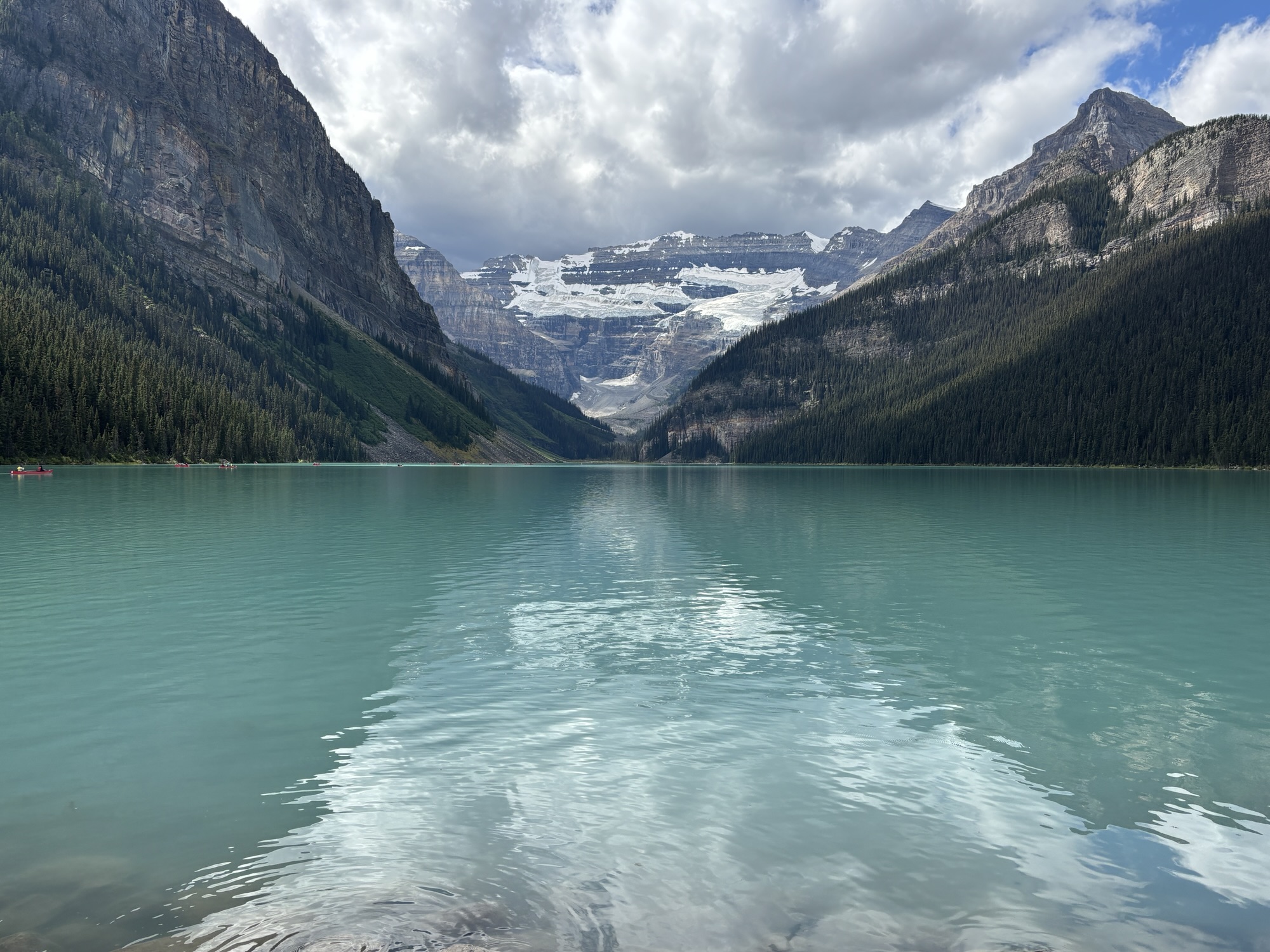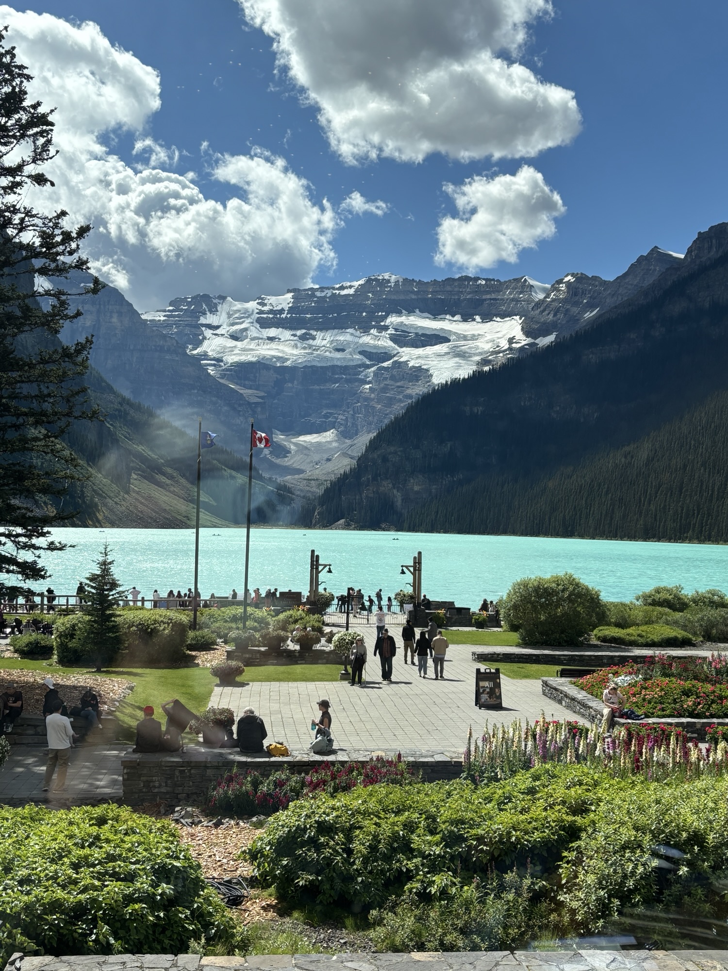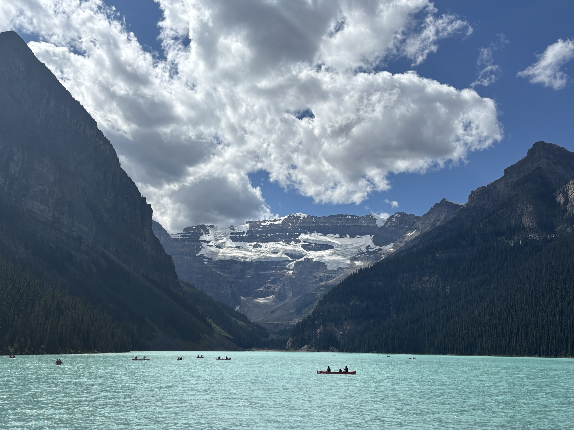 The other main feature at the entrance is the Fairmont Chateau Hotel. But the real attraction of the lake is the color of the water and the majesty of the glacier at the other end! The view is majestic!