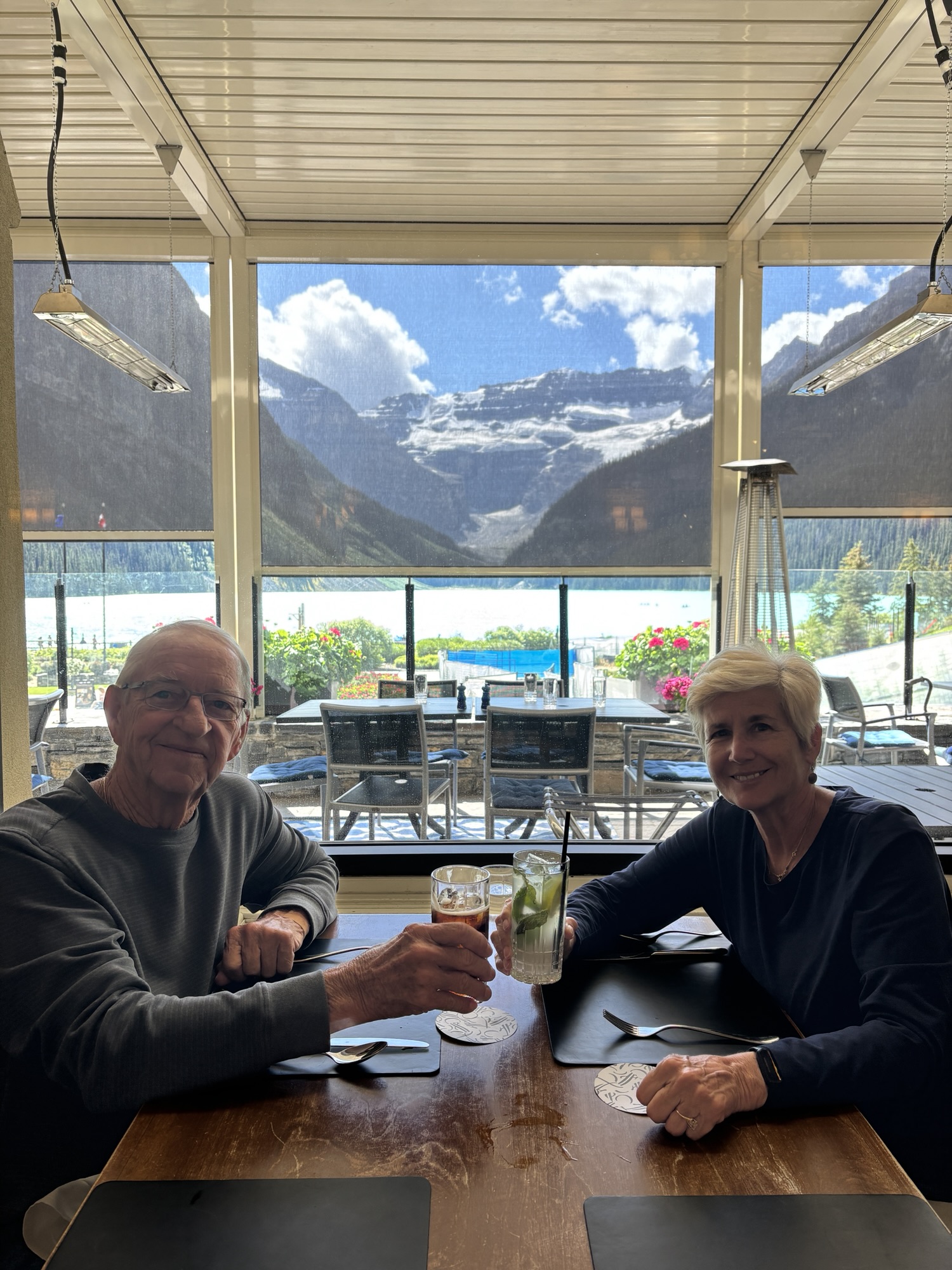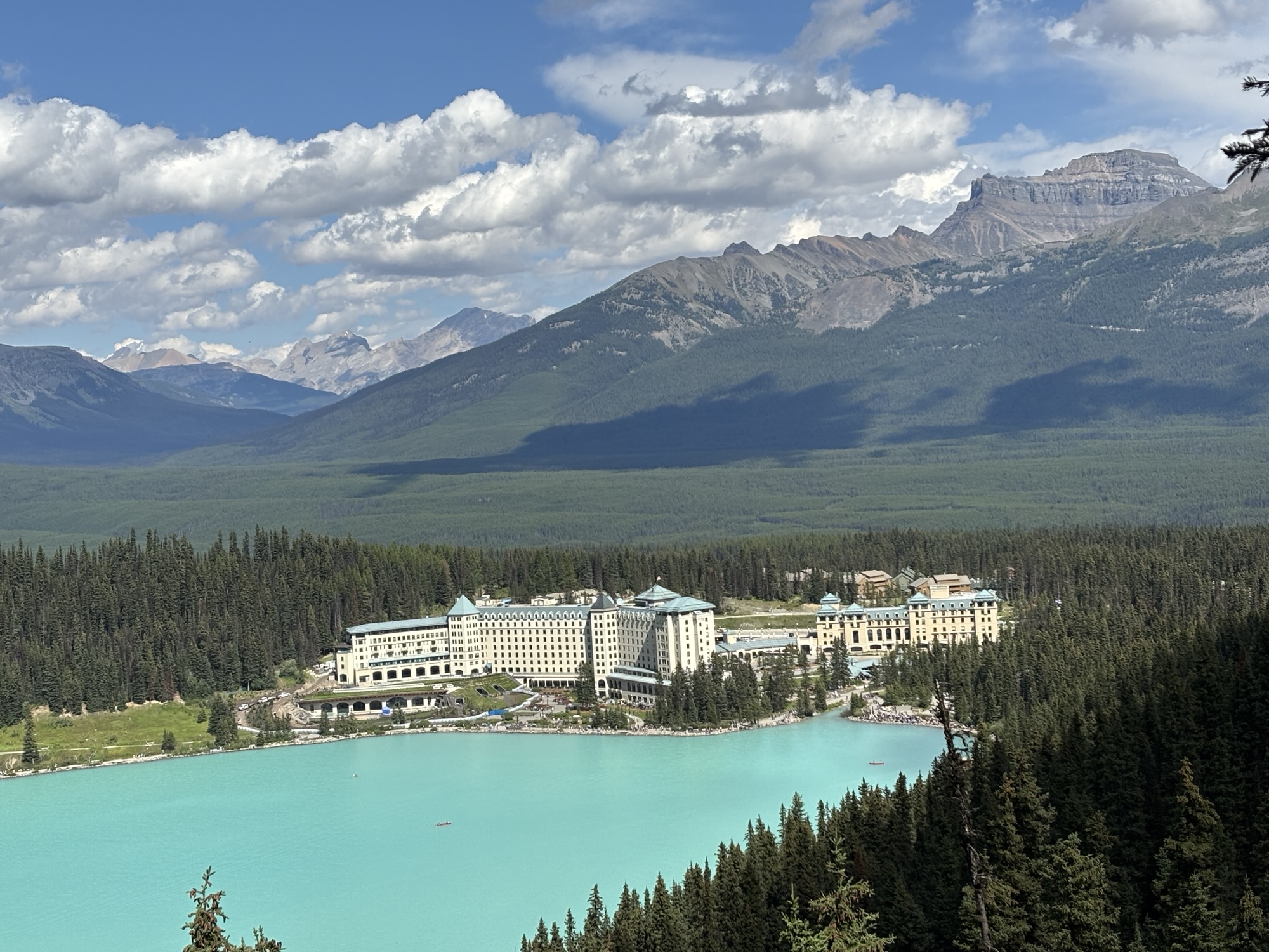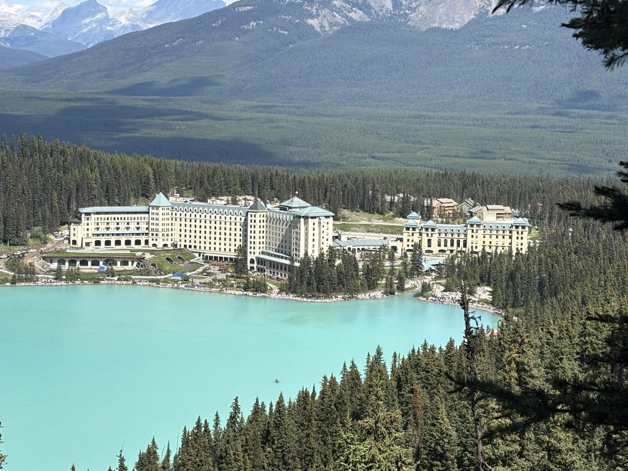 The next day, since we had reservations for a late lunch/early dinner, we had some time to get caught up on RV stuff, and then work our way back to the bus, and go directly to Lake Louise. We had about 2 hours before our reservation, so we took the time to hike up to the Fairview Lookout. The hike was listed as moderate, but it had an elevation gain of about 400 ft that seemed almost straight up! But with the added altitude above the lake, the view was stunning or should I say “majestic”! We spent some time talking to other hikers and then we headed down to the hotel ready for a great meal.