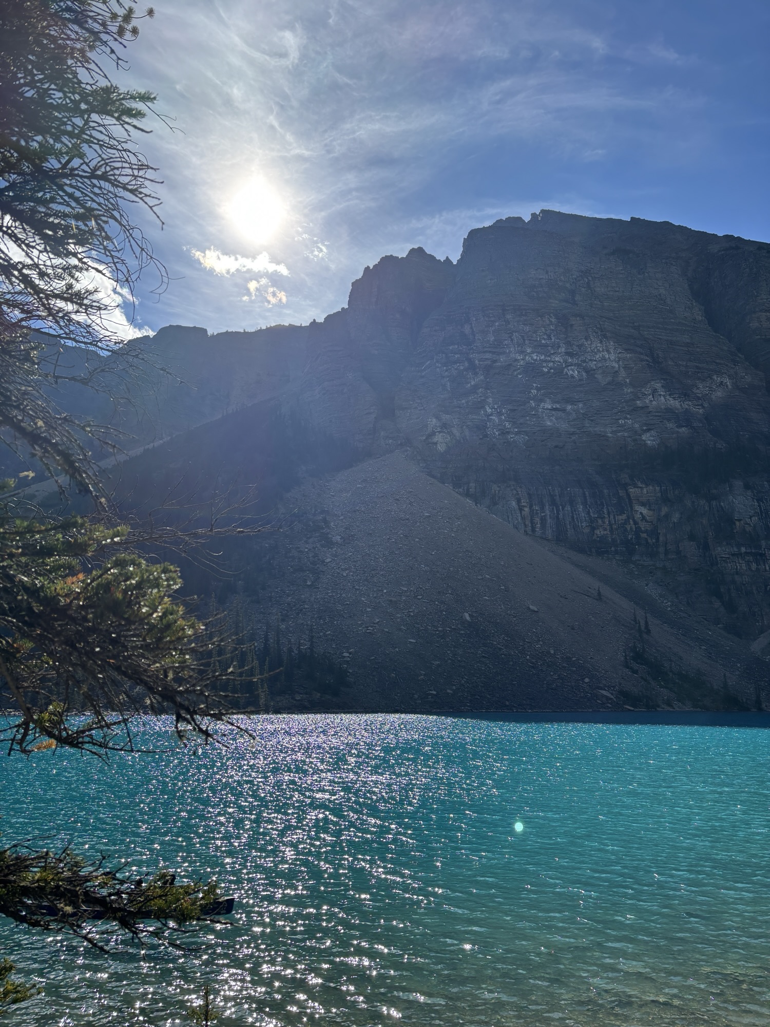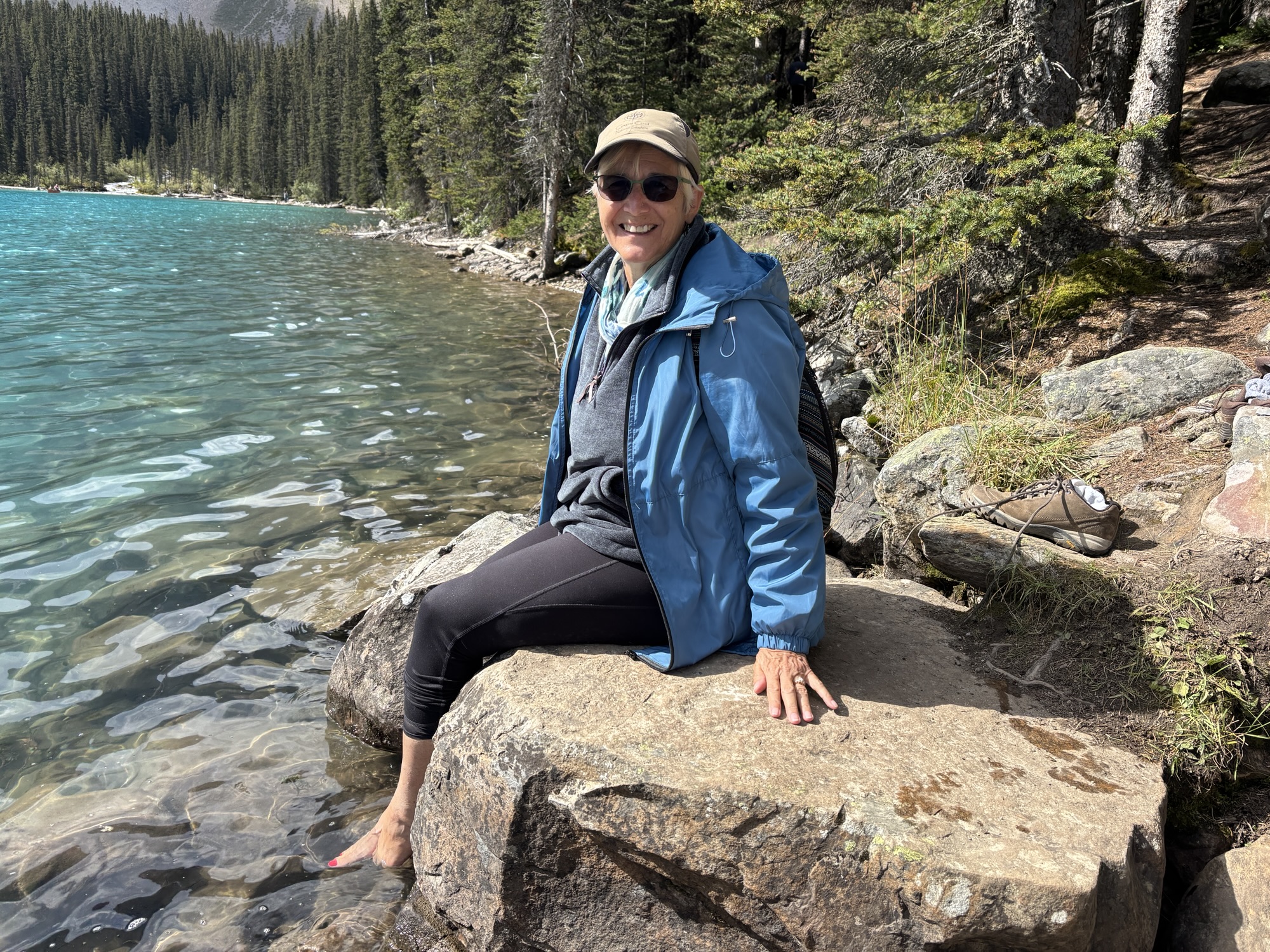 Anyway, at Lake Moraine there is a nice hike along the shore of the lake. The further you get from the entrance, the less crowded it gets, and you can enjoy the view and have a more relaxed hike. People along the way would offer to take your picture and we would do the same. The lake is beautiful and the water a clear, dark, azure blue! And cold as we found out when we decided to stick our toes in for a few seconds! The sun came out and the water sparkled. At the turnaround, you can see the stream feeding into the lake. Back near the entrance, we did a short hike up to the Rock Pile (with a bunch of other people) to get a different view. All very majestic! More photos to see!