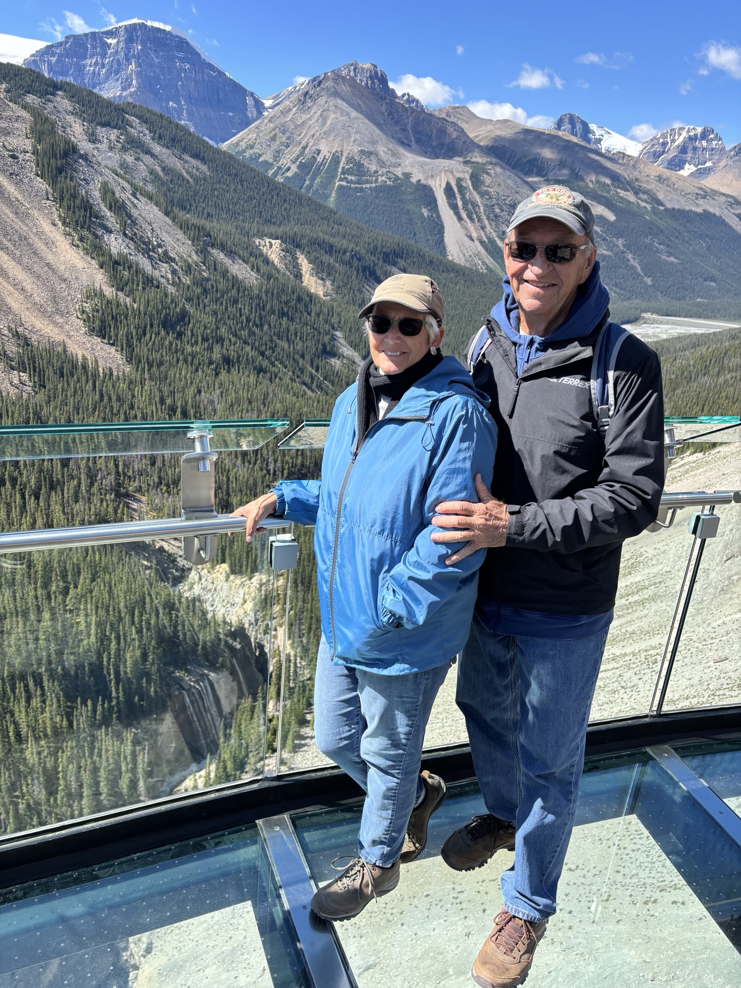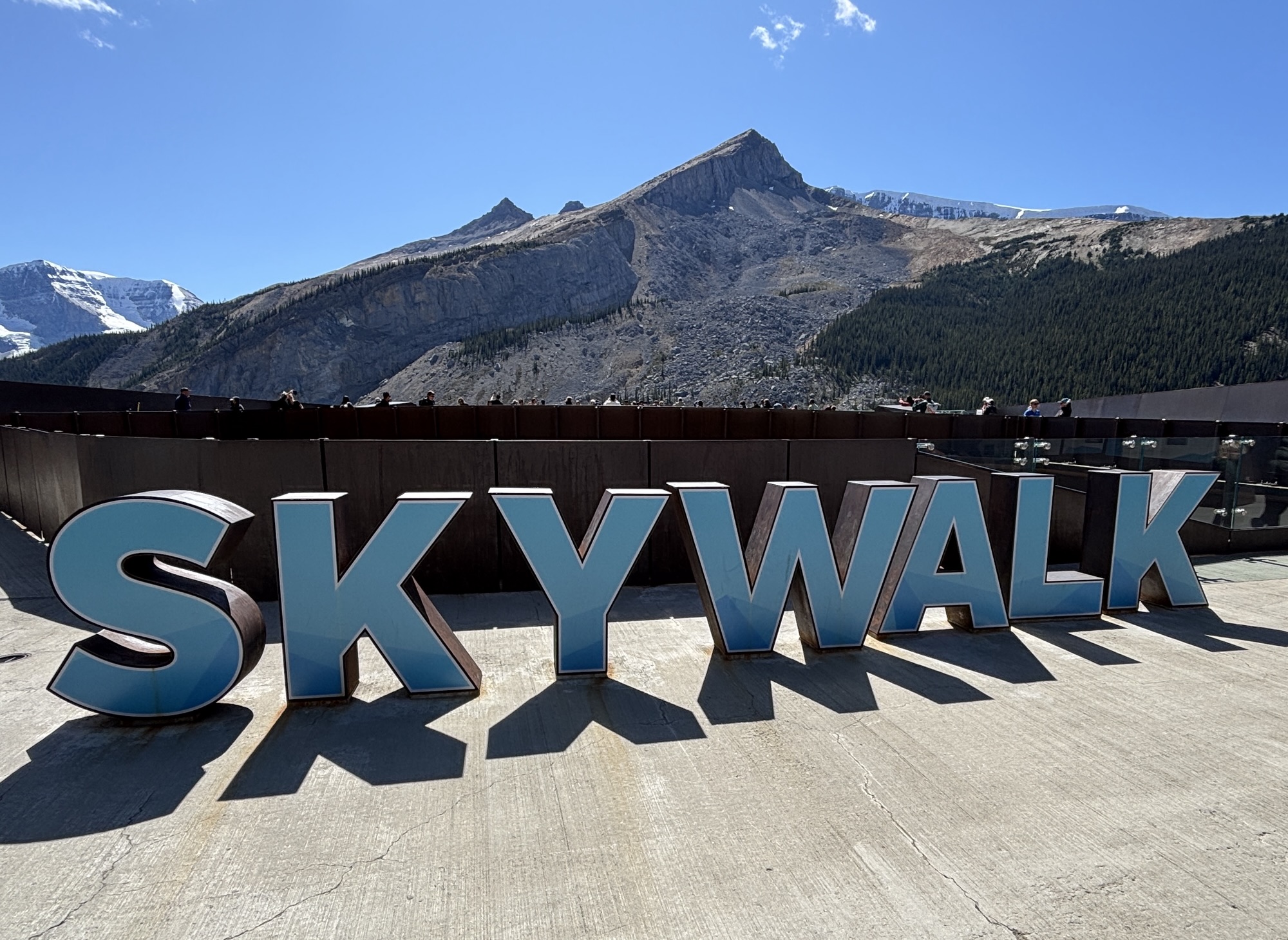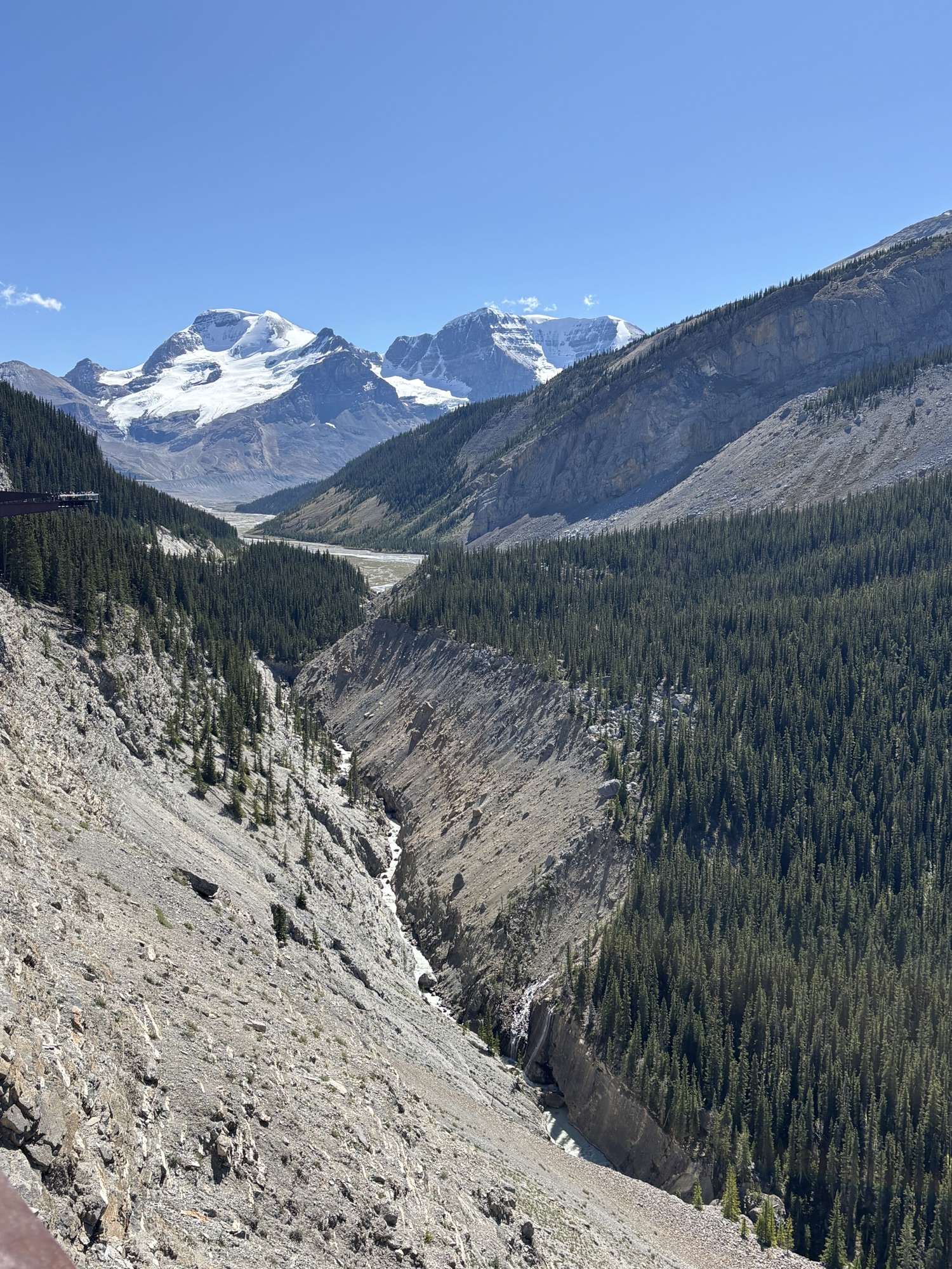 Back at the “terminal”, we transferred to another bus to go a few miles on the highway to the Icefields Skywalk. This is a viewing platform with a glass floor that is supported out over the canyon. Yes, you are looking down over 900 feet through clear glass. And there are a lot of people on the glass looking down at the same time. Needless to say, the engineering is very strong, and you are reminded of that several times! You are looking down into and across the Sunwapta Valley at the Sunwapta River with waterfalls and the “likelihood” to see mountain goats and other animals. And you have unlimited time to stay. When ready, you go get on the next bus and go back to the visitor center and parking.