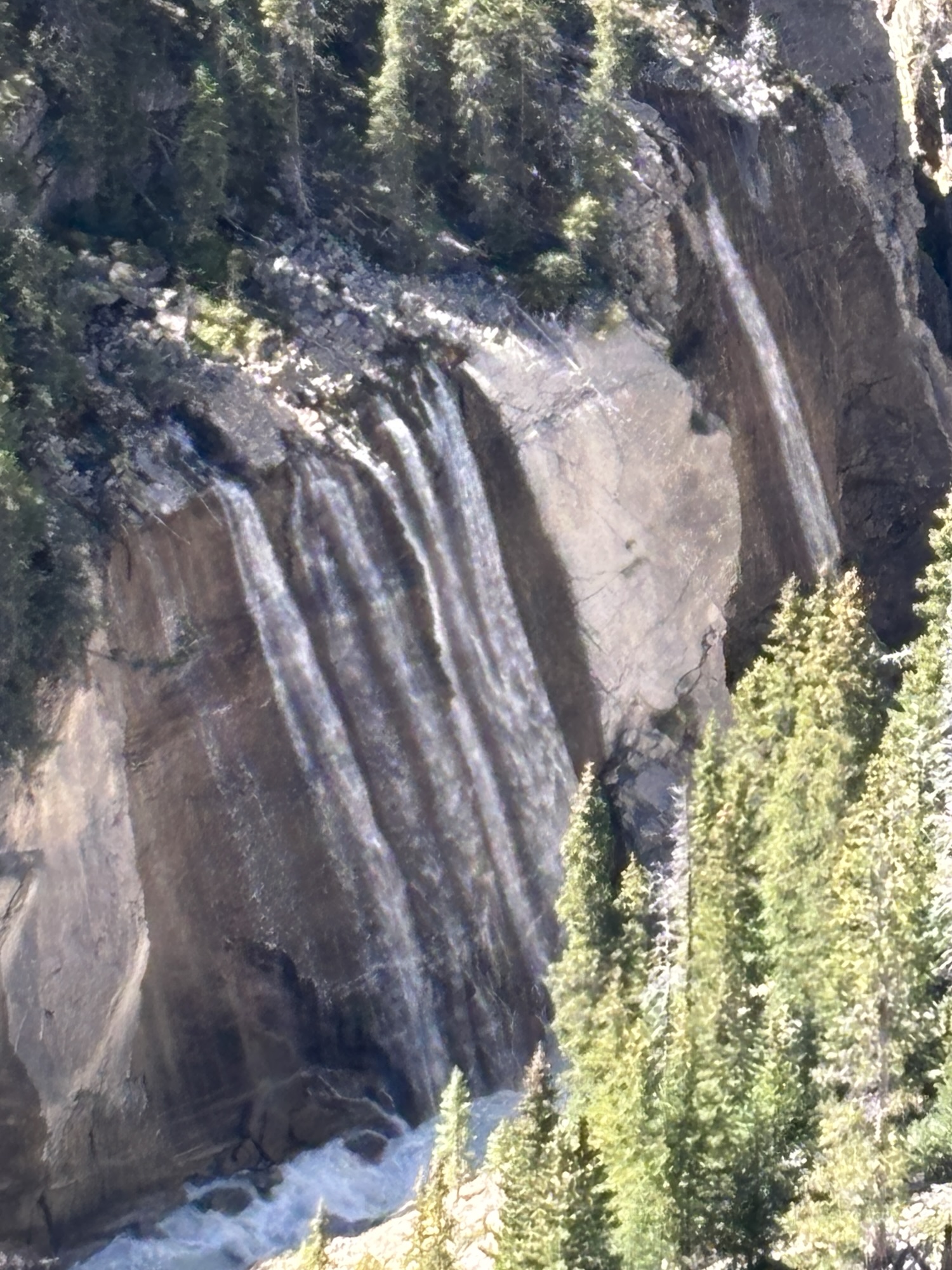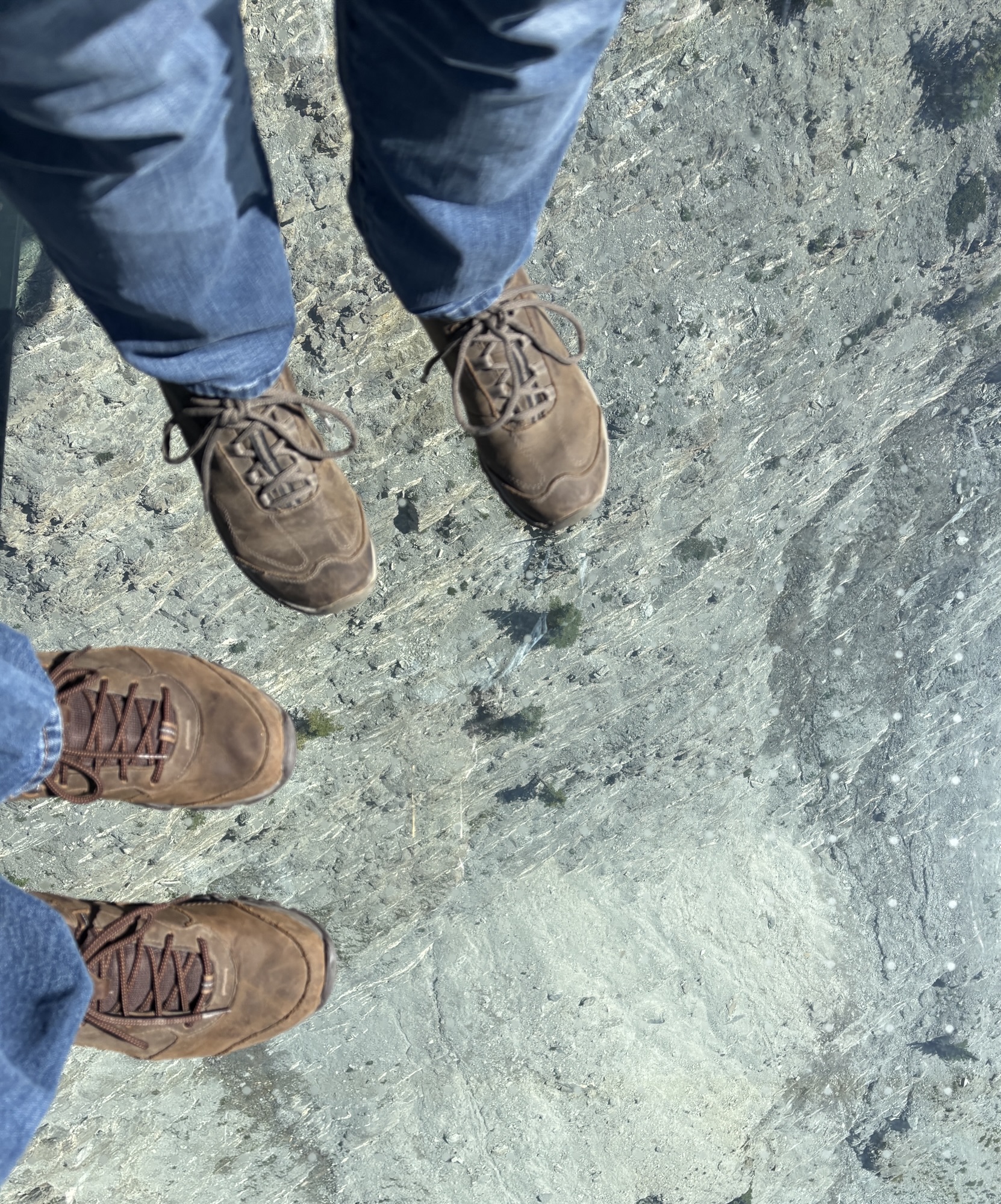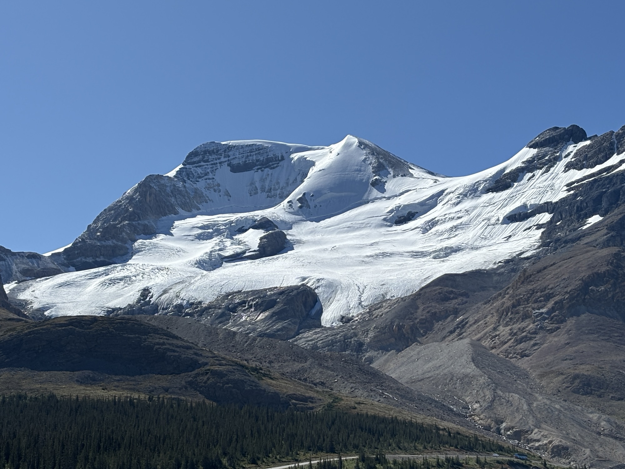 Back at the “terminal”, we transferred to another bus to go a few miles on the highway to the Icefields Skywalk. This is a viewing platform with a glass floor that is supported out over the canyon. Yes, you are looking down over 900 feet through clear glass. And there are a lot of people on the glass looking down at the same time. Needless to say, the engineering is very strong, and you are reminded of that several times! You are looking down into and across the Sunwapta Valley at the Sunwapta River with waterfalls and the “likelihood” to see mountain goats and other animals. And you have unlimited time to stay. When ready, you go get on the next bus and go back to the visitor center and parking.
