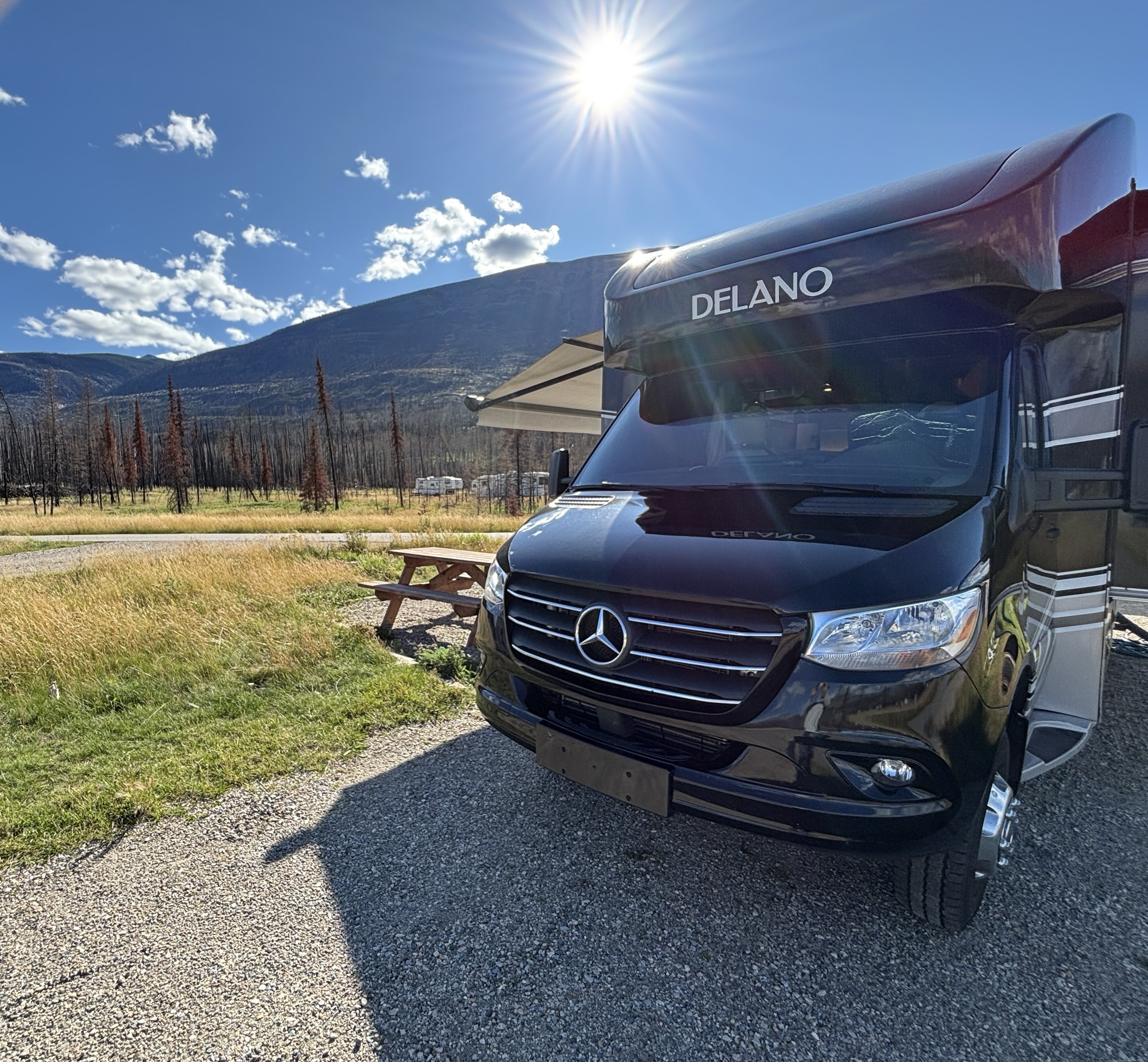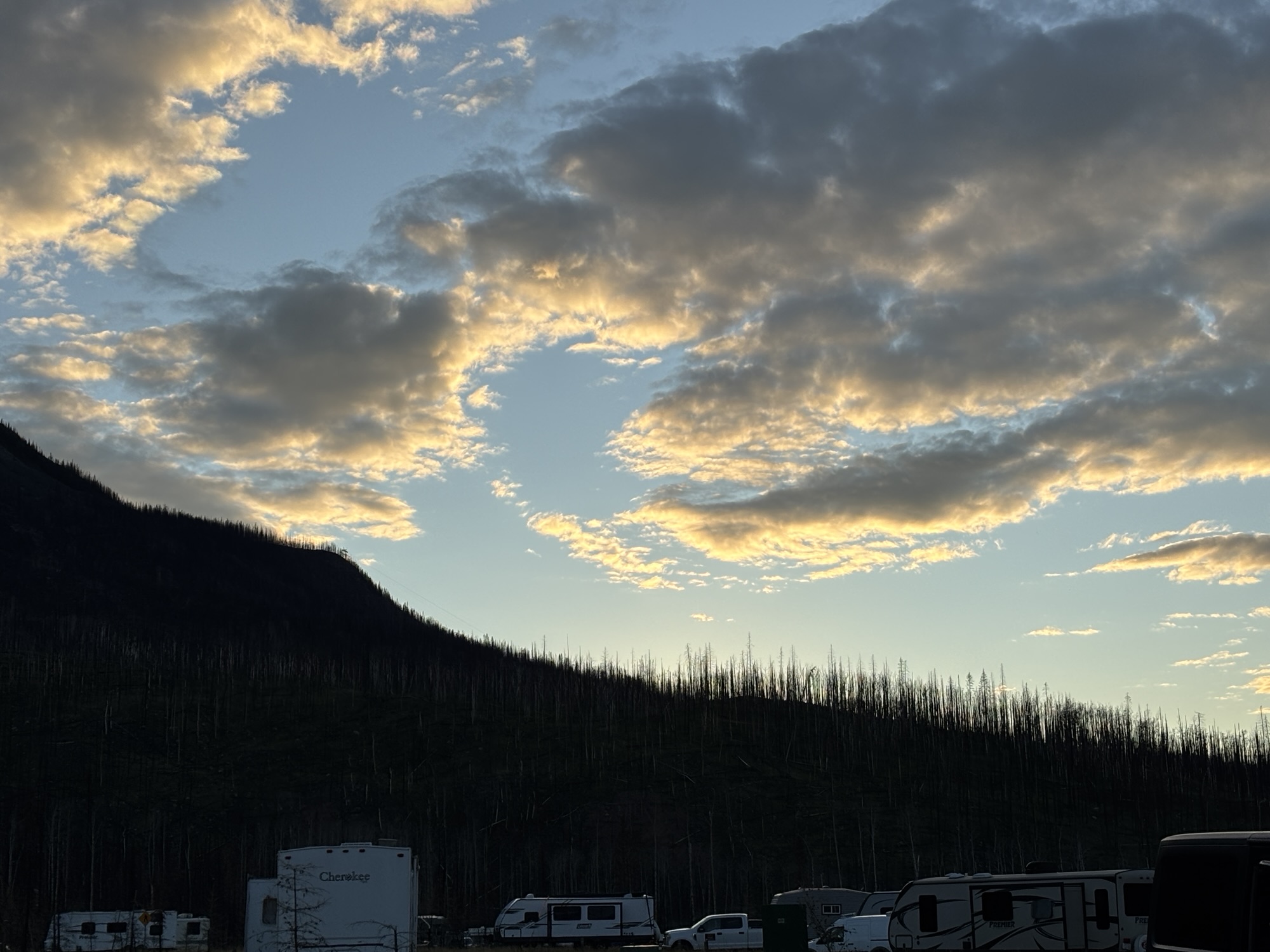 The RV park was unique as the RV sites were all pull-through and in a circle. So, imagine a small road around the outside of the circle to pull in and a second around the inside so you can pull out. That left a small circle in the center that was unused. And the “landscaping” for the entire park was like a grassland-like prairie! Unfortunately, most of the trees were burned.