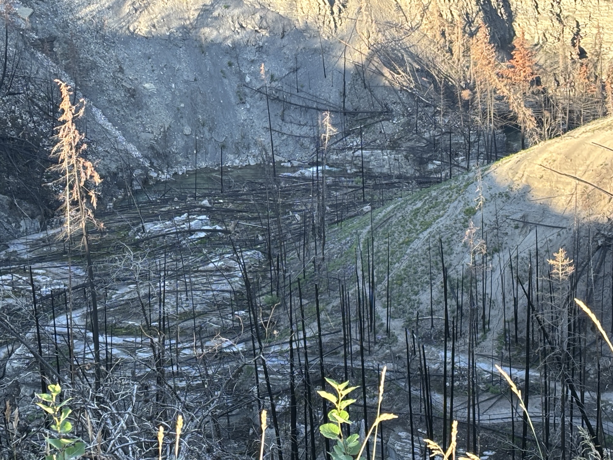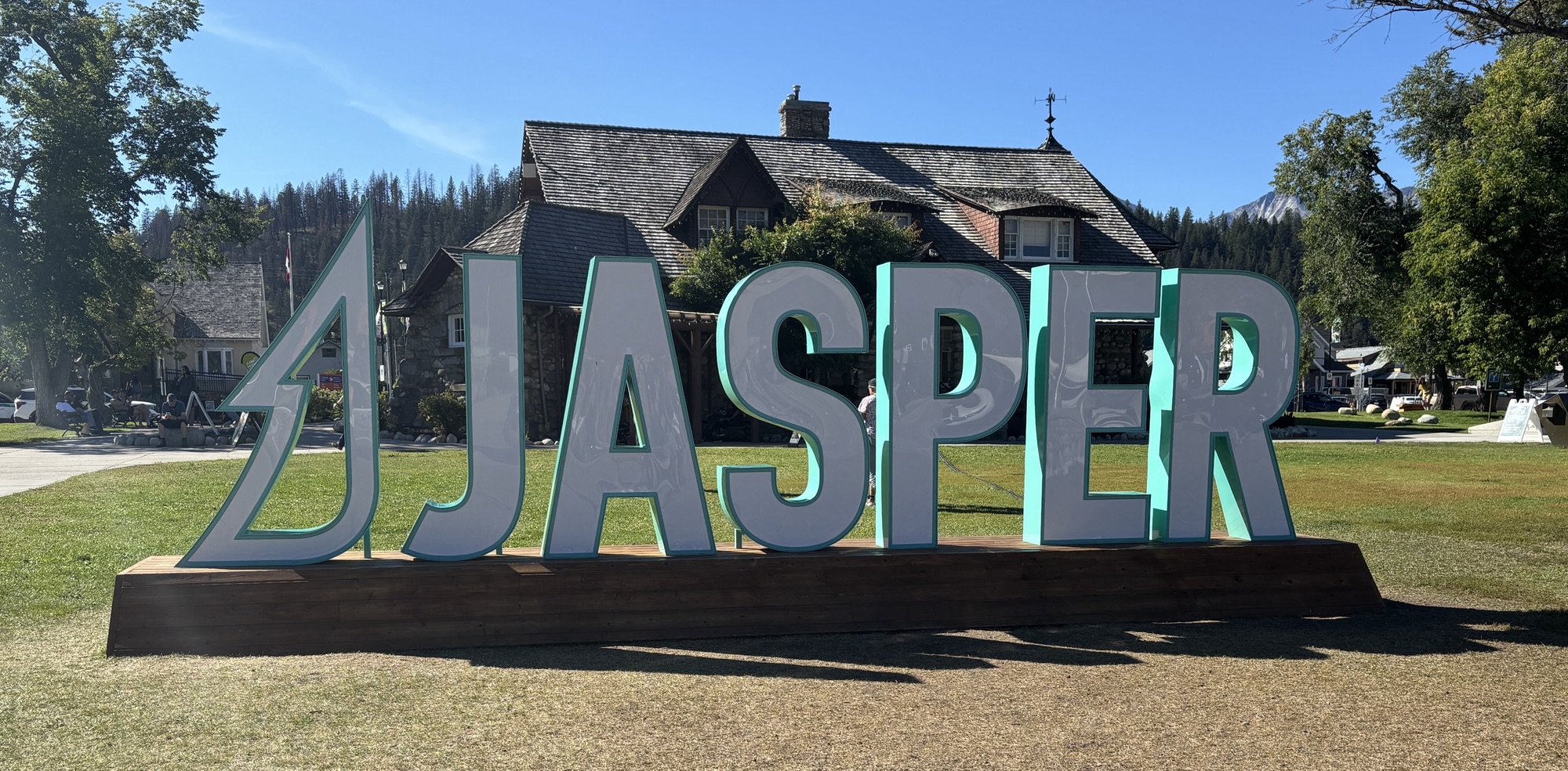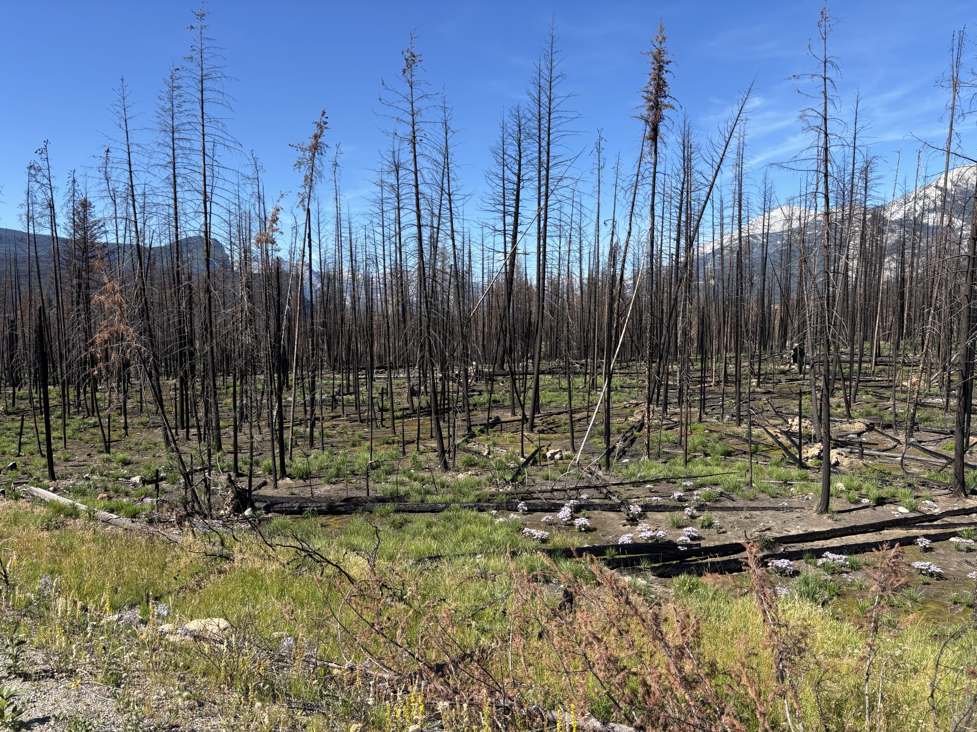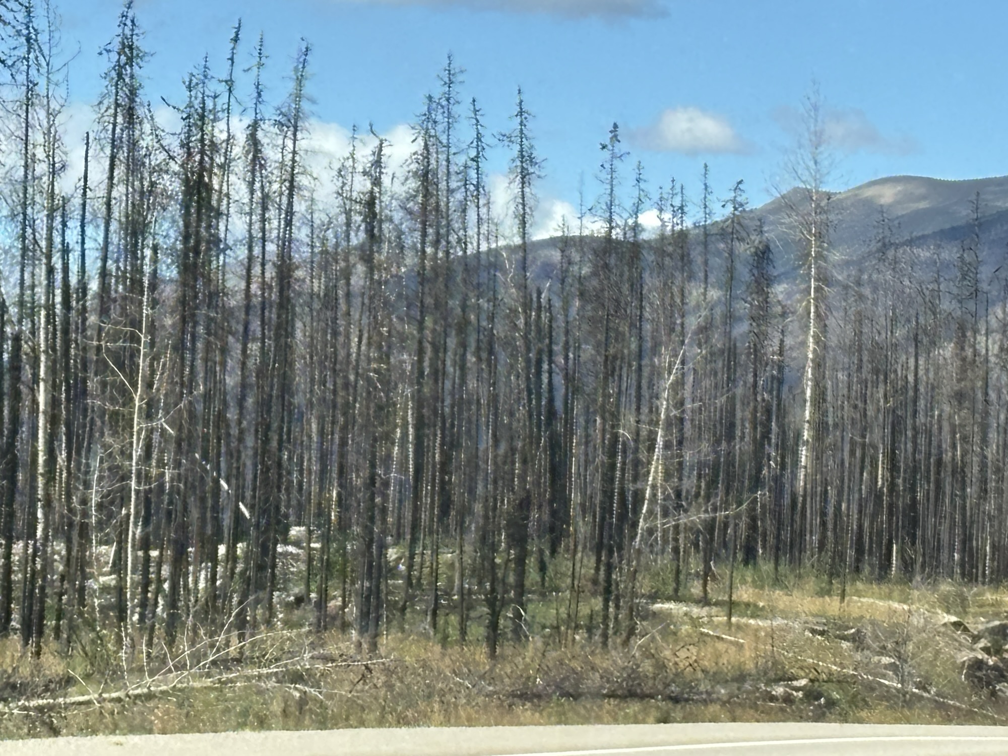 Back in the RV, we headed on to Jasper. You may remember that Jasper was in the news last year due to the massive forest fire that swept the area. About 20 miles south of town, we started seeing the effects of the fire with complete hillsides of burnt trees! It is hard to describe. And such a sad picture. As we got closer to town, it just got worse.