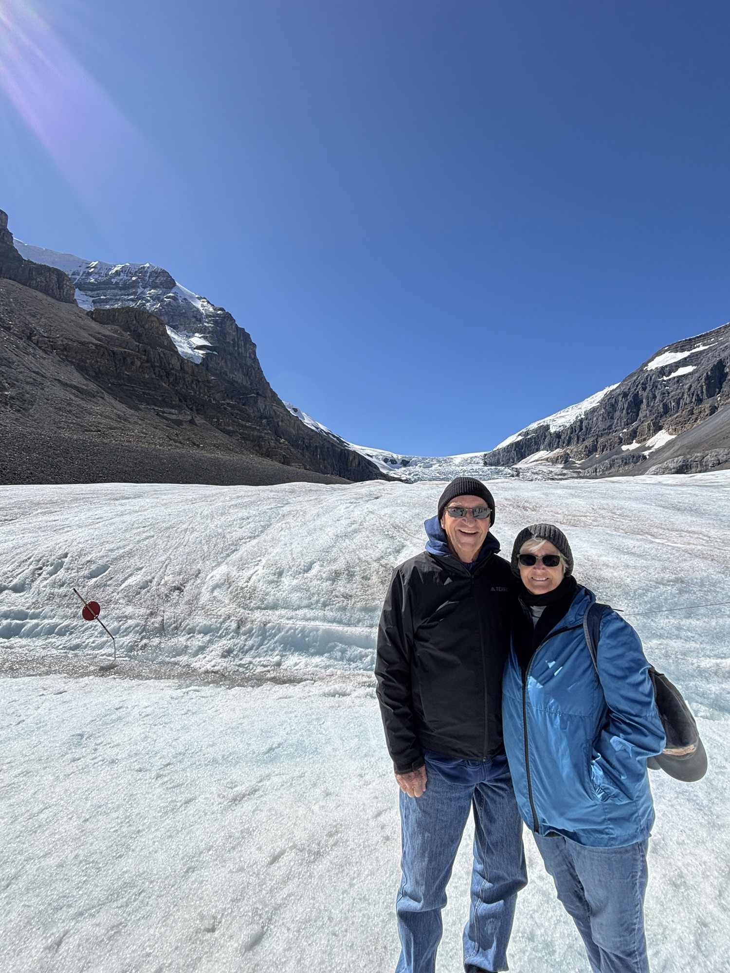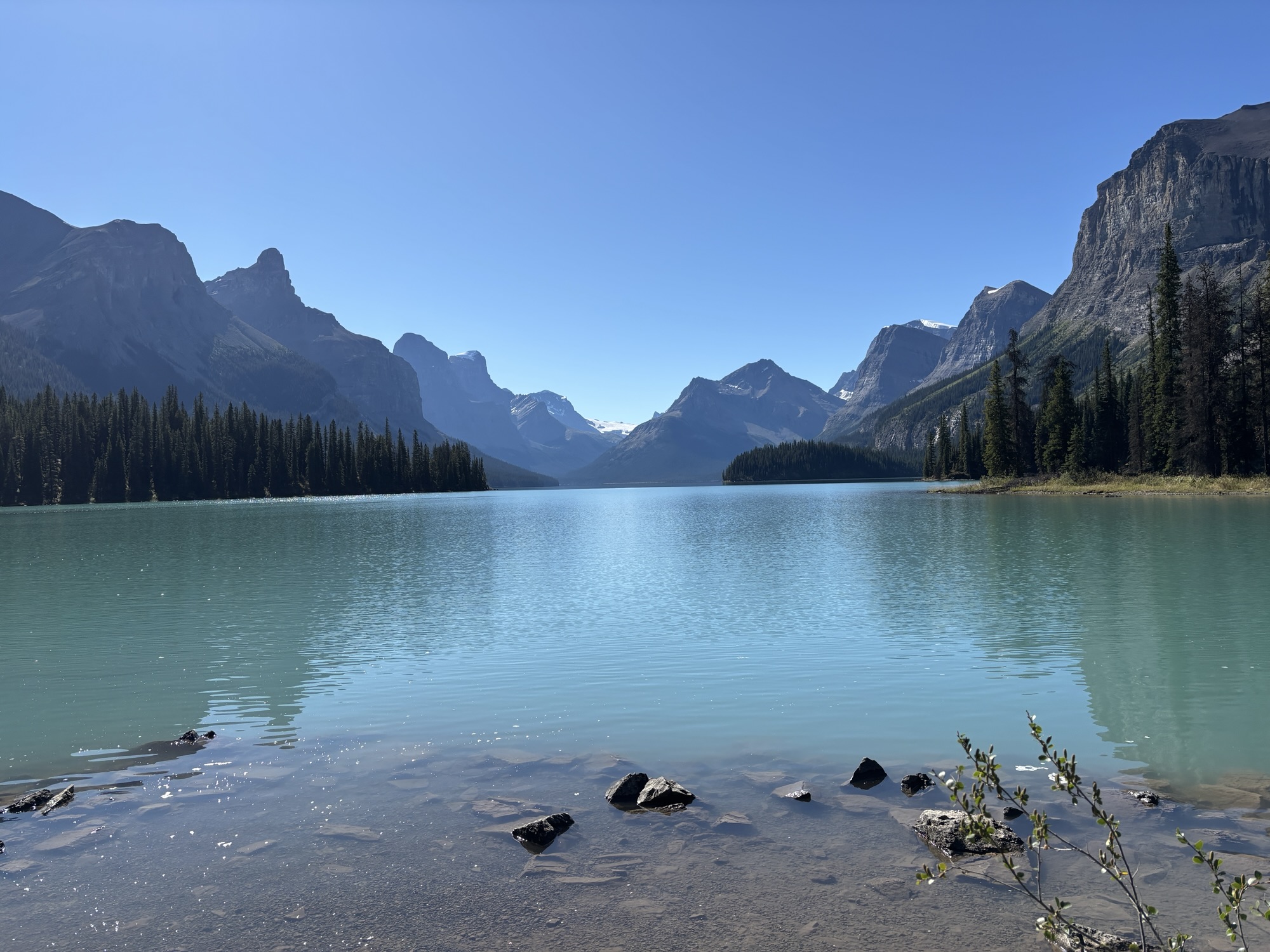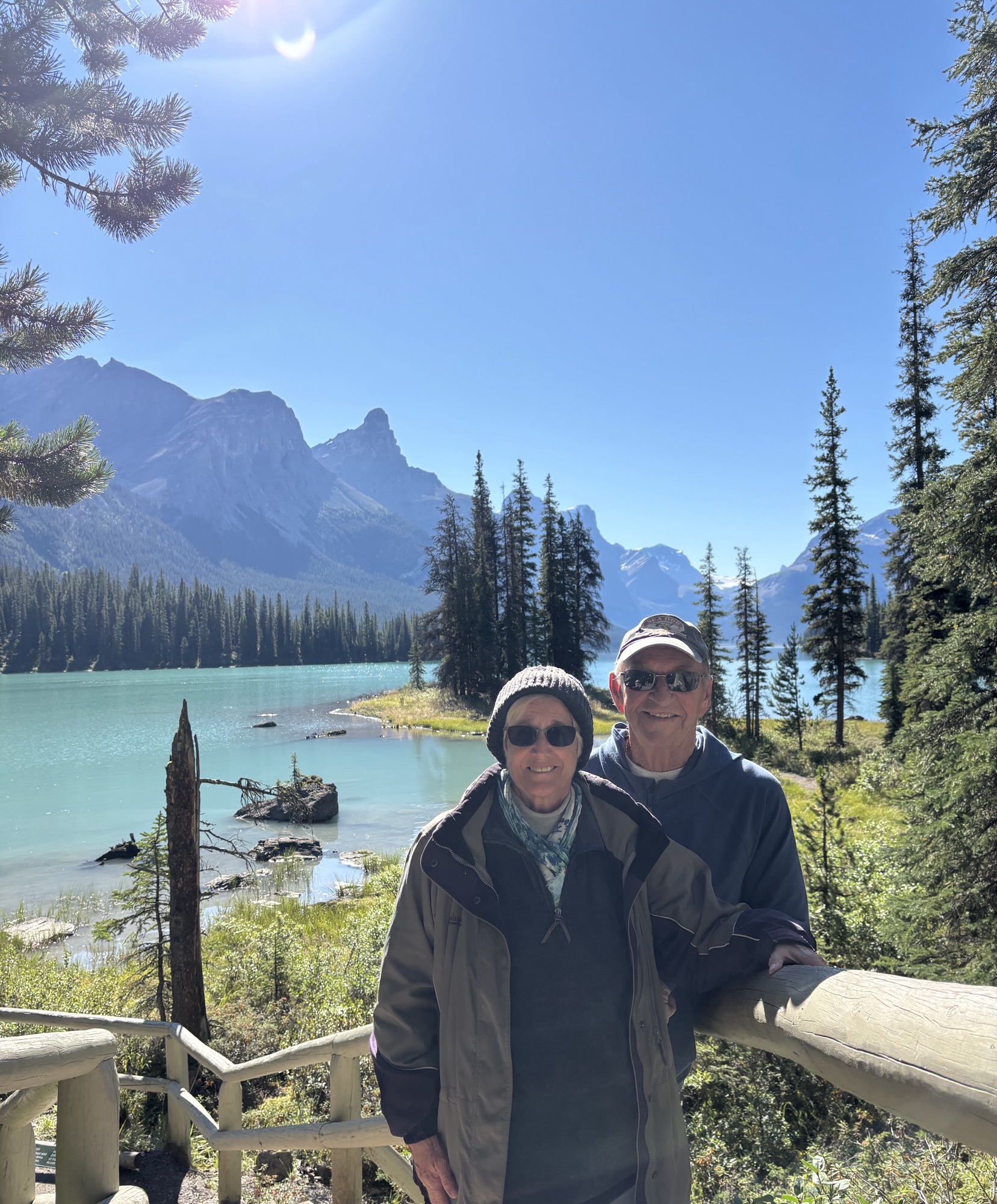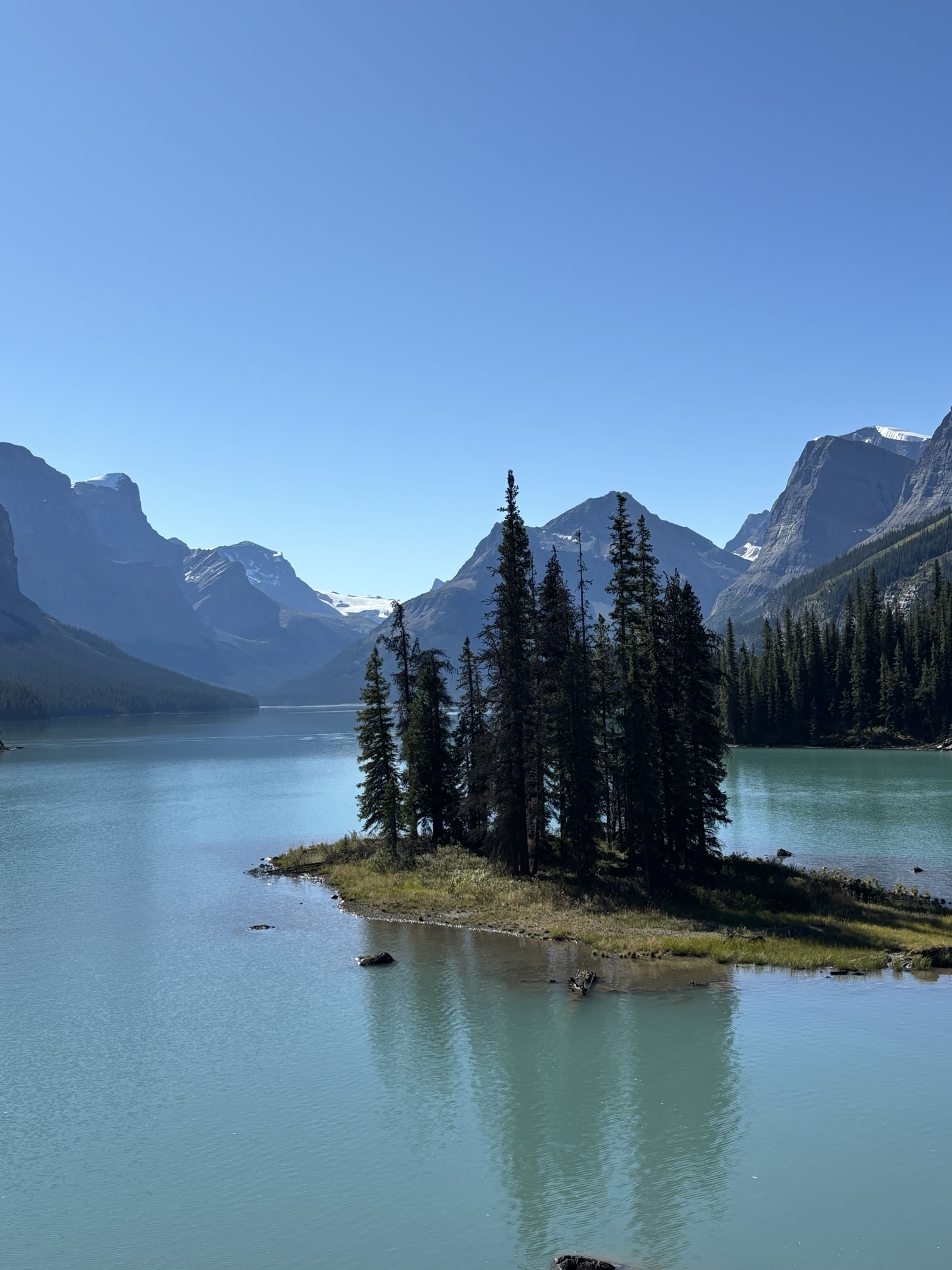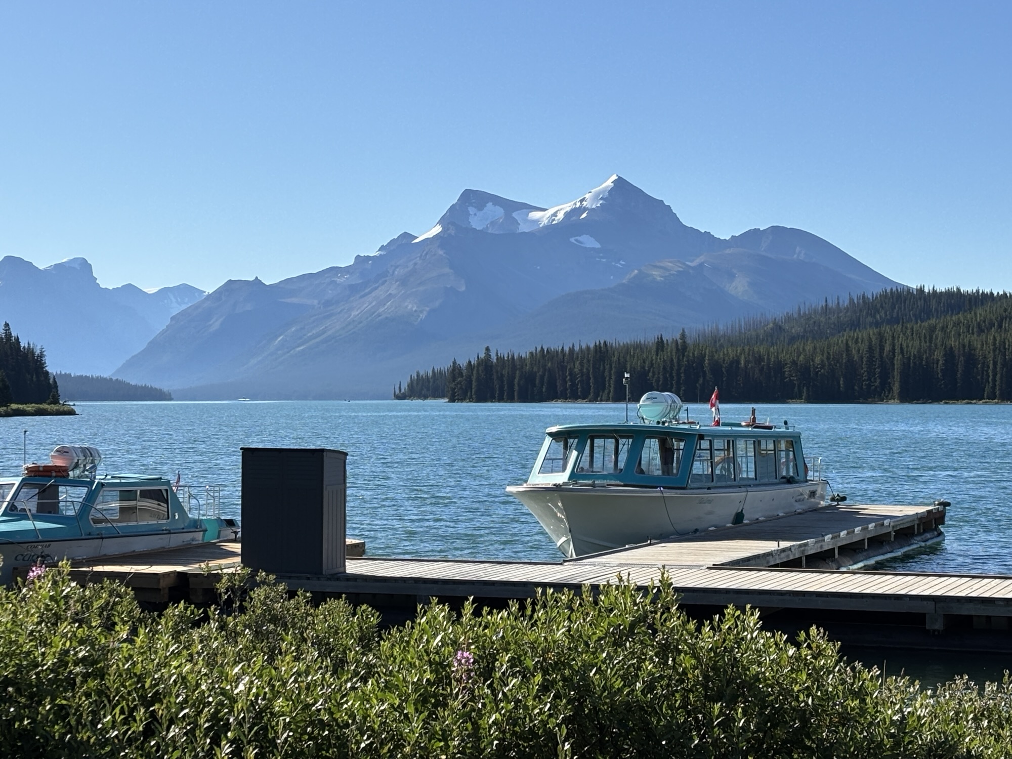 The lake is 14 miles long, a mile wide at the widest, and can reach over 300 ft deep. Its claim to fame is as the largest glacier fed lake in Canada and with multiple glaciers feeding it. The tour goes about halfway up the lake to Spirit Island (or since the lake was a little low, it was actually Spirit Peninsula!). The tour company was grandfathered in to be allowed to use motorized boats on the lake but limited to only going to the island. The rest of the lake is designated a pristine area. The tour was slow and peaceful, and the views were, again, “majestic”! At the island, we got off the boat for a quick walk around and to take photos. Then again, we headed slowly back to the dock. And just a side note, since the little bay where Spirit Island is located Is not named, we (Kat and I) decided to name it Kat Bay and submit the name to the agency that keeps track of chart changes! Or she can just use it on her tours in the future!