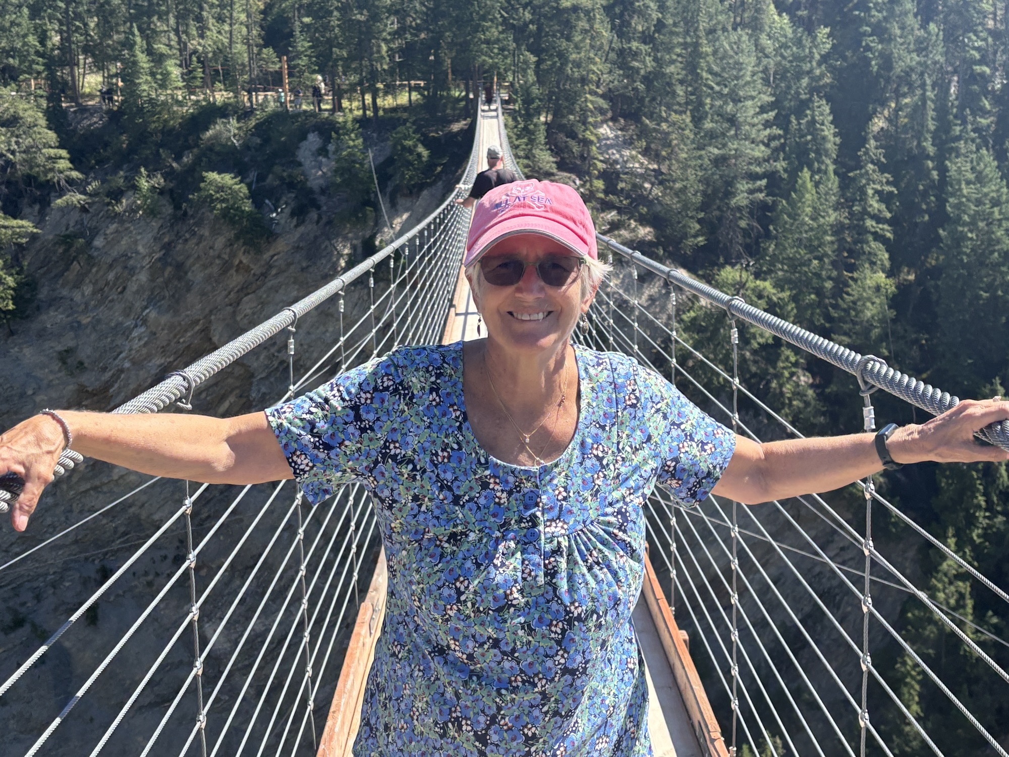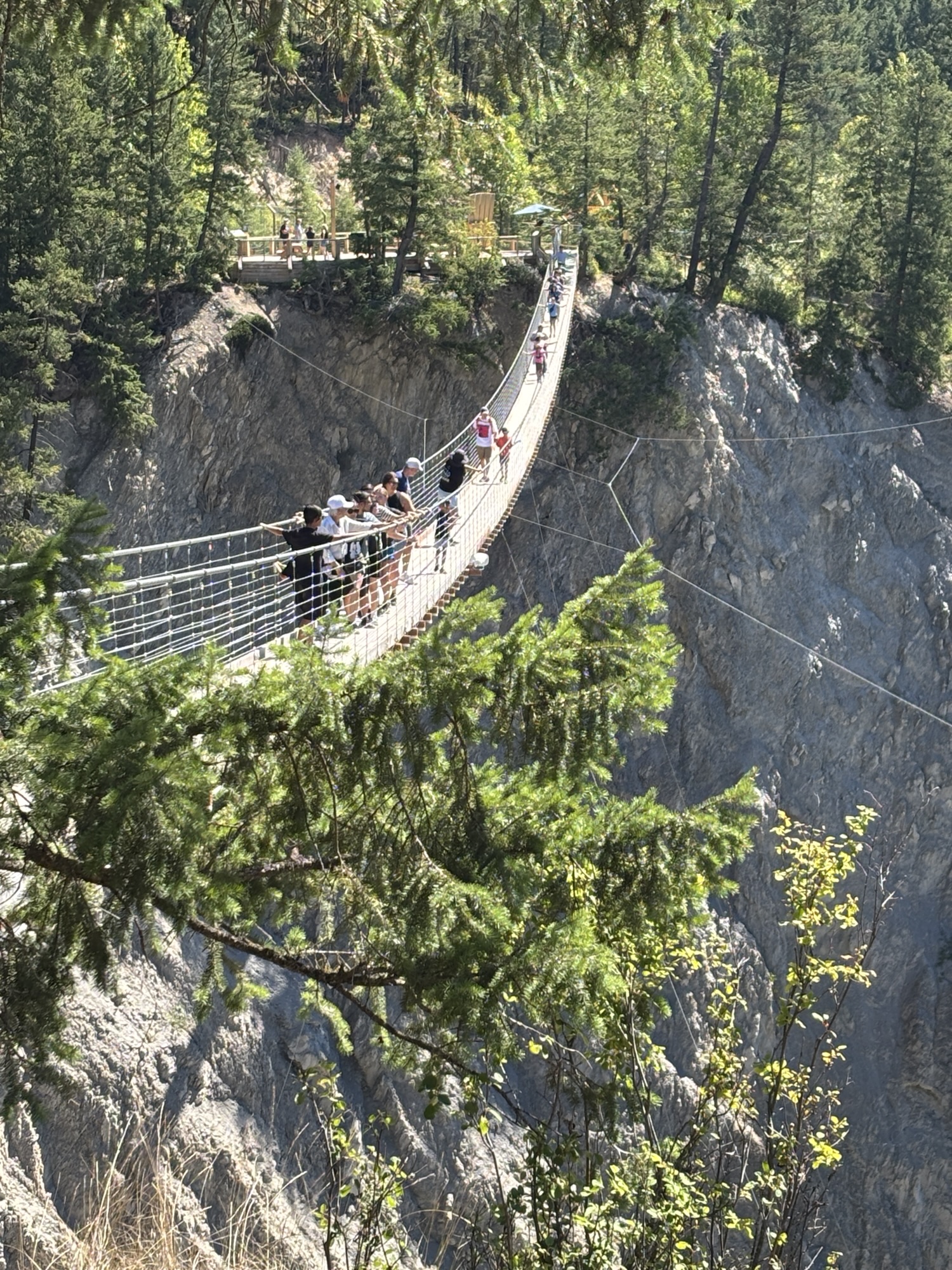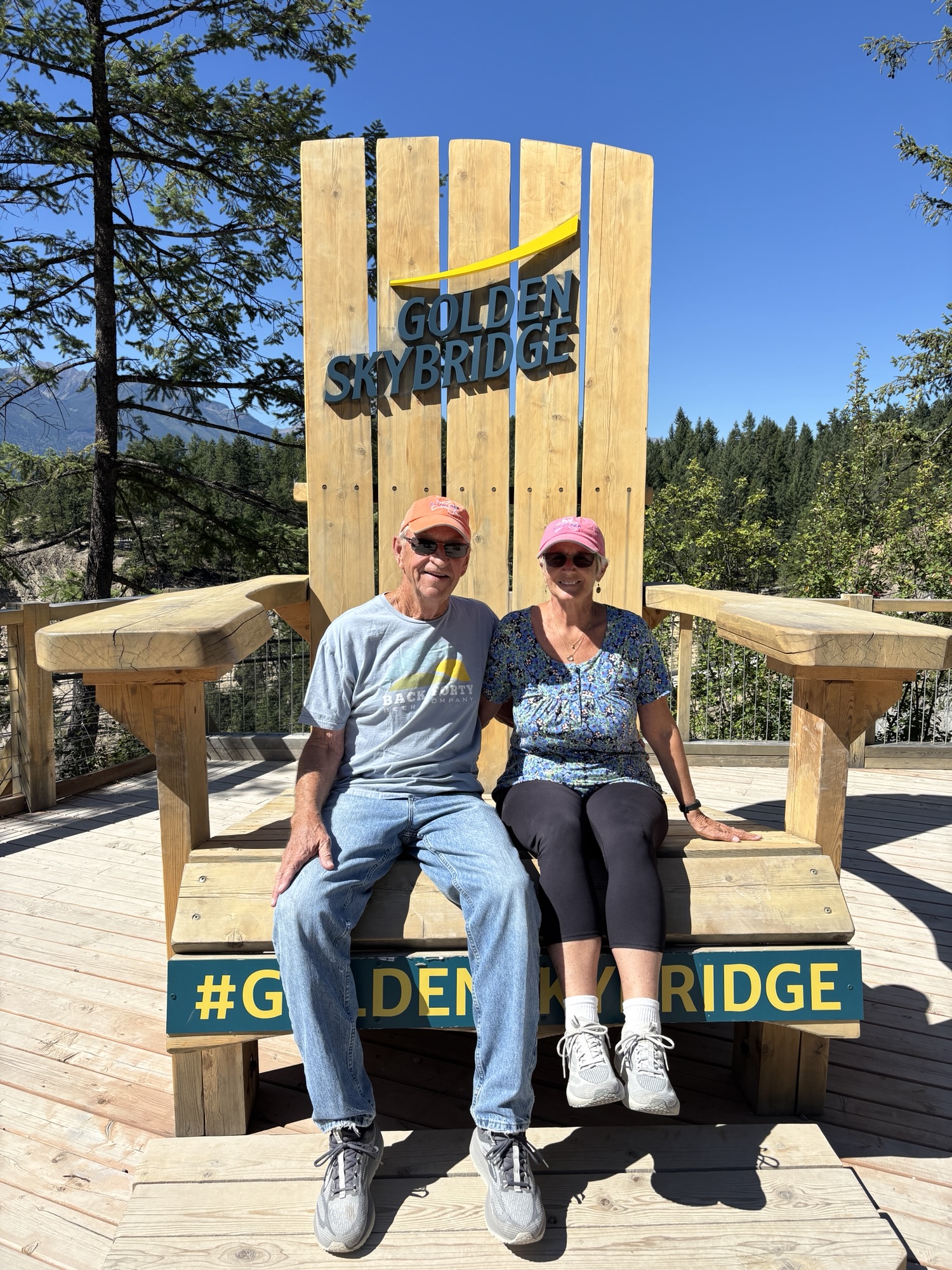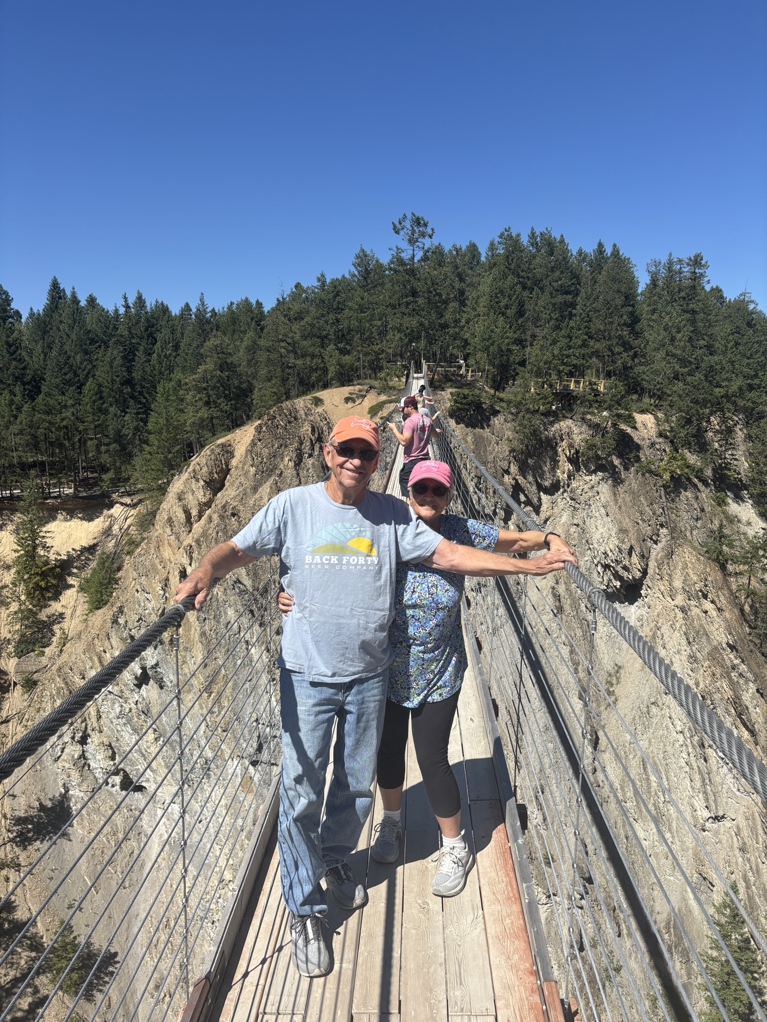 And now we had one more Pursuit Pass ticket to use. After about 50 miles, we arrived in Golden, British Columbia. There is an adventure park with a suspension bridge to use with the tickets! The bridge is about 500 ft long and is suspended over a gorge that is 426 ft deep. Gail was a bit anxious, but we did it and stopped for photos as well! And to get back across, there was a second bridge about as long but lower over the gorge by about 150 ft. We were pros by then and made it back across easily!