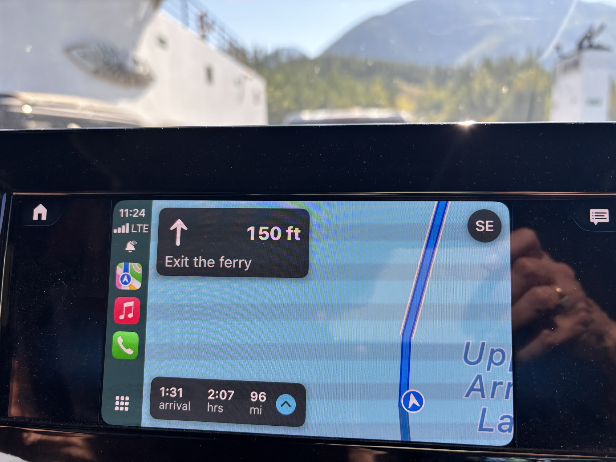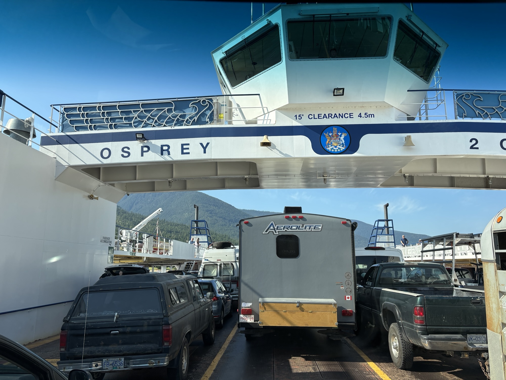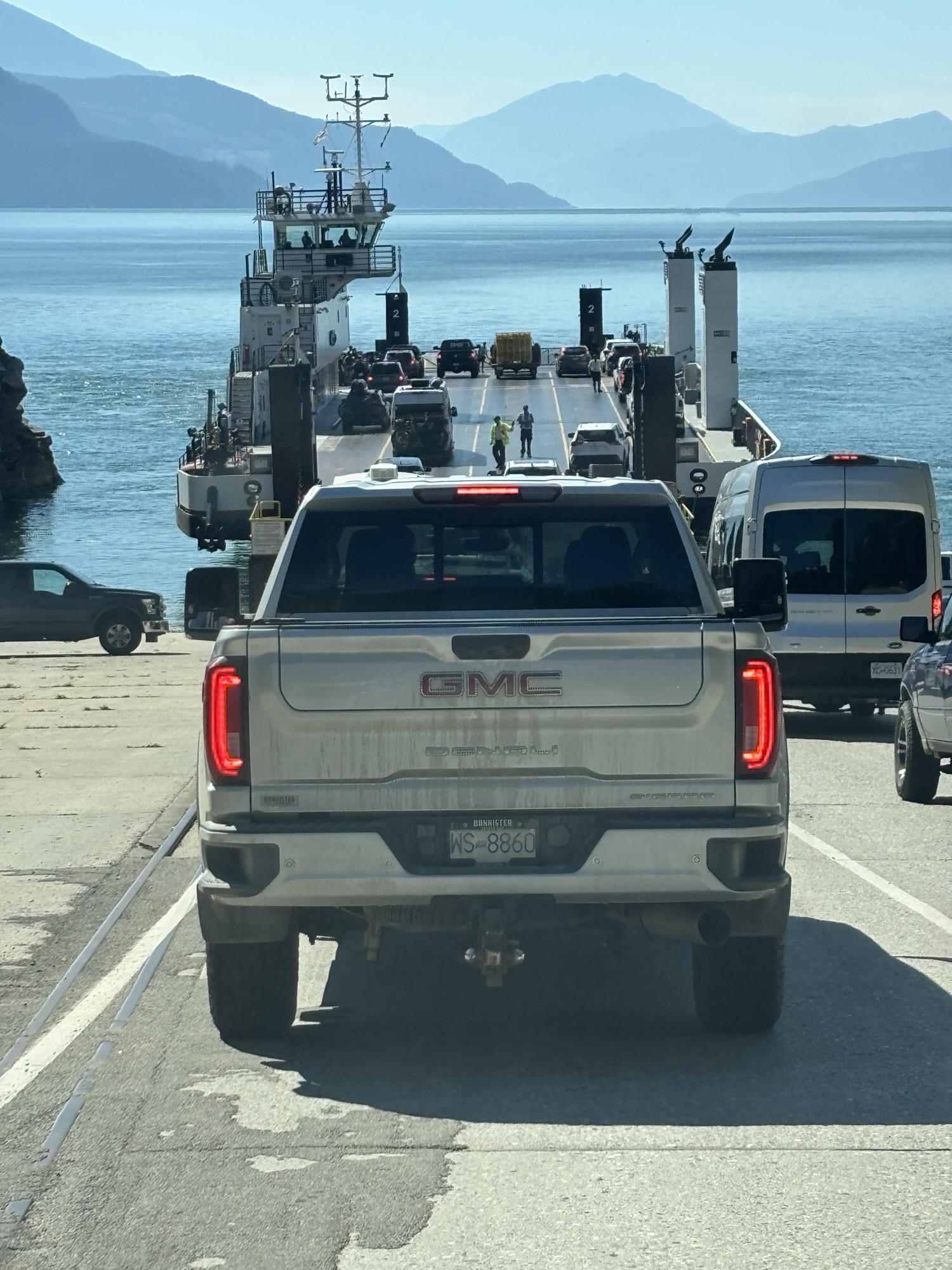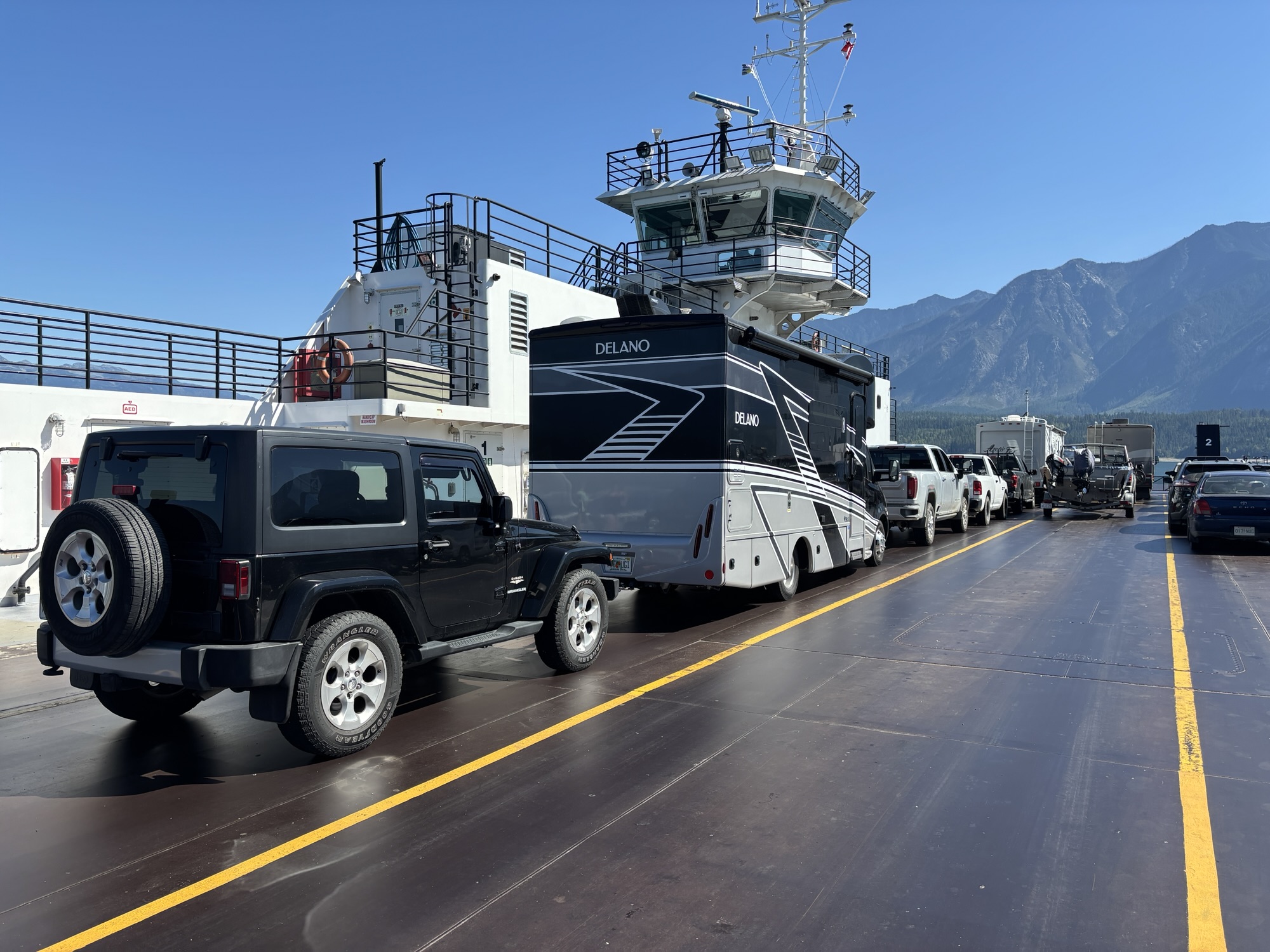 We had one potential hold up a few miles down the road where you must take a ferry across the lake. It’s a free ferry and first come, first served. We got there and were near the end of a long line. But as it loaded, we made it with room to spare! It was a quick crossing, and we were off near the end of the line. So, there was no stress about people wanting to pass us.