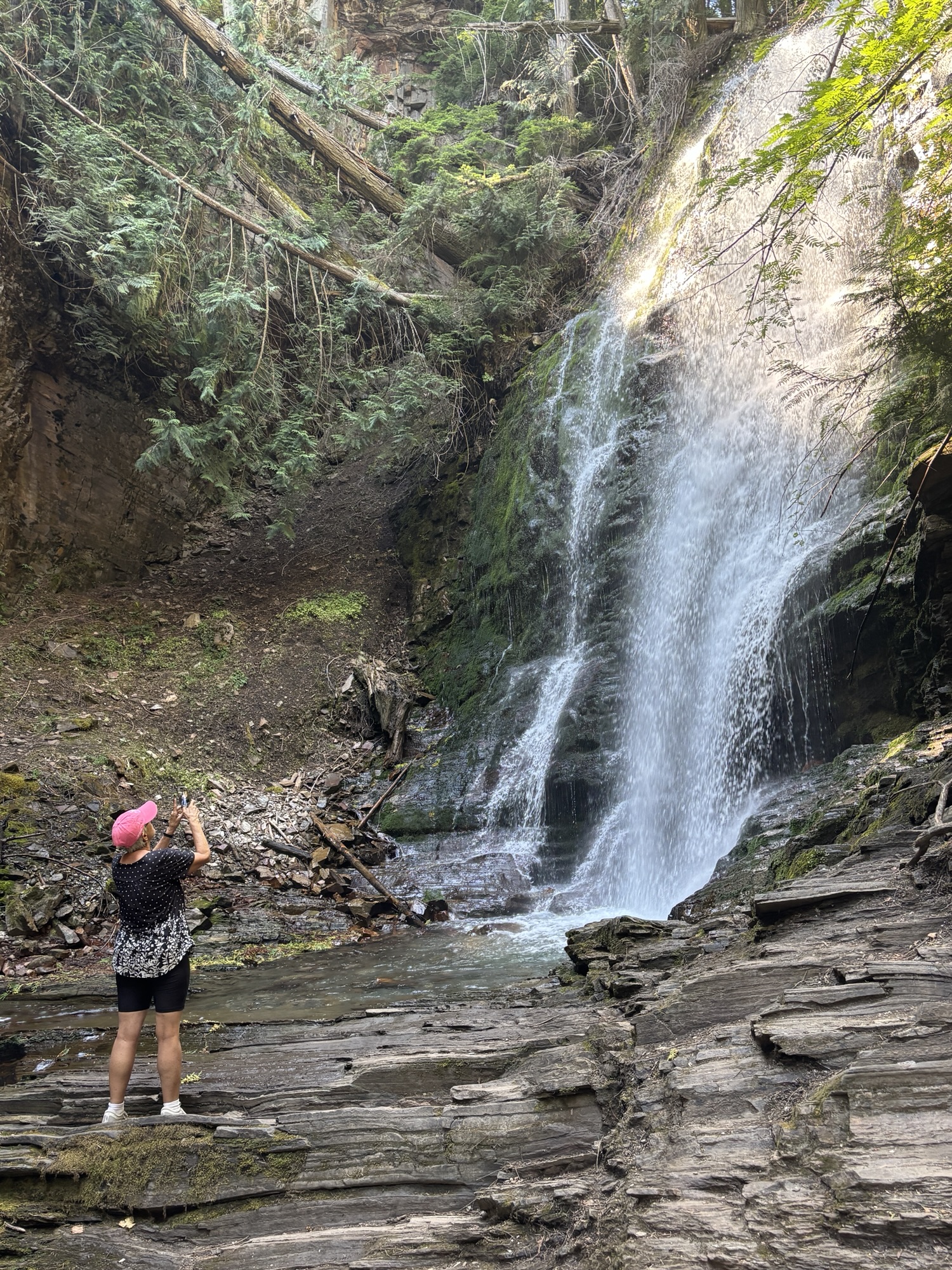 The next day we were to meet with Deb and Kevin at 2:00pm so we had some time to kill. We decided to go back to Fletcher Creek with the proper attire and check it out properly! And it was worth the effort. The falls were impressive, and the trail continued down to the lake picnic area and beach.